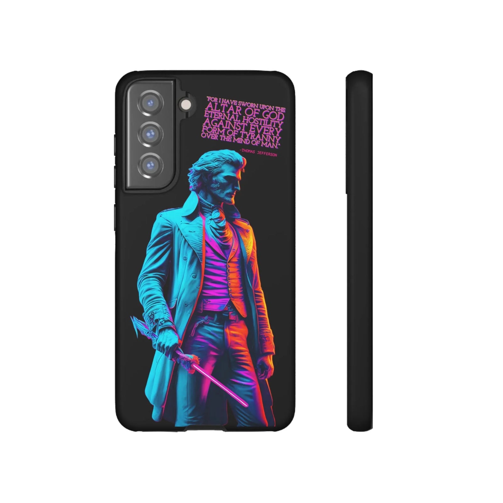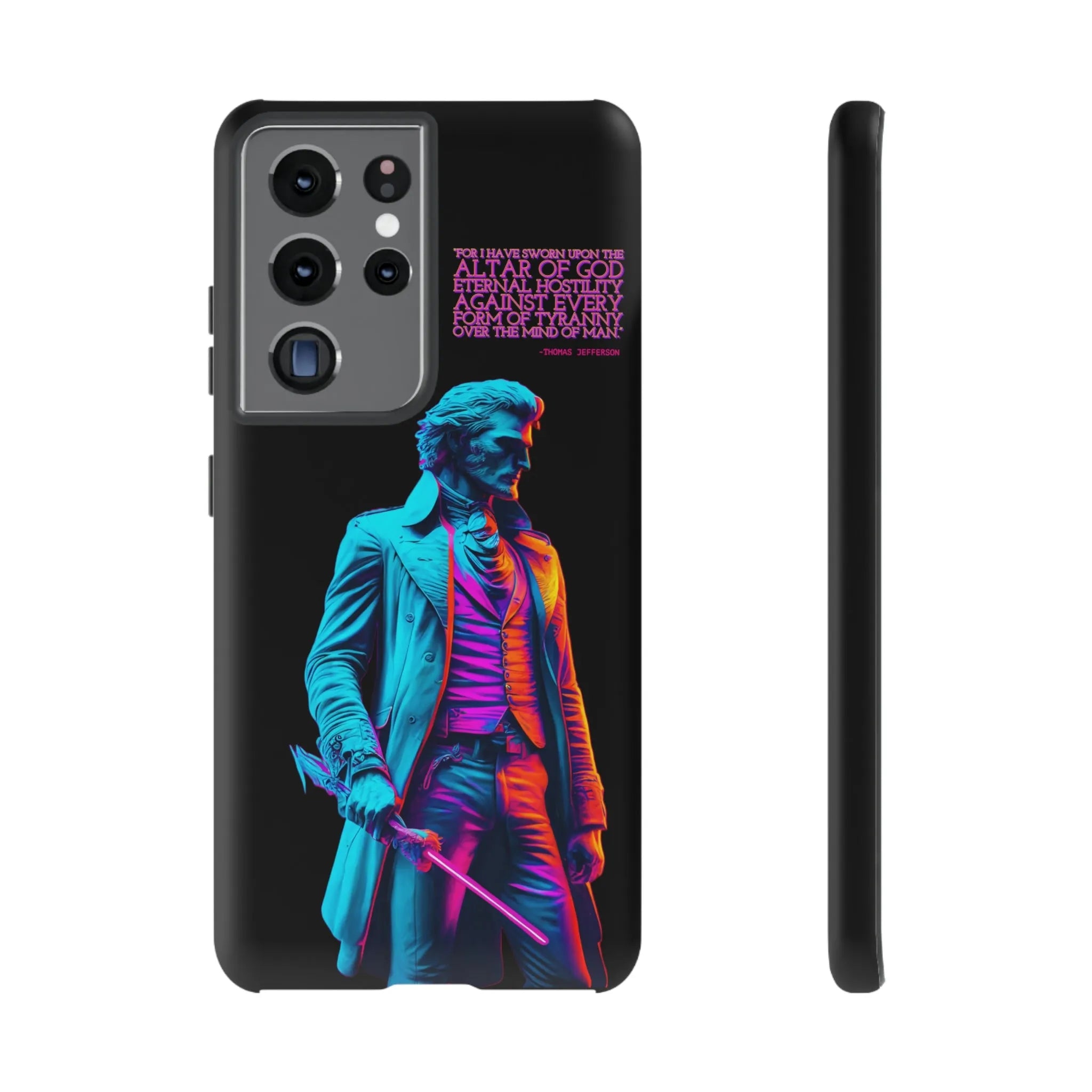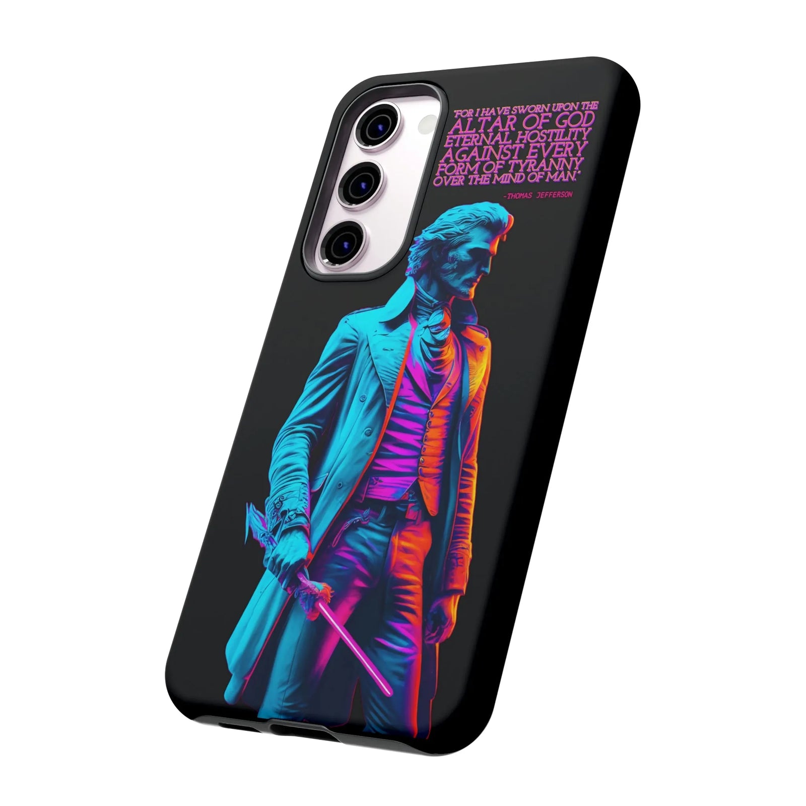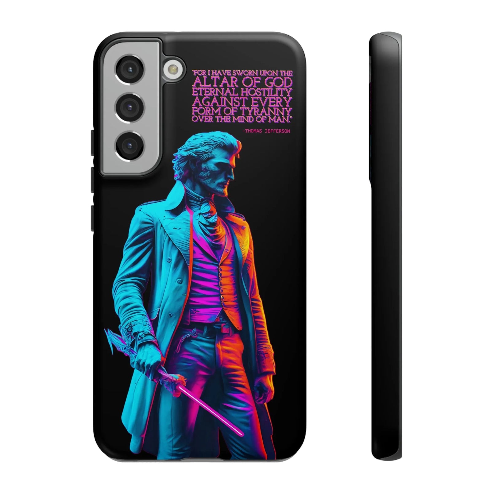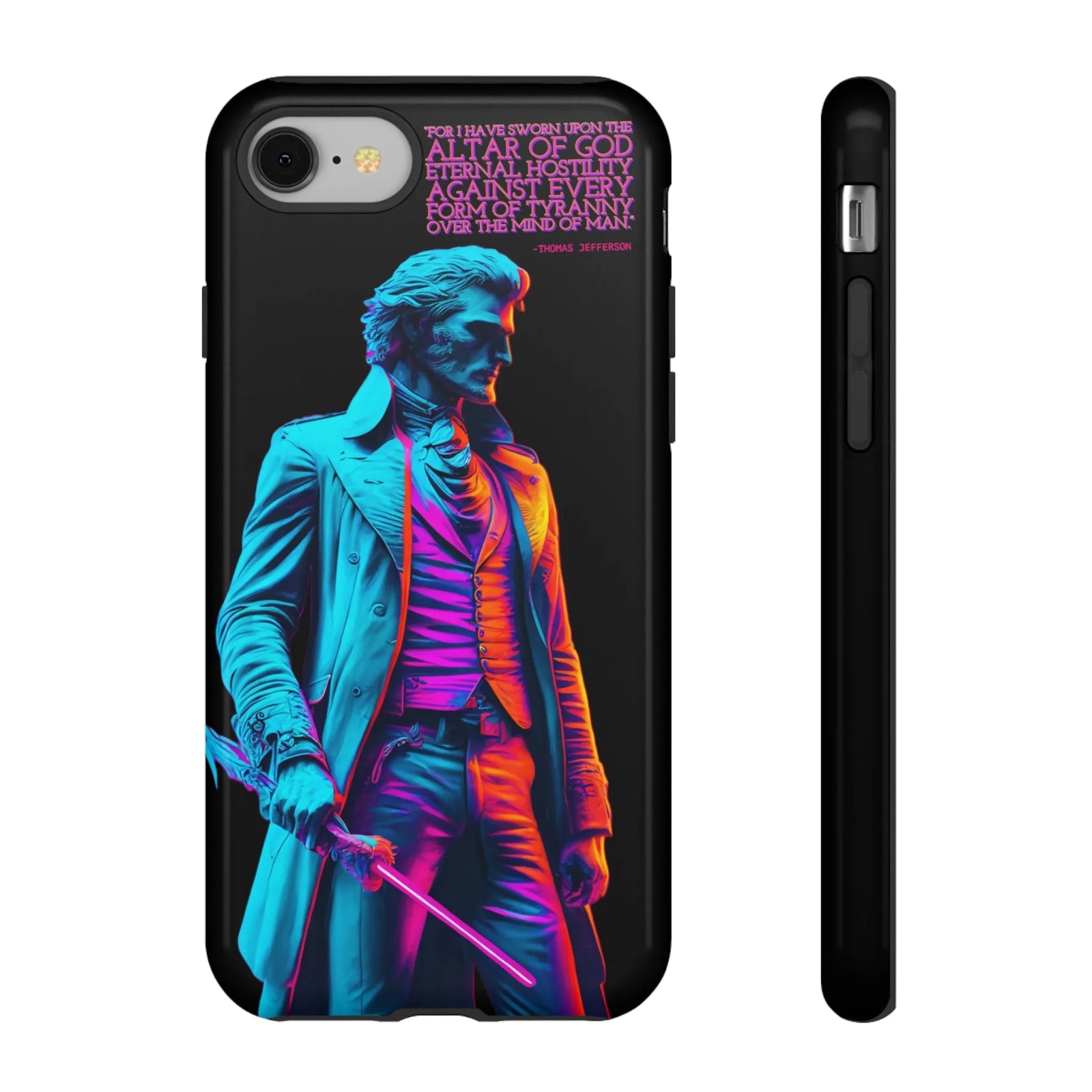 The image depicts Jefferson in a bold neon color reminiscent of 80's science fiction. The quote "For I have sworn upon the altar of God eternal hostility against every form of tyranny over the mind of man" is prominently displayed in a retro font, adding to the overall aesthetic.