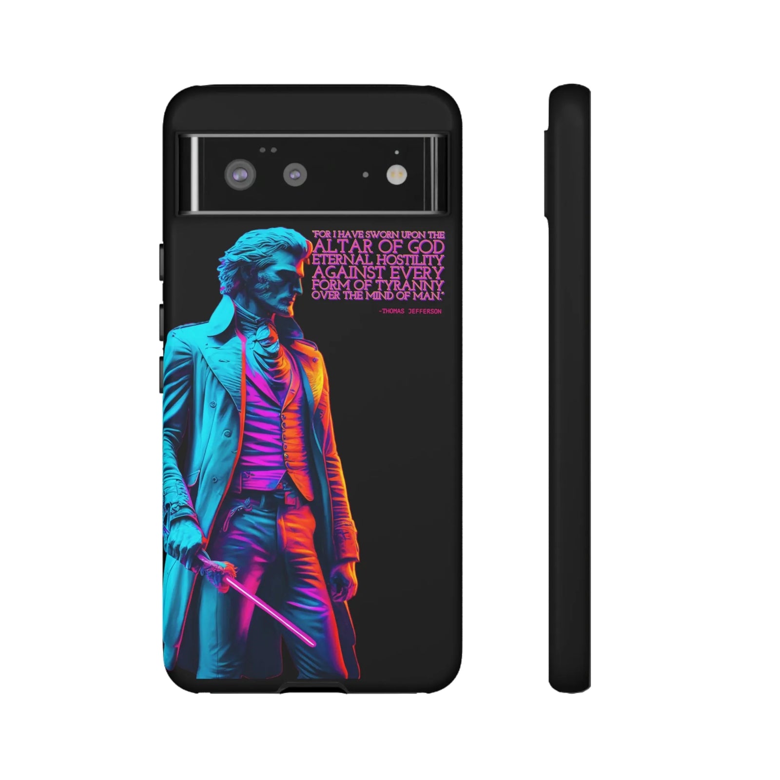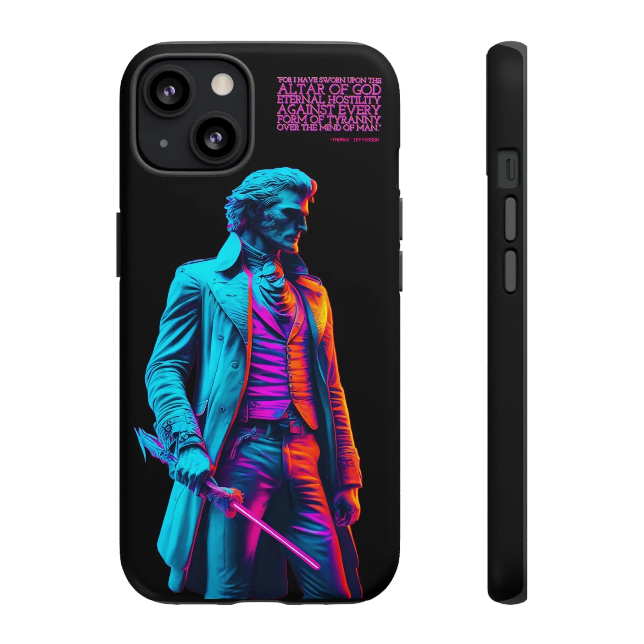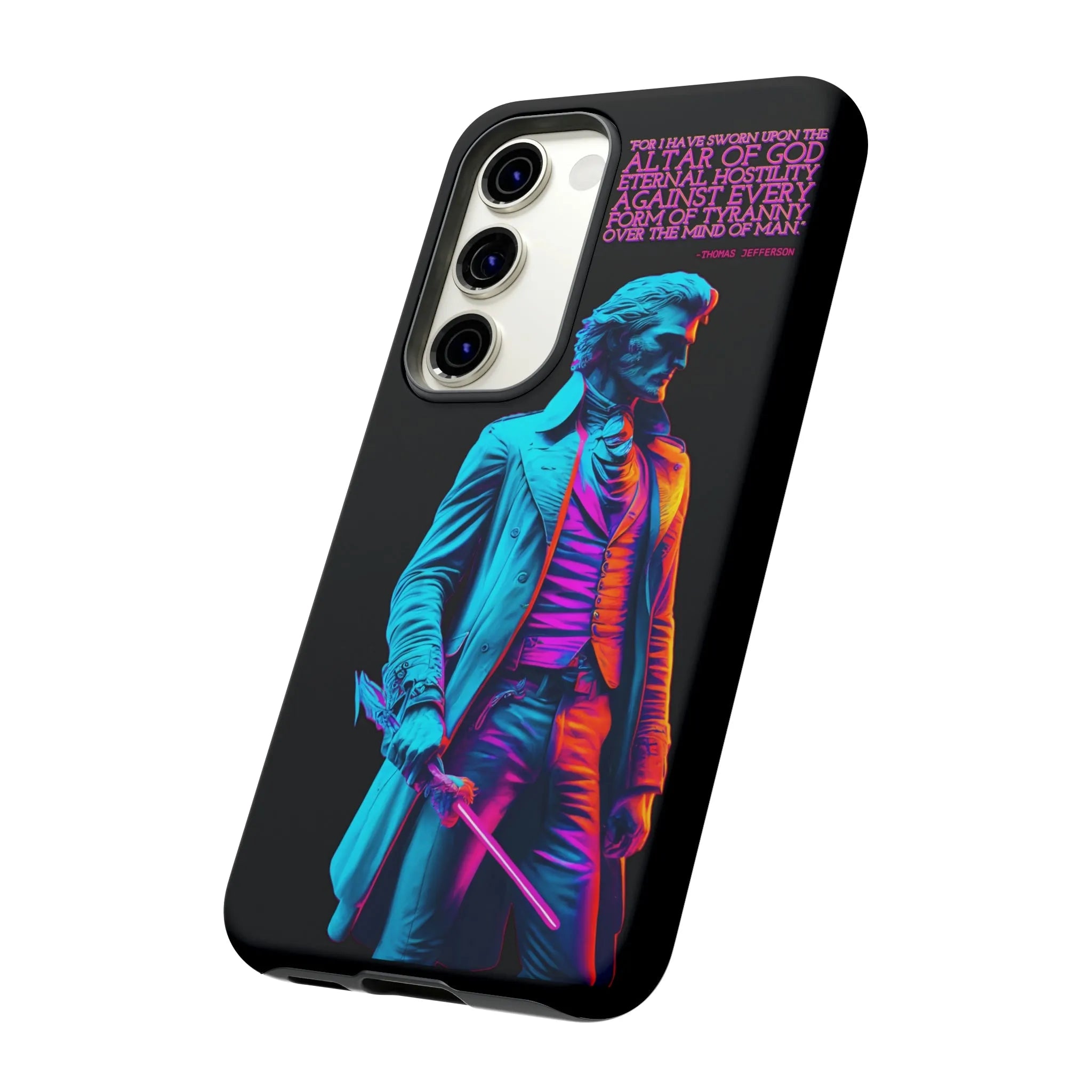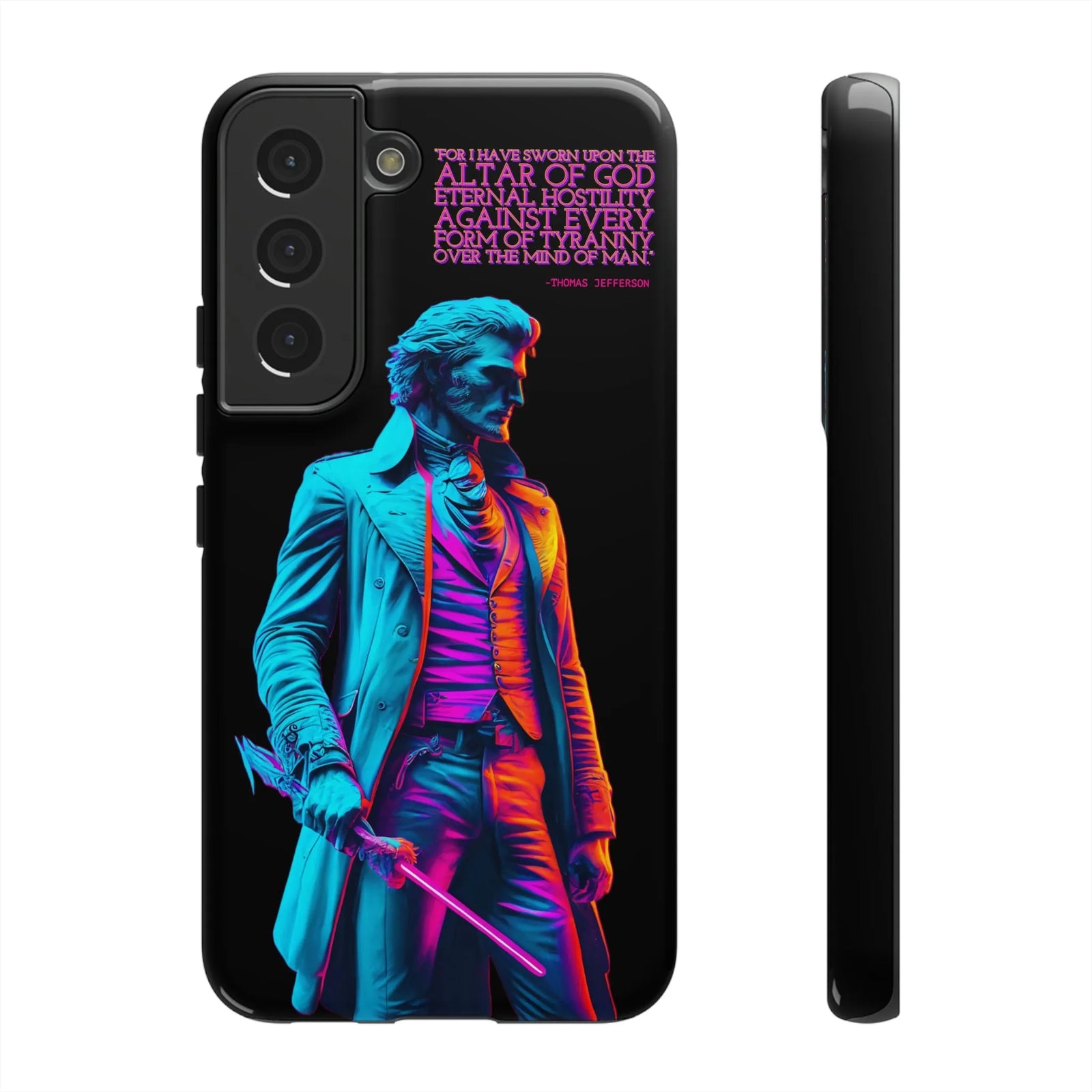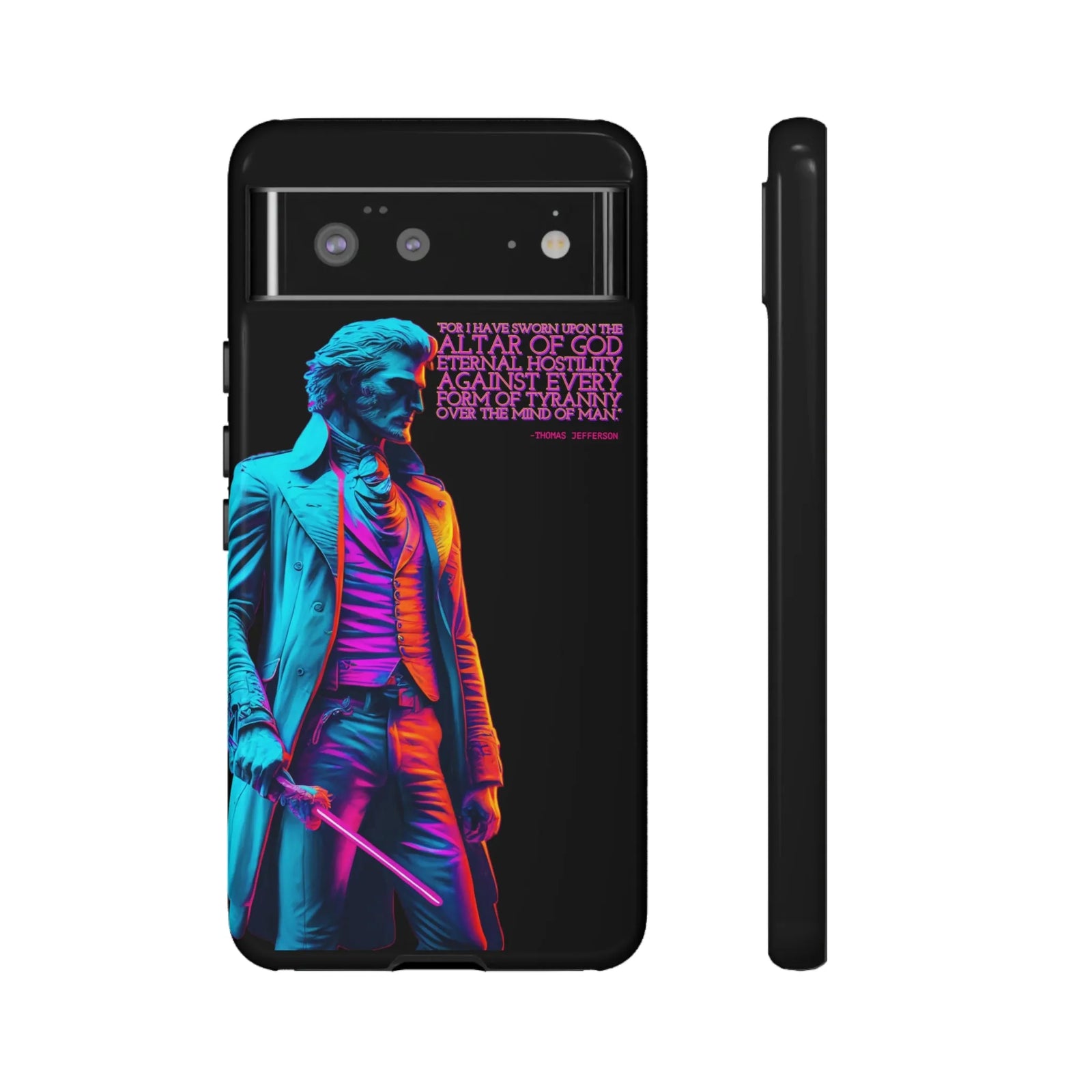 The image depicts Jefferson in a bold neon color reminiscent of 80's science fiction. The quote "For I have sworn upon the altar of God eternal hostility against every form of tyranny over the mind of man" is prominently displayed in a retro font, adding to the overall aesthetic.