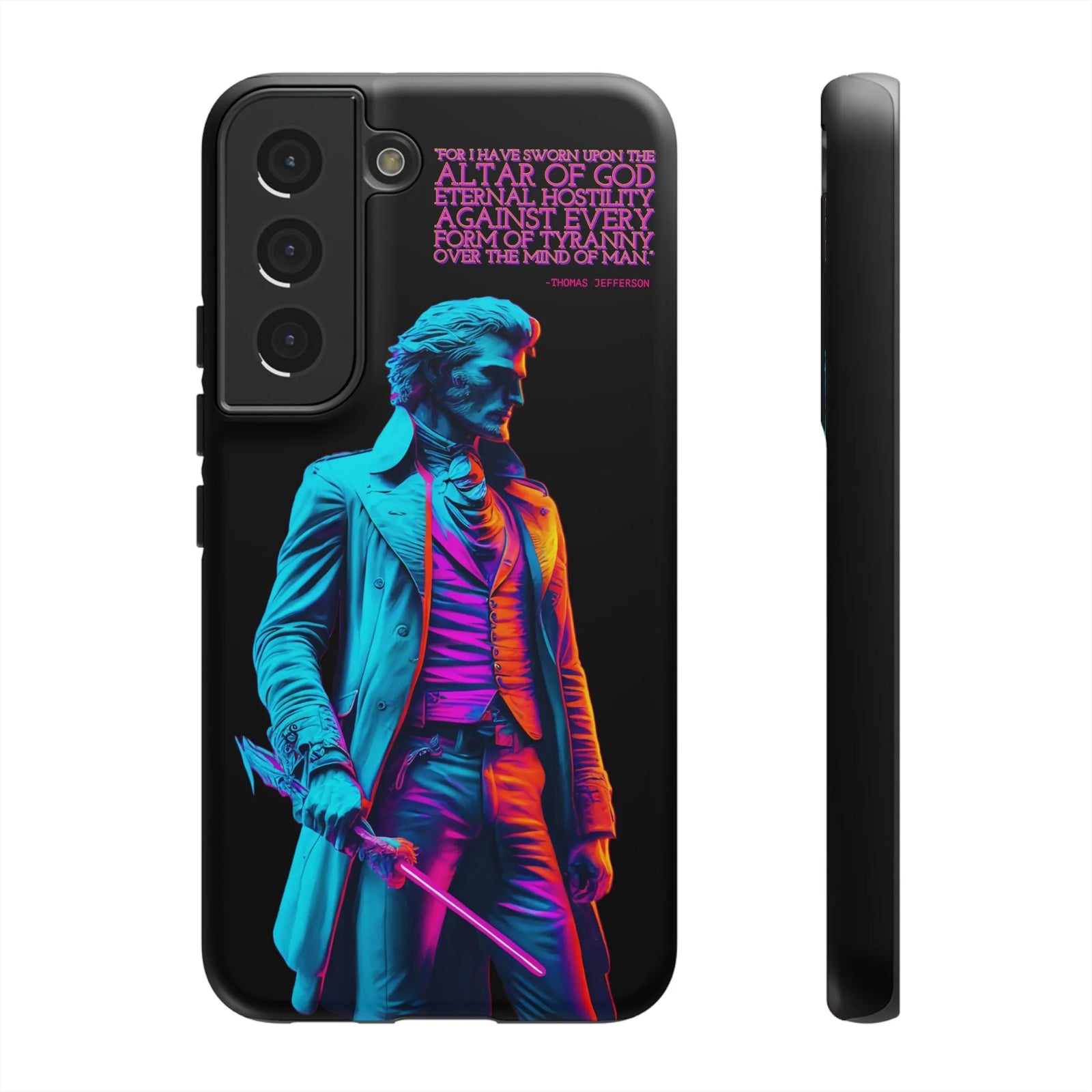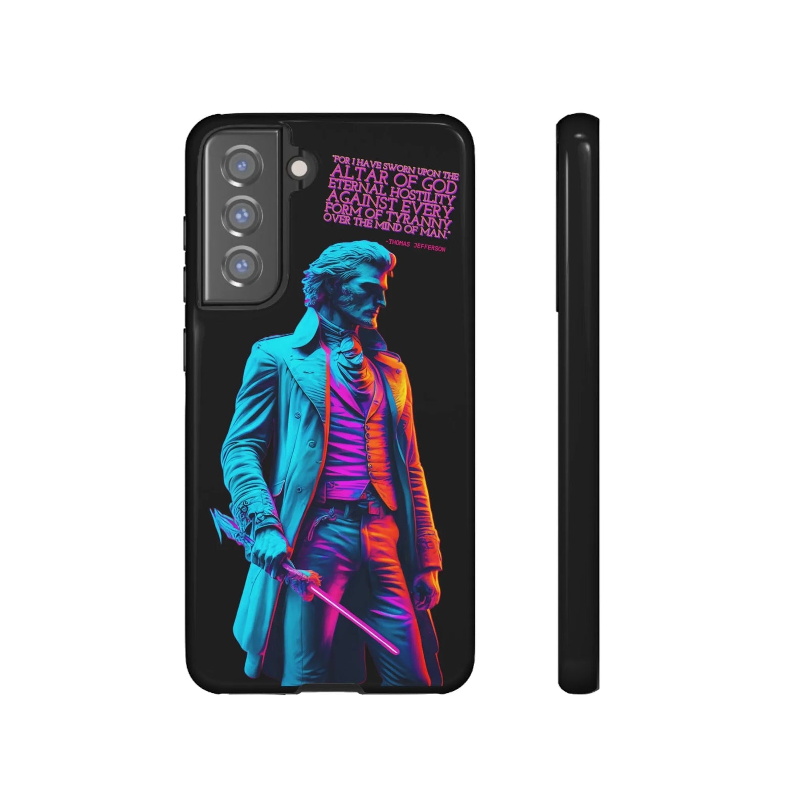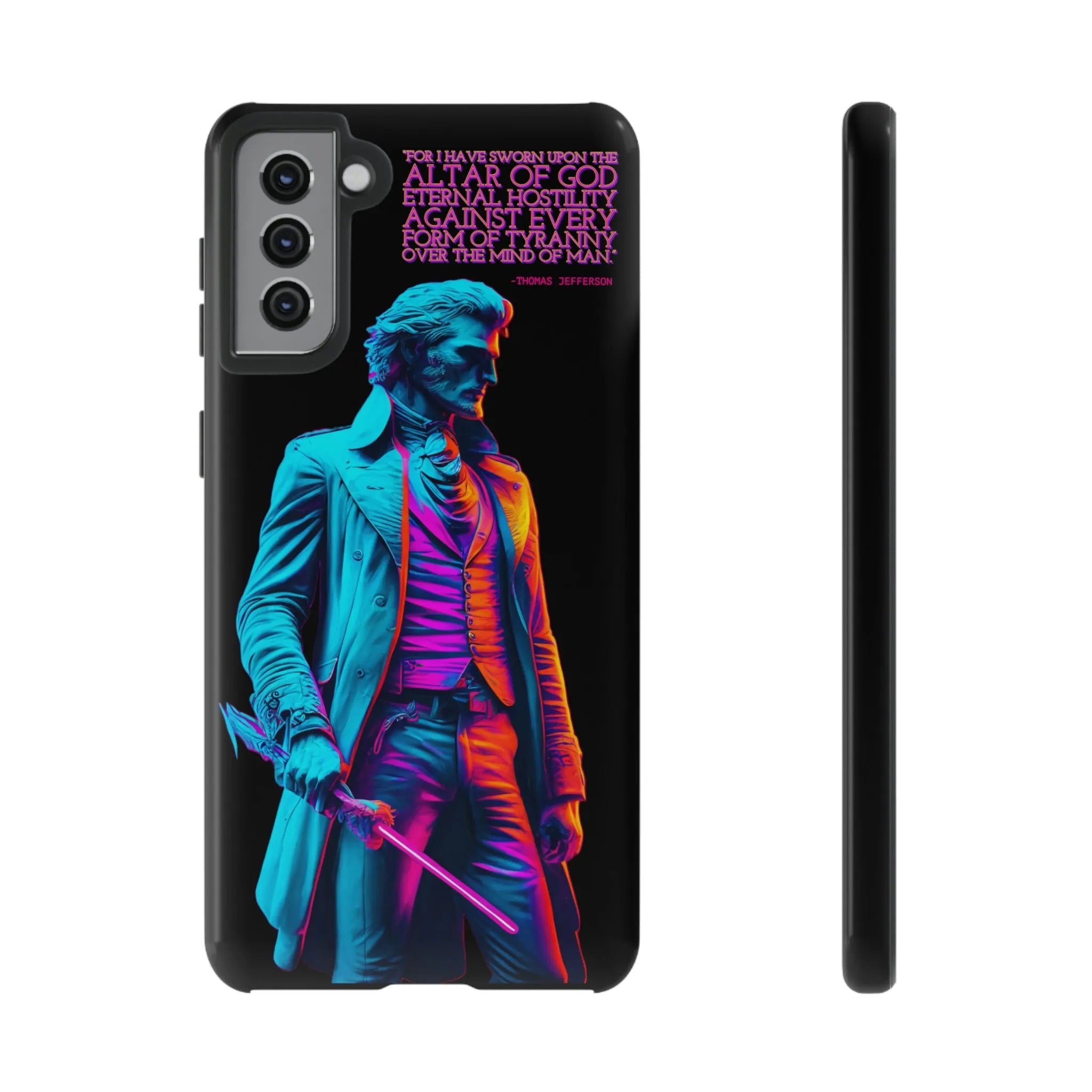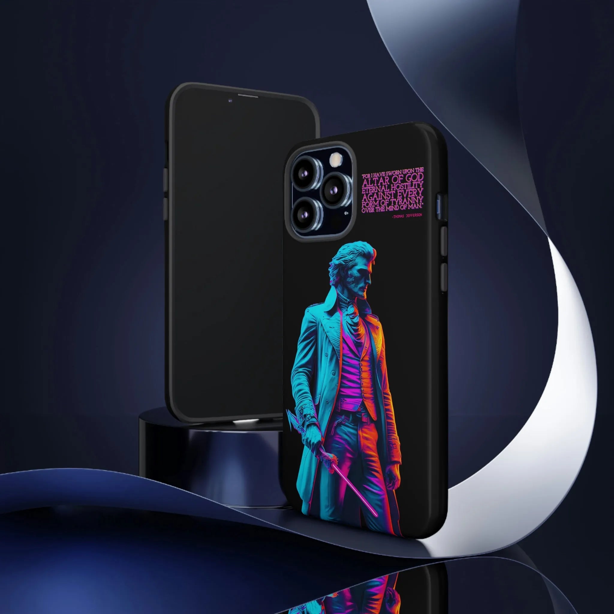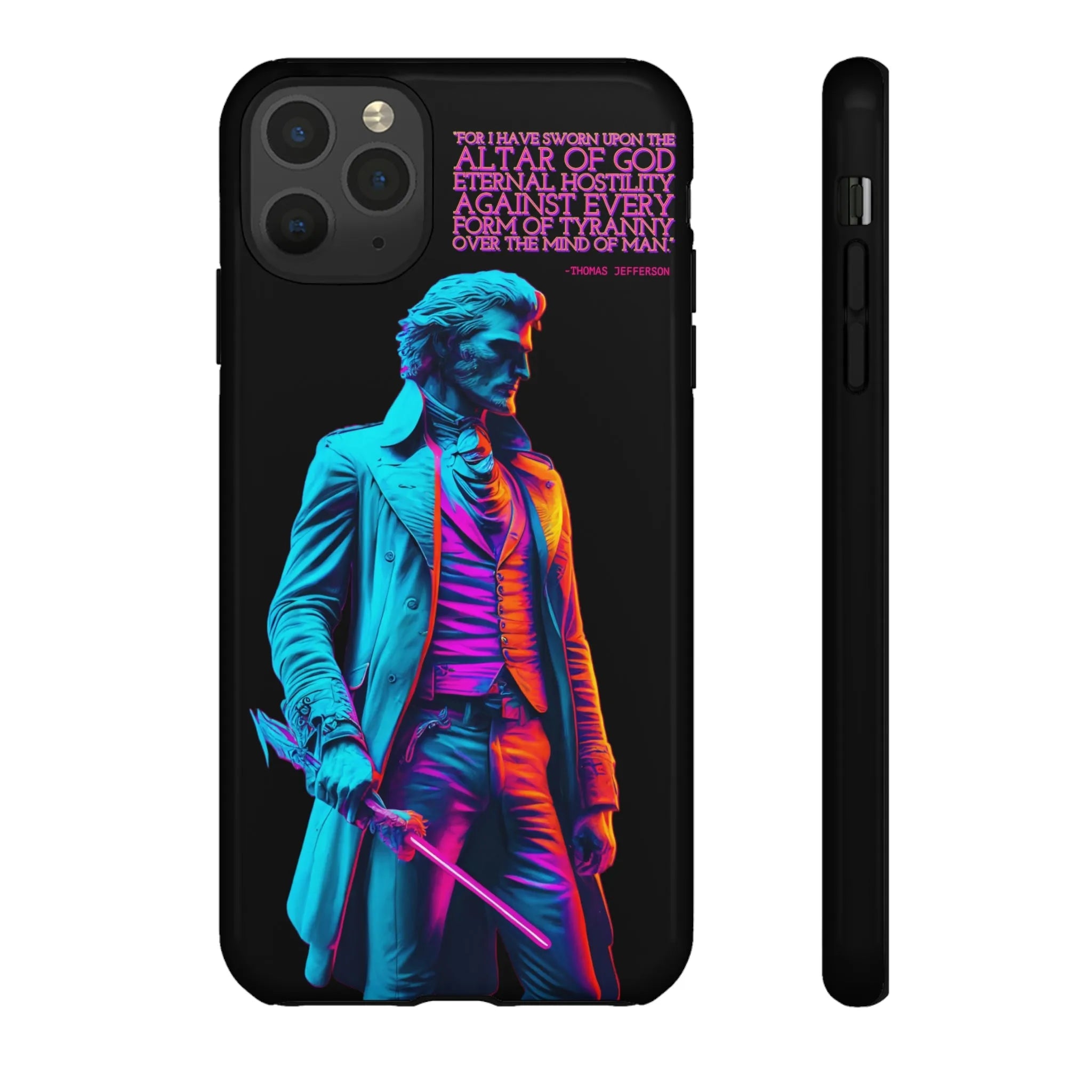 The image depicts Jefferson in a bold neon color reminiscent of 80's science fiction. The quote "For I have sworn upon the altar of God eternal hostility against every form of tyranny over the mind of man" is prominently displayed in a retro font, adding to the overall aesthetic.