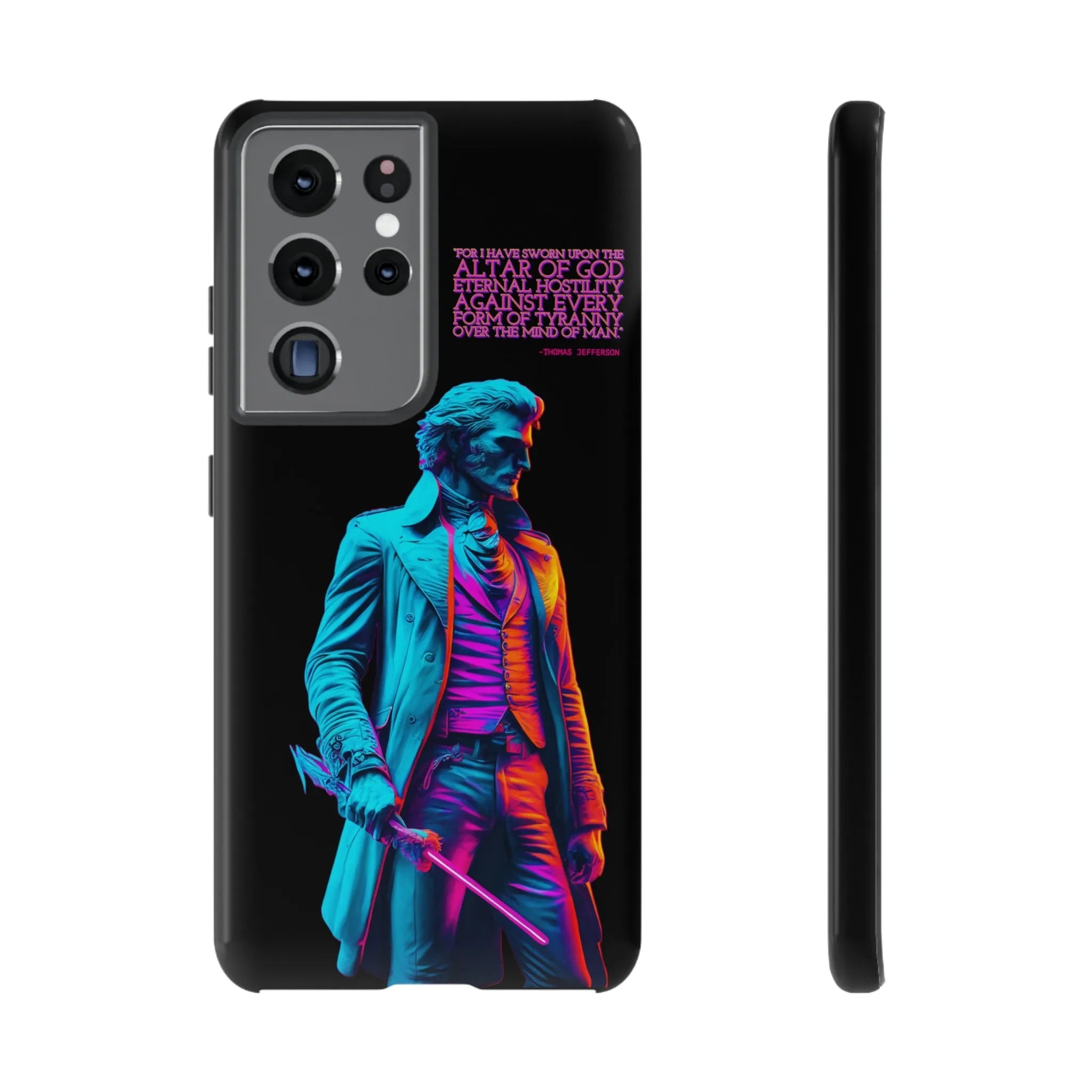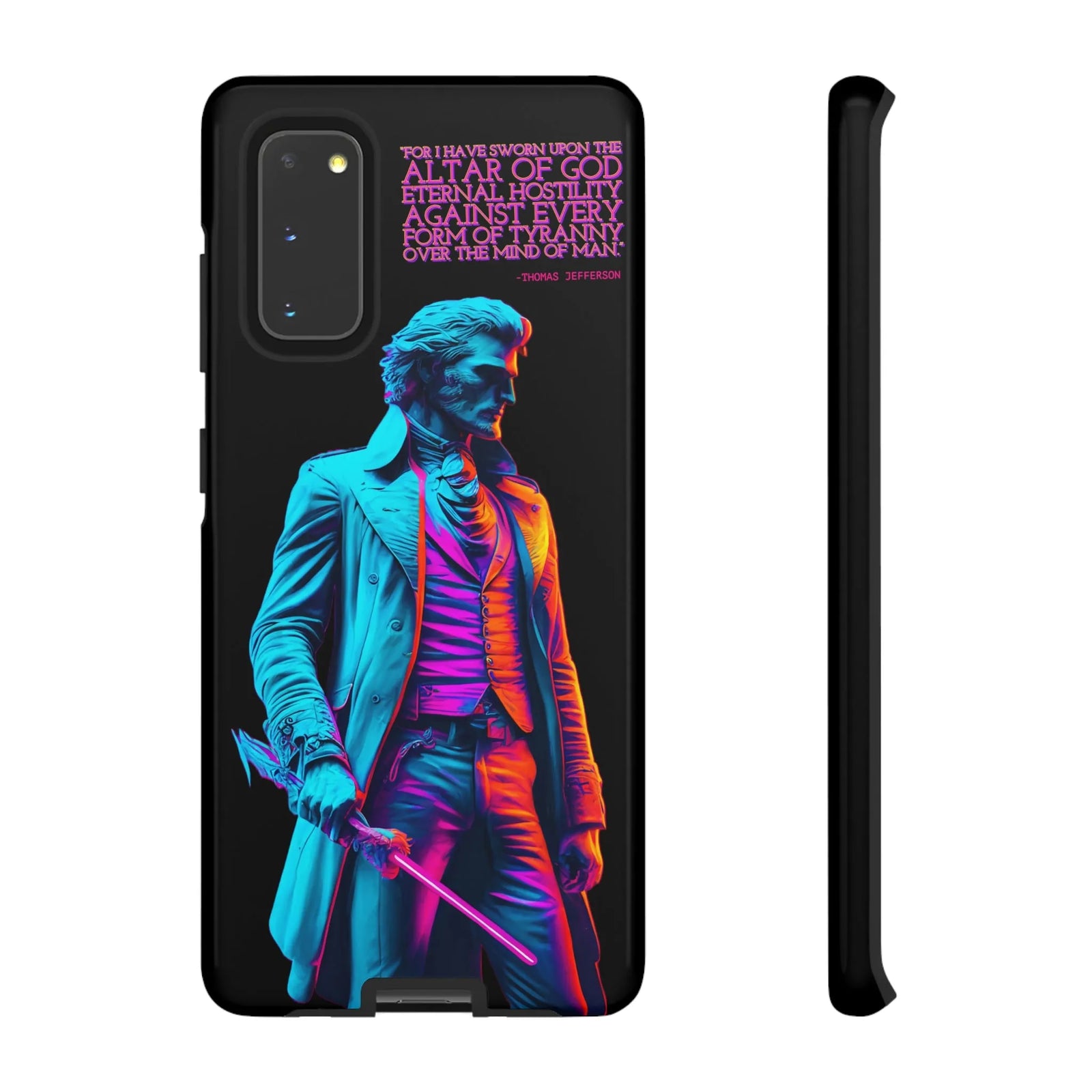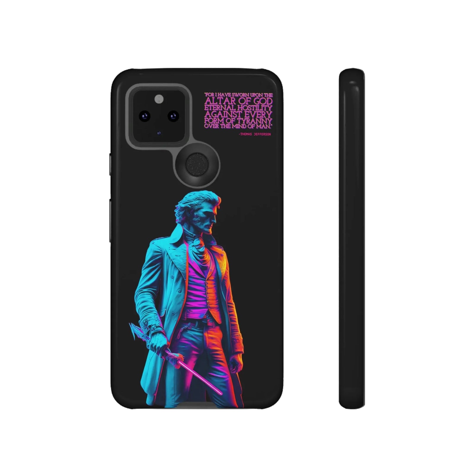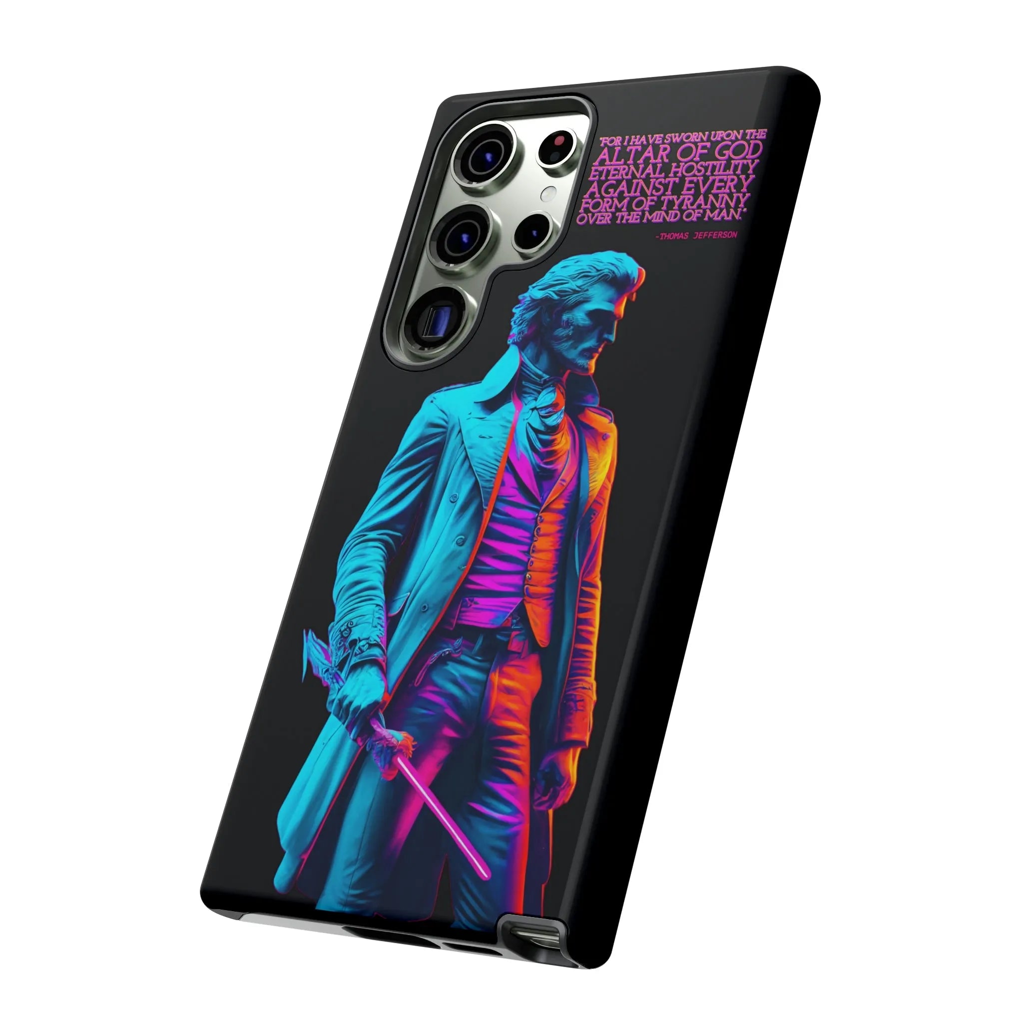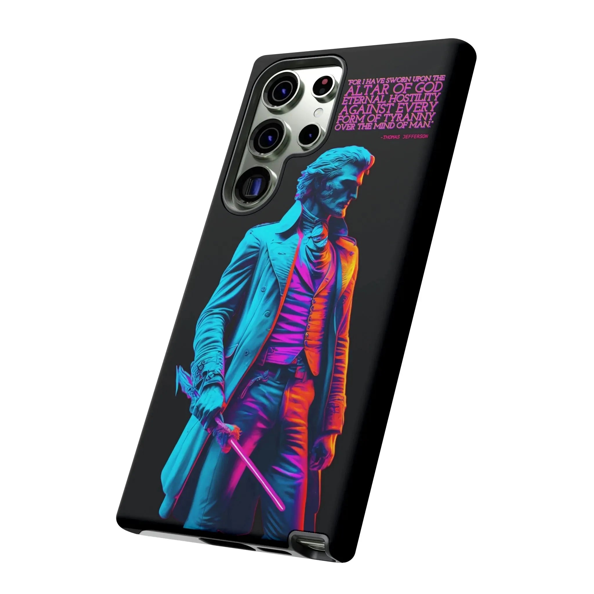The image depicts Jefferson in a bold neon color reminiscent of 80's science fiction. The quote "For I have sworn upon the altar of God eternal hostility against every form of tyranny over the mind of man" is prominently displayed in a retro font, adding to the overall aesthetic.