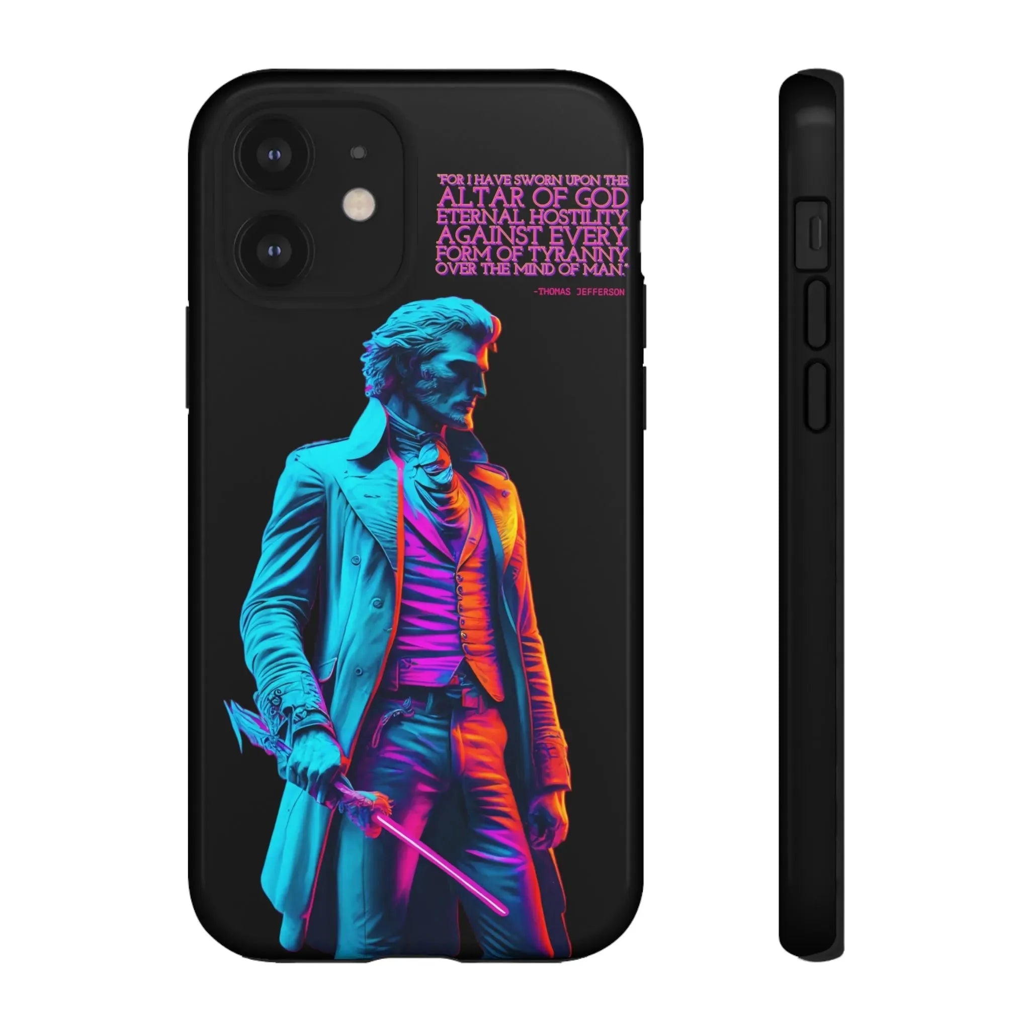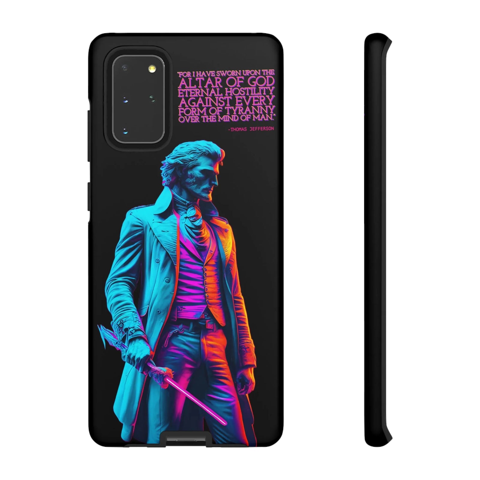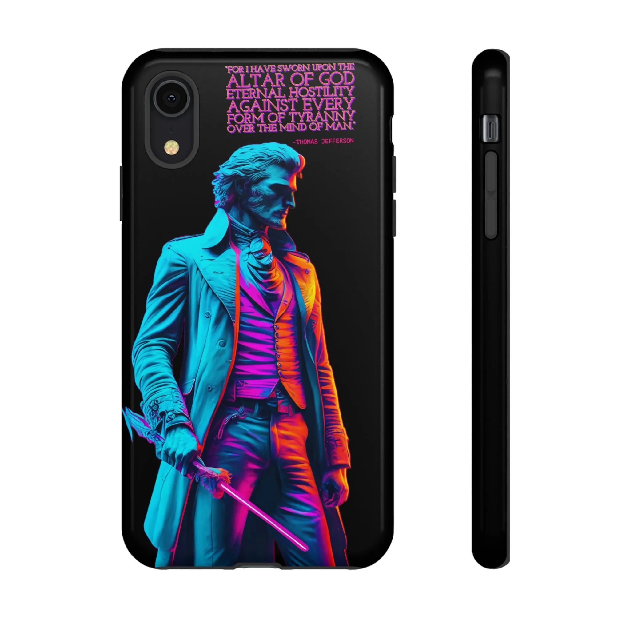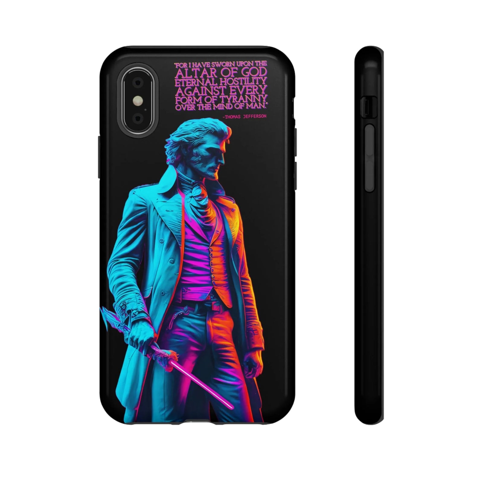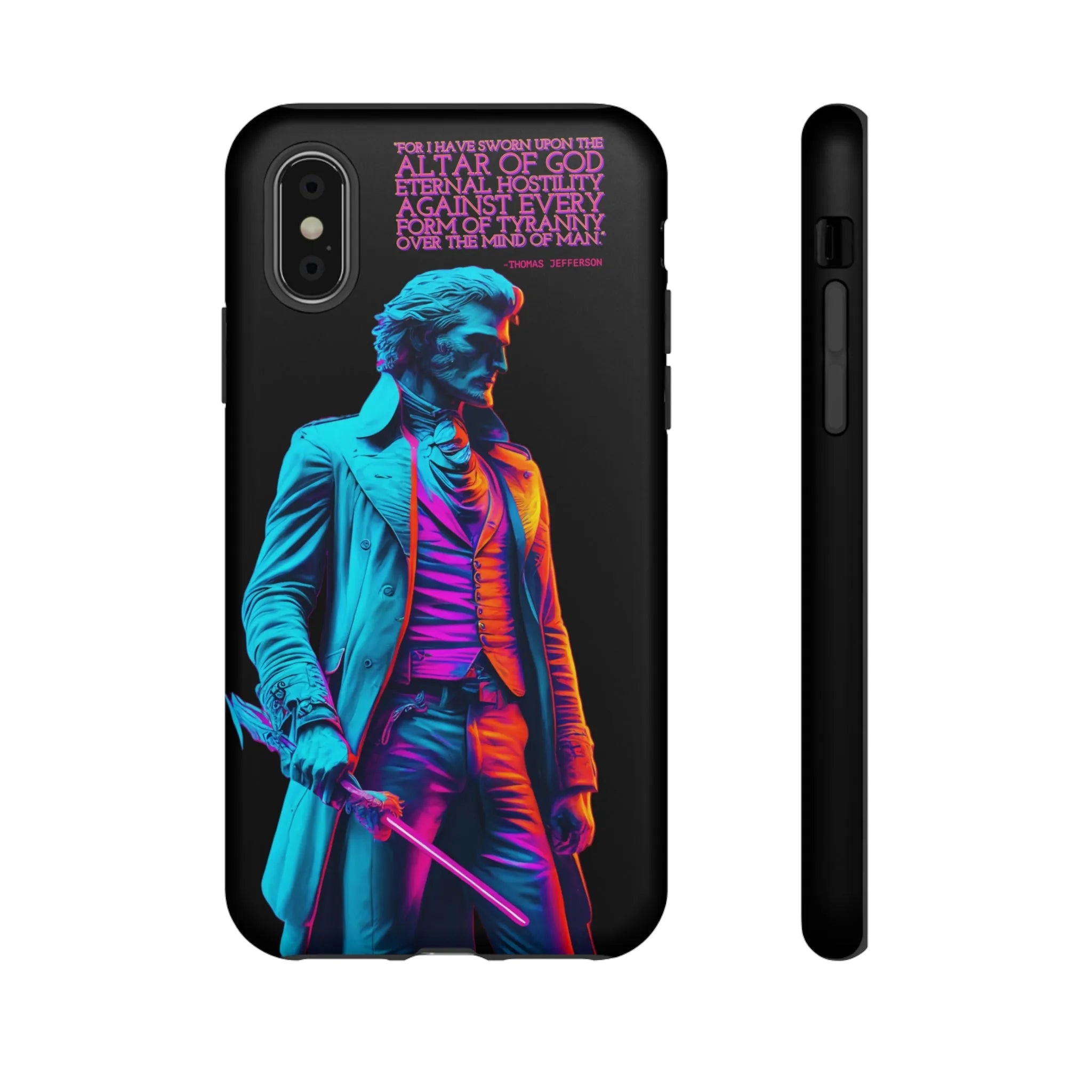 The image depicts Jefferson in a bold neon color reminiscent of 80's science fiction. The quote "For I have sworn upon the altar of God eternal hostility against every form of tyranny over the mind of man" is prominently displayed in a retro font, adding to the overall aesthetic.