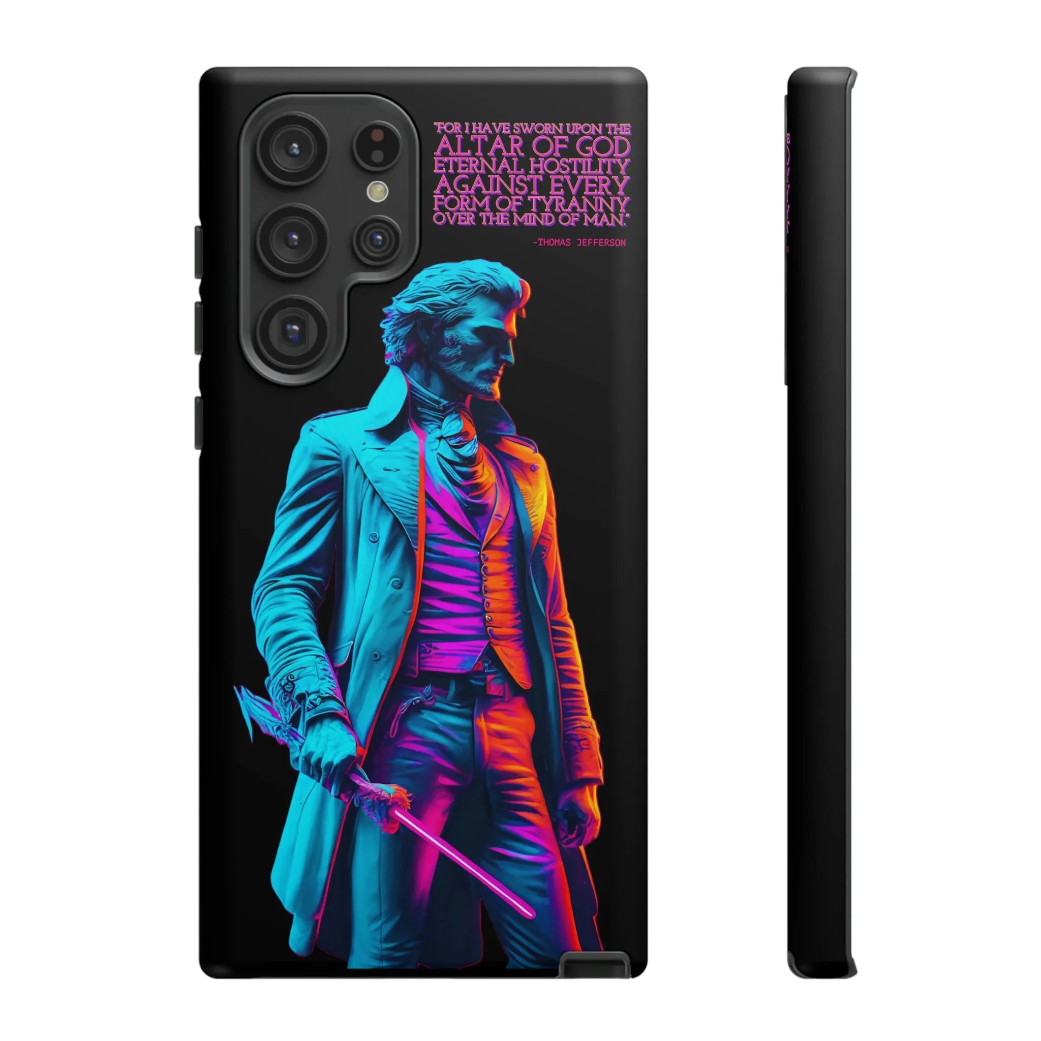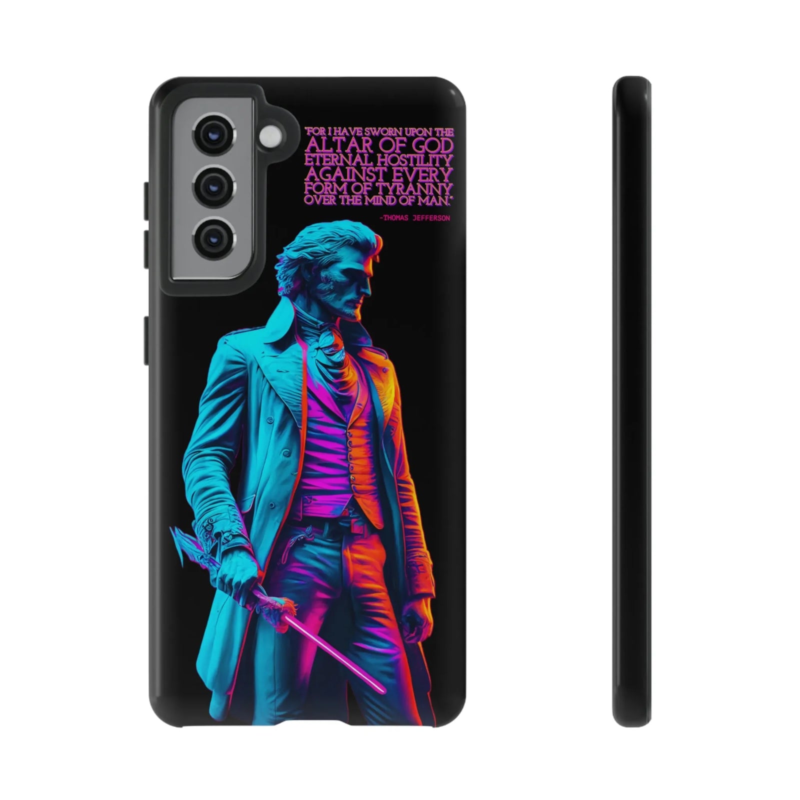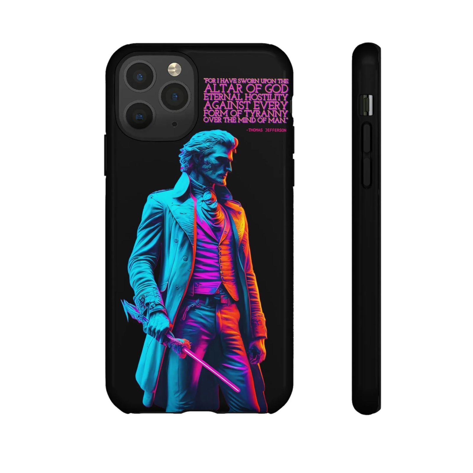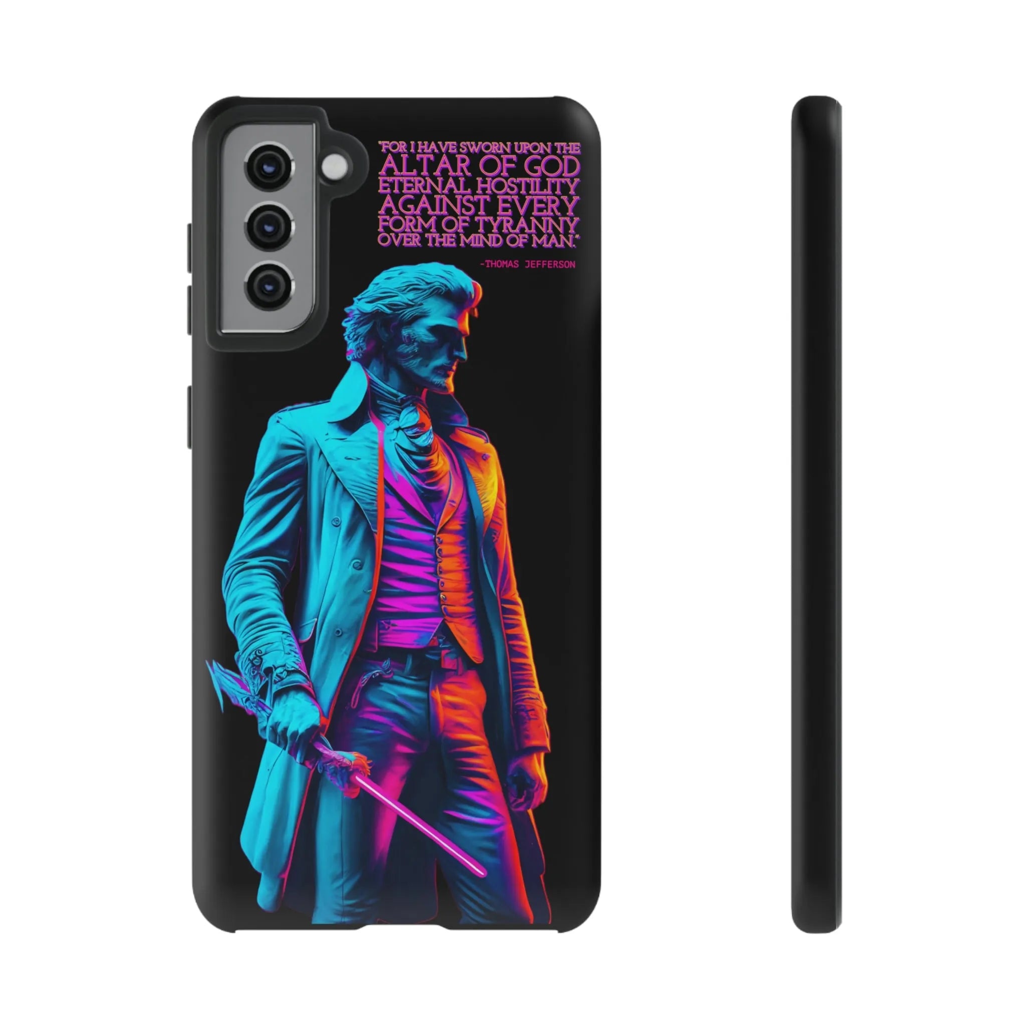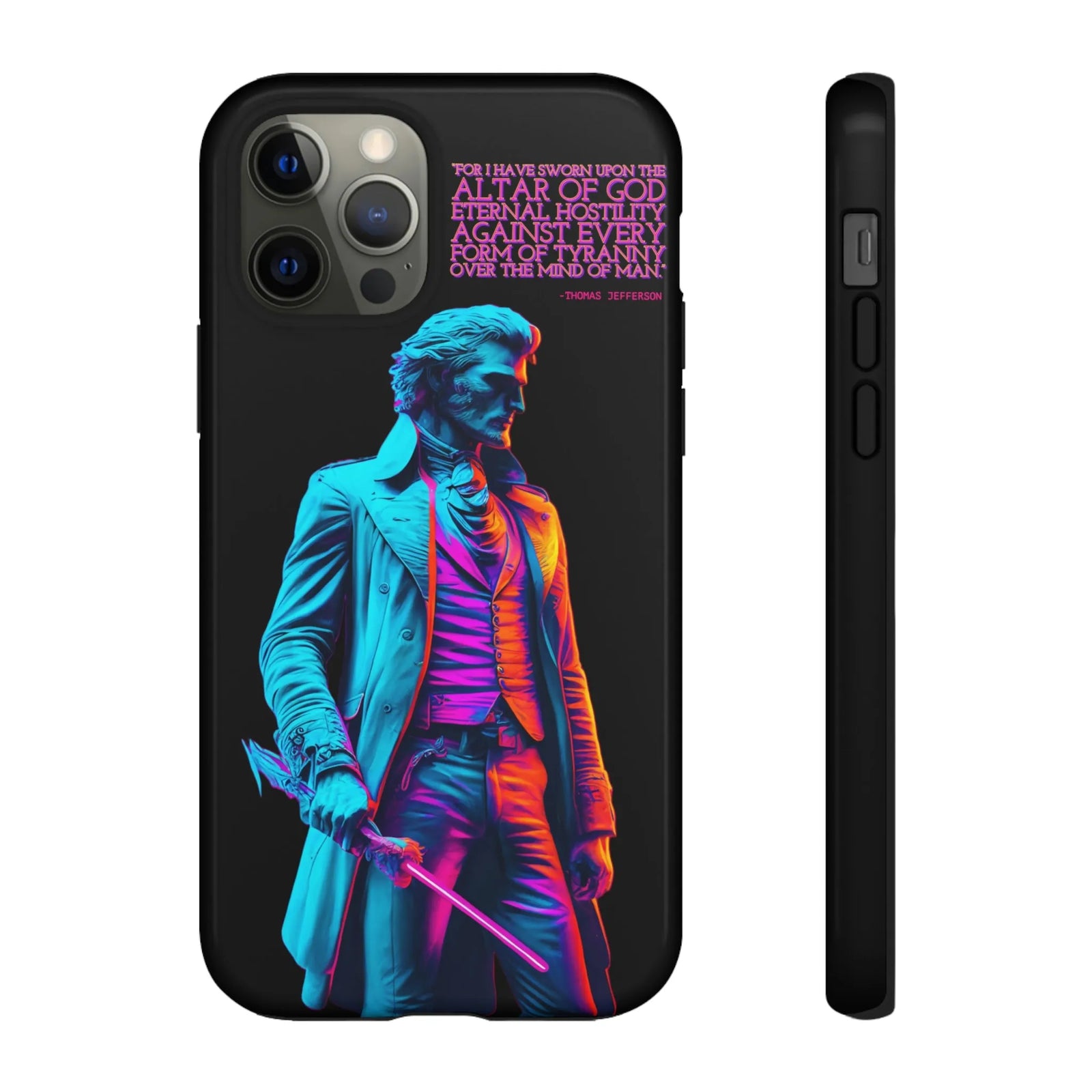 The image depicts Jefferson in a bold neon color reminiscent of 80's science fiction. The quote "For I have sworn upon the altar of God eternal hostility against every form of tyranny over the mind of man" is prominently displayed in a retro font, adding to the overall aesthetic.