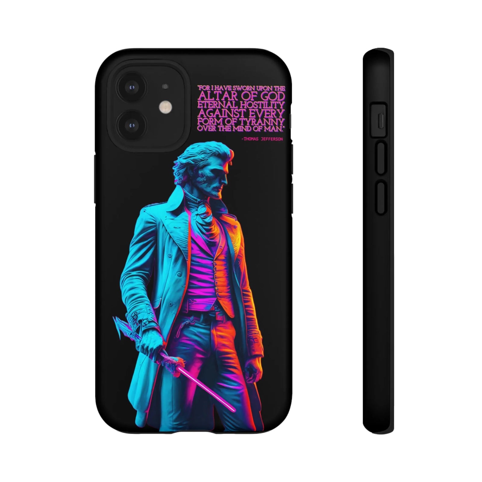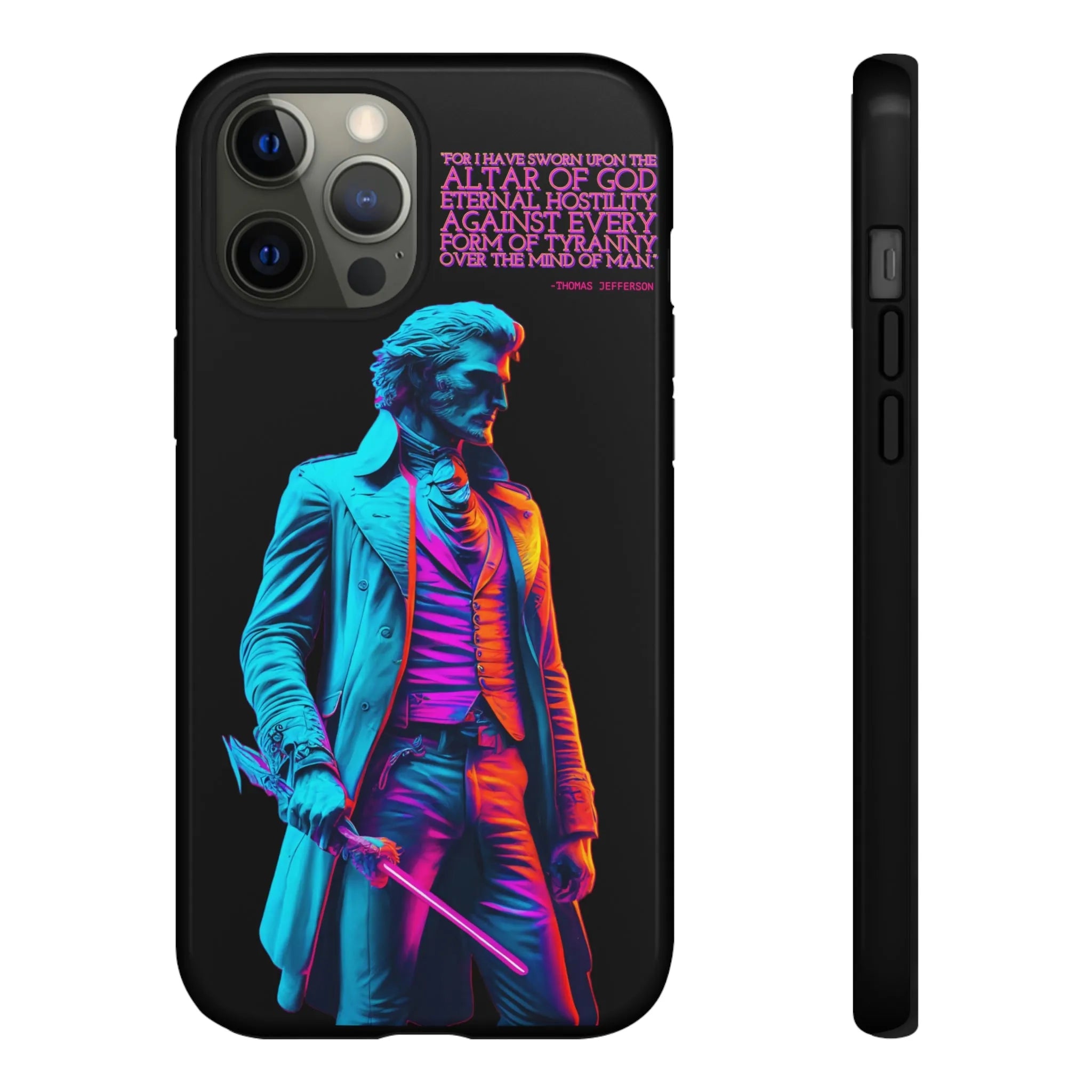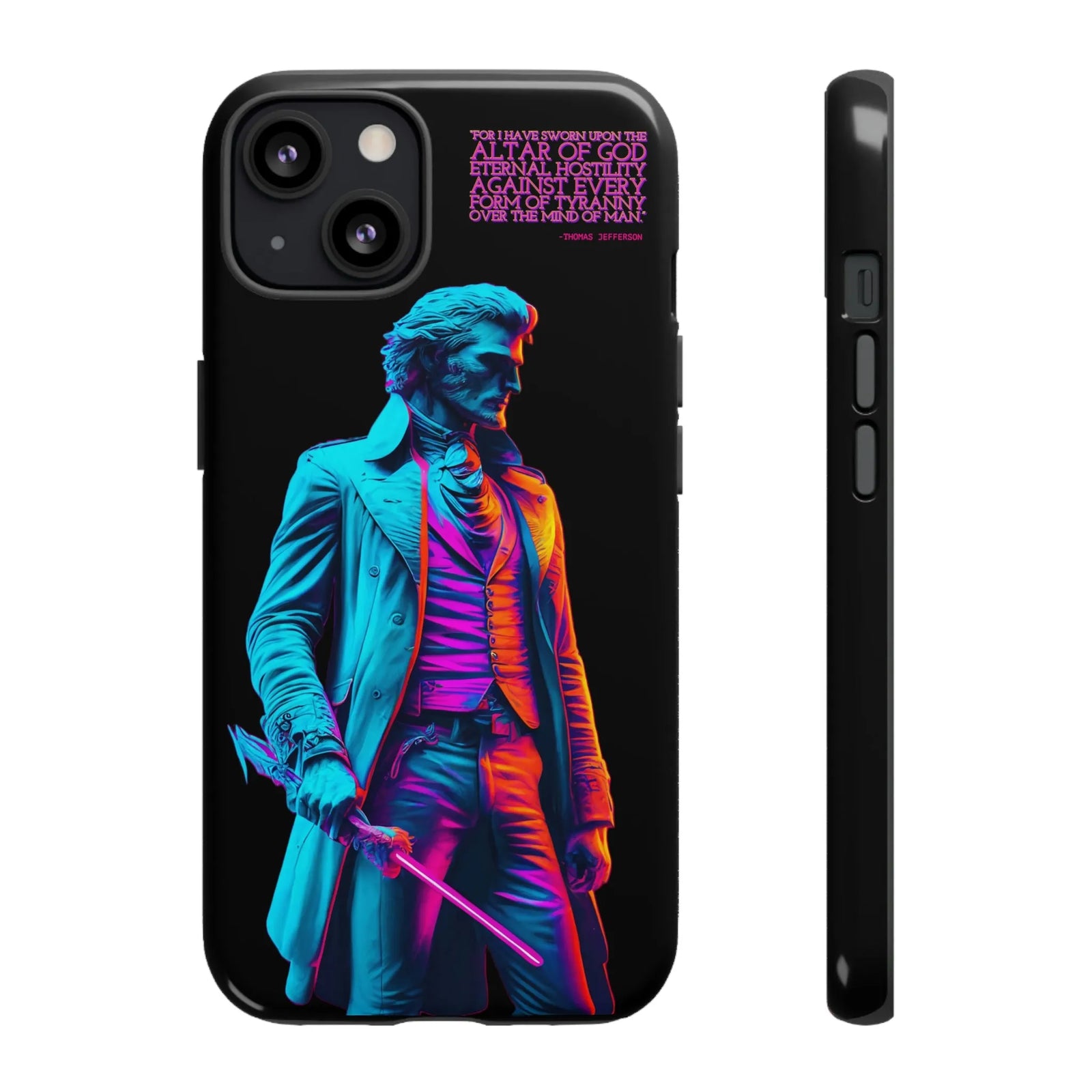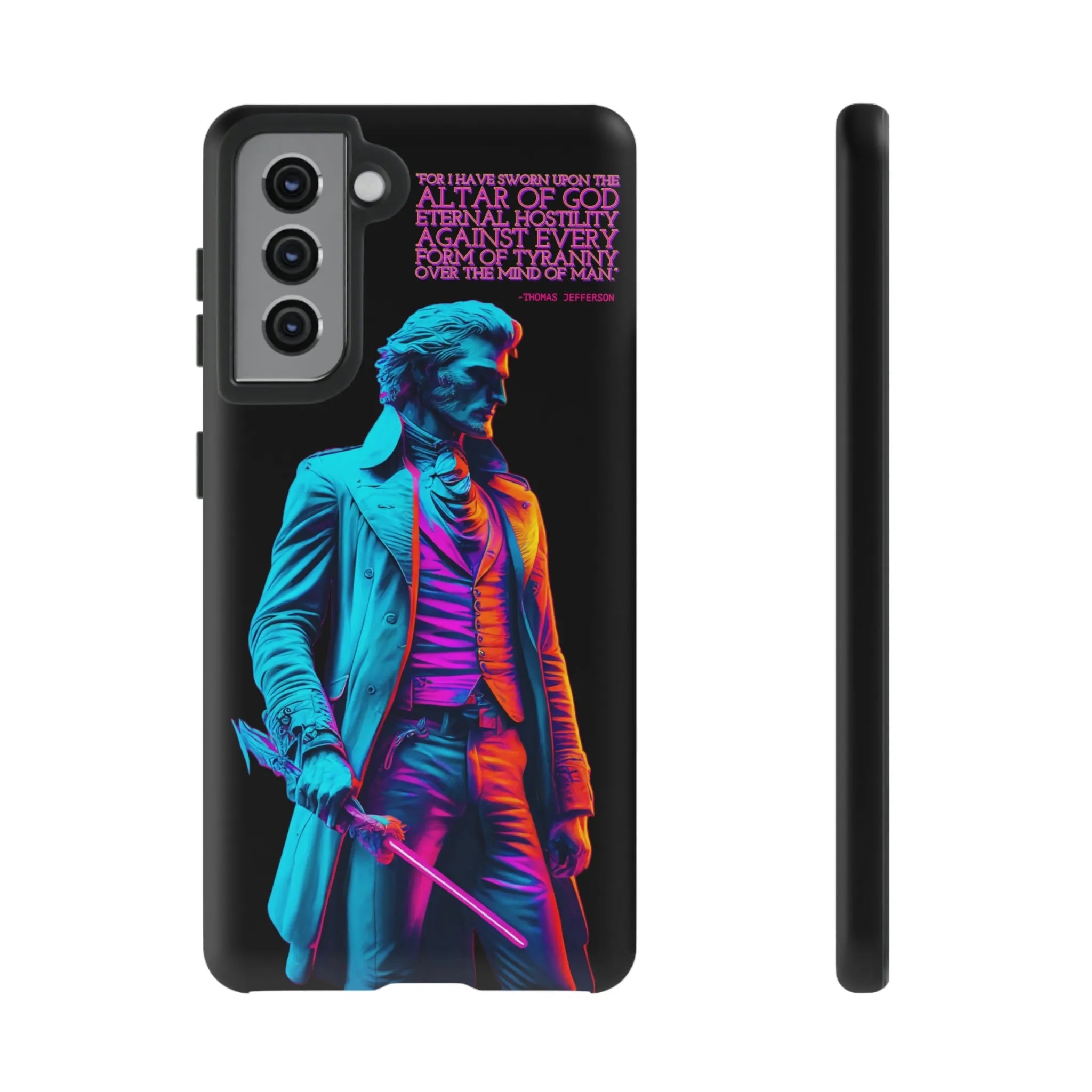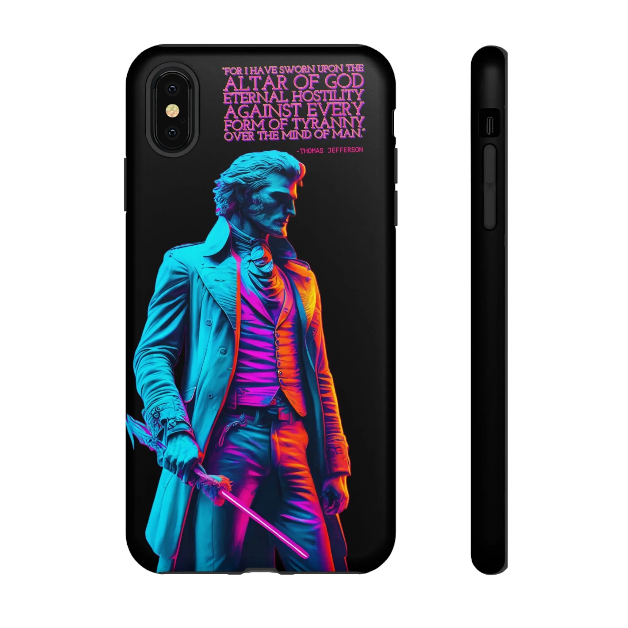 The image depicts Jefferson in a bold neon color reminiscent of 80's science fiction. The quote "For I have sworn upon the altar of God eternal hostility against every form of tyranny over the mind of man" is prominently displayed in a retro font, adding to the overall aesthetic.