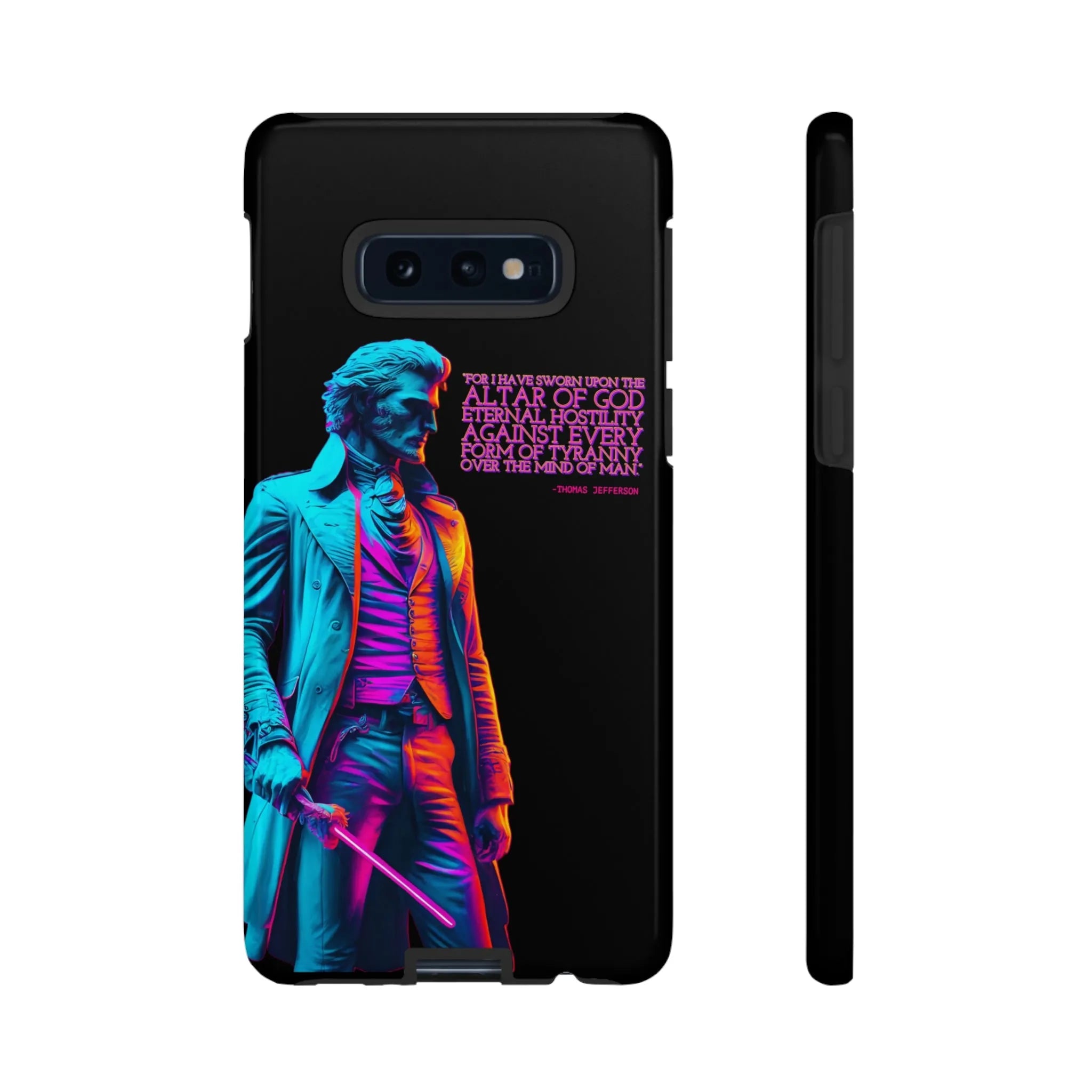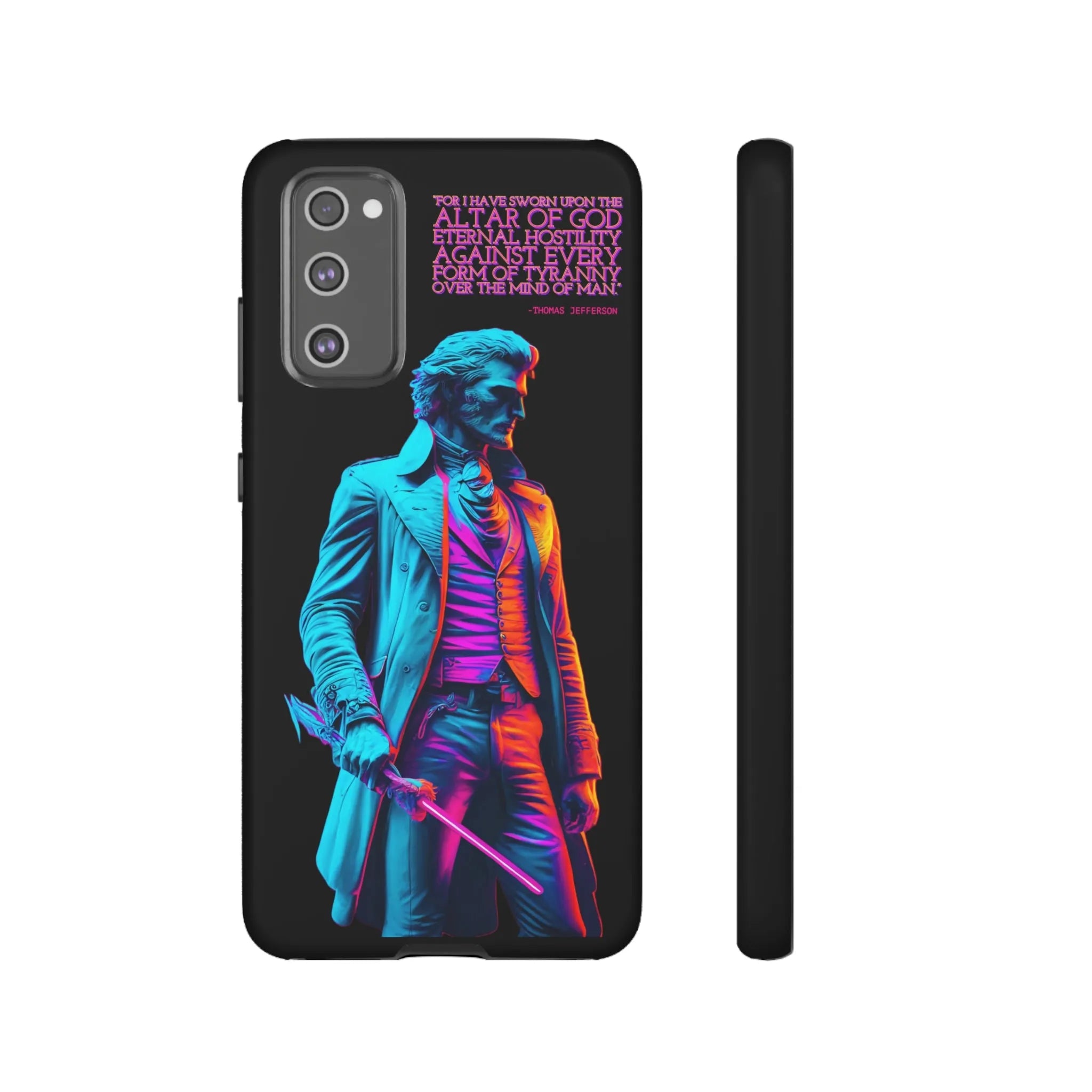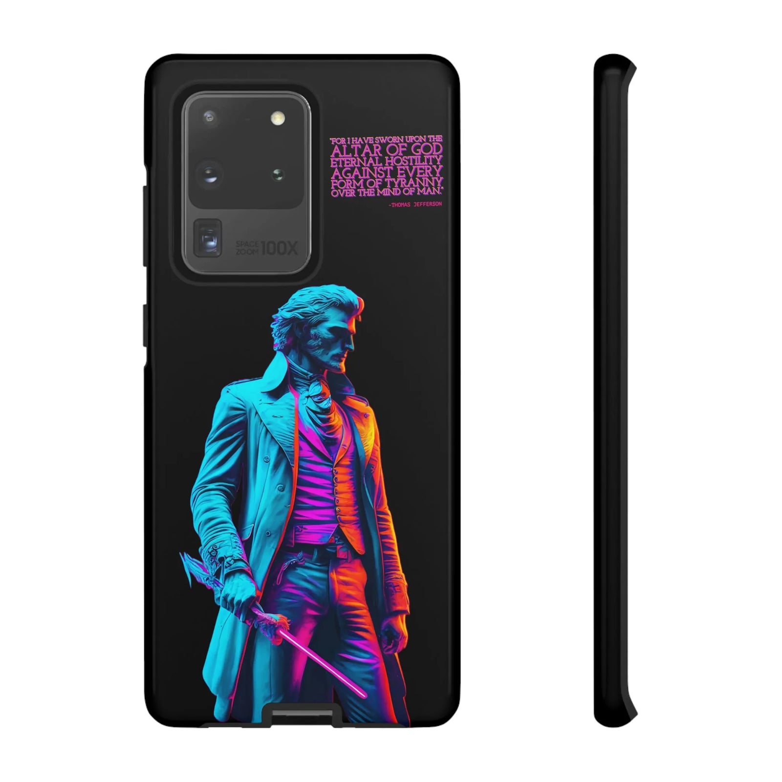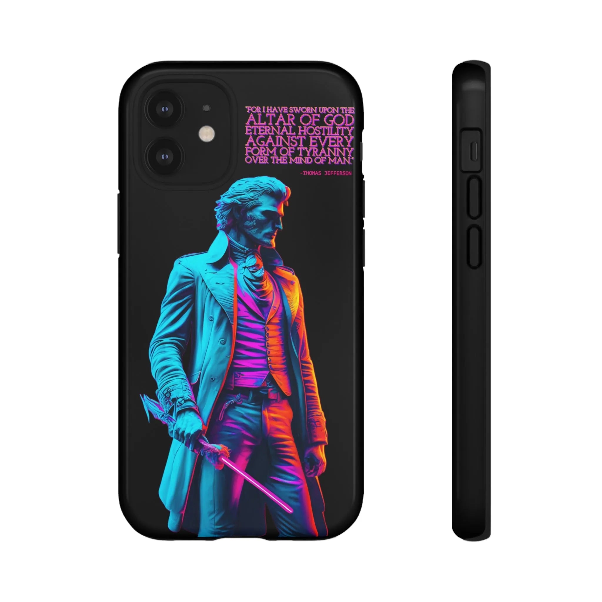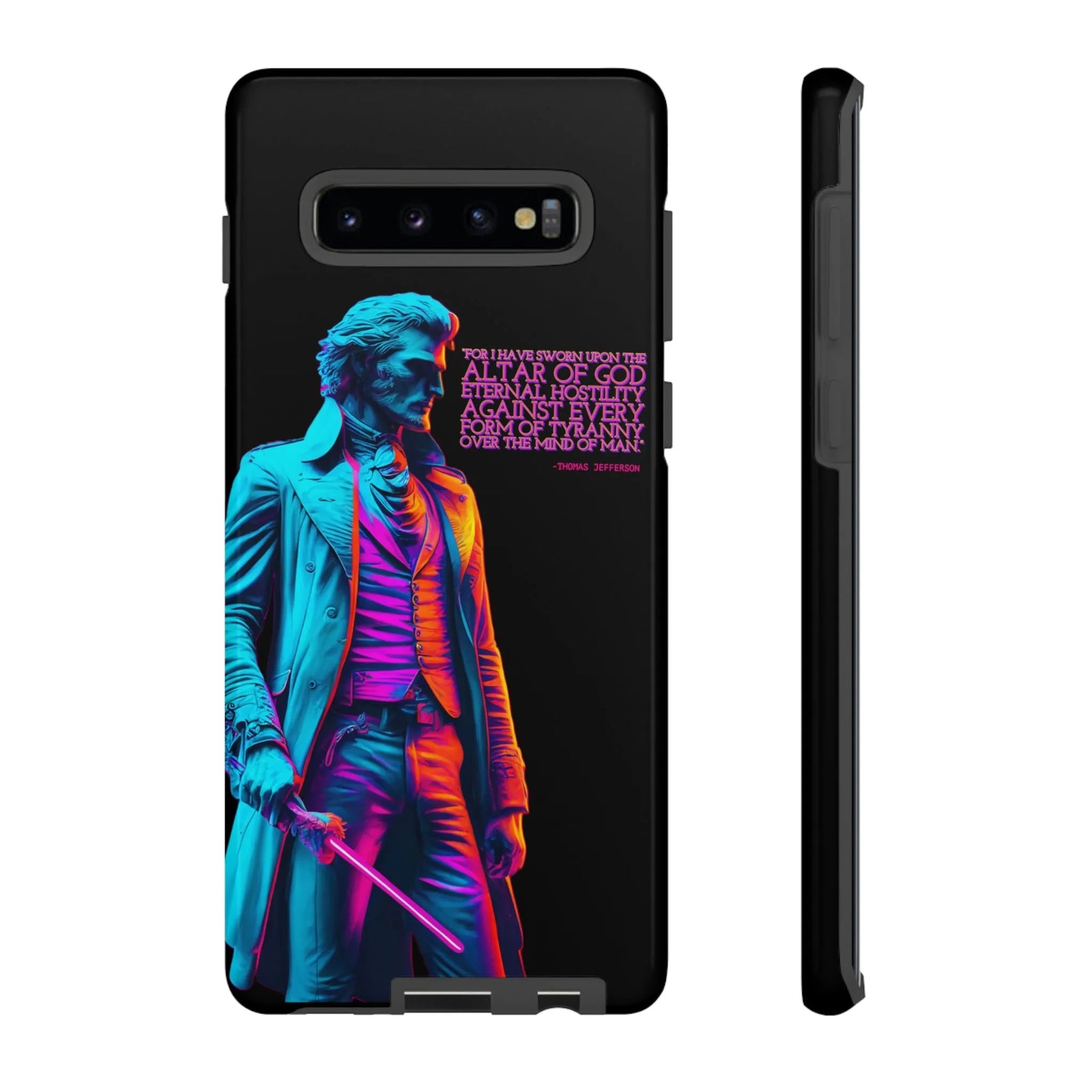 The image depicts Jefferson in a bold neon color reminiscent of 80's science fiction. The quote "For I have sworn upon the altar of God eternal hostility against every form of tyranny over the mind of man" is prominently displayed in a retro font, adding to the overall aesthetic.
