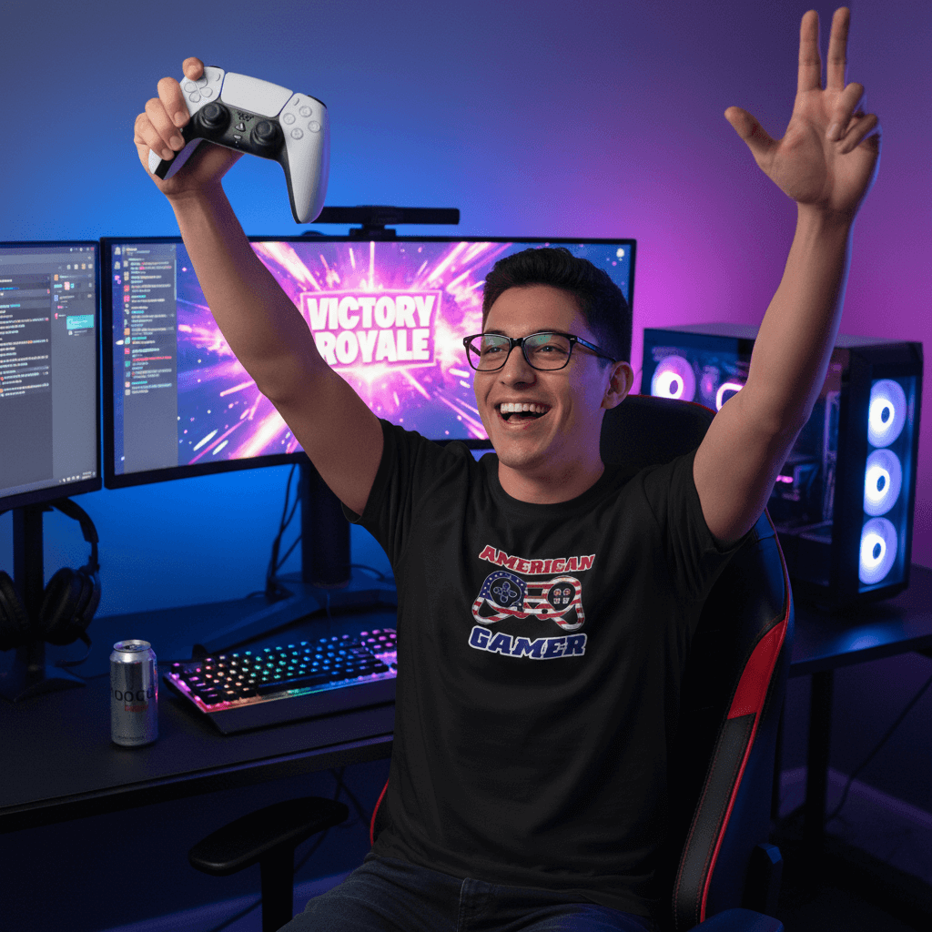 Perfect for gamers, esports fans, streamers, content creators, and anyone who proudly identifies as both American and a gamer. Wear it to gaming conventions, LAN parties, casual hangouts, or while streaming your next epic victory. This is a statement tee that shows you can be patriotic and a gamer - no respawn needed.