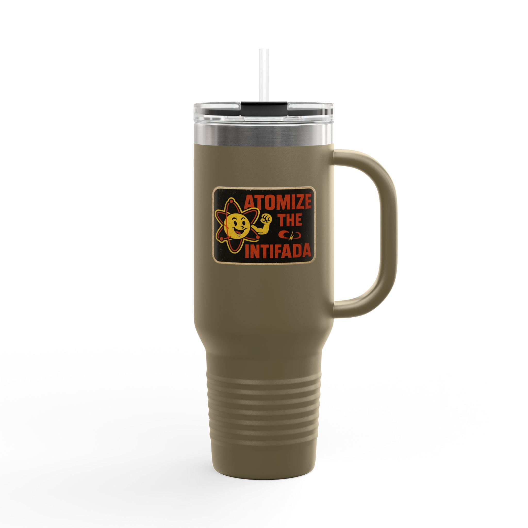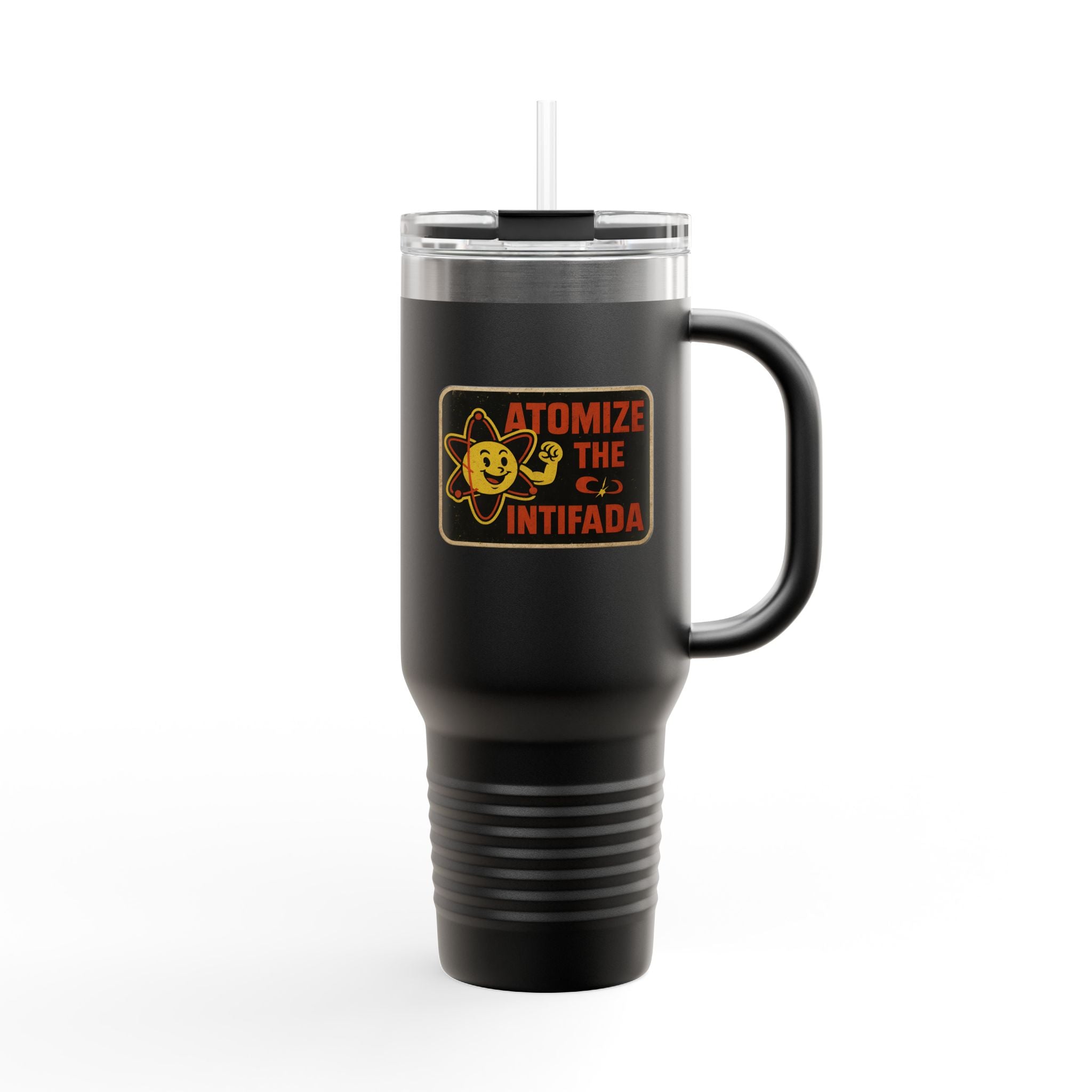 Take a stand and stay refreshed with the Atomize the Intifada Insulated Travel Mug. Featuring bold retro artwork with a punch of attitude, this 40oz tumbler isn’t just about keeping your drinks hot or cold—it’s about making a statement everywhere you go. Whether you’re fueling up on coffee for your commute or hydrating during a long day outdoors, this tumbler blends rugged durability with unapologetic style. Available in navy blue, olive green, or black, it’s the perfect balance of function and flair.