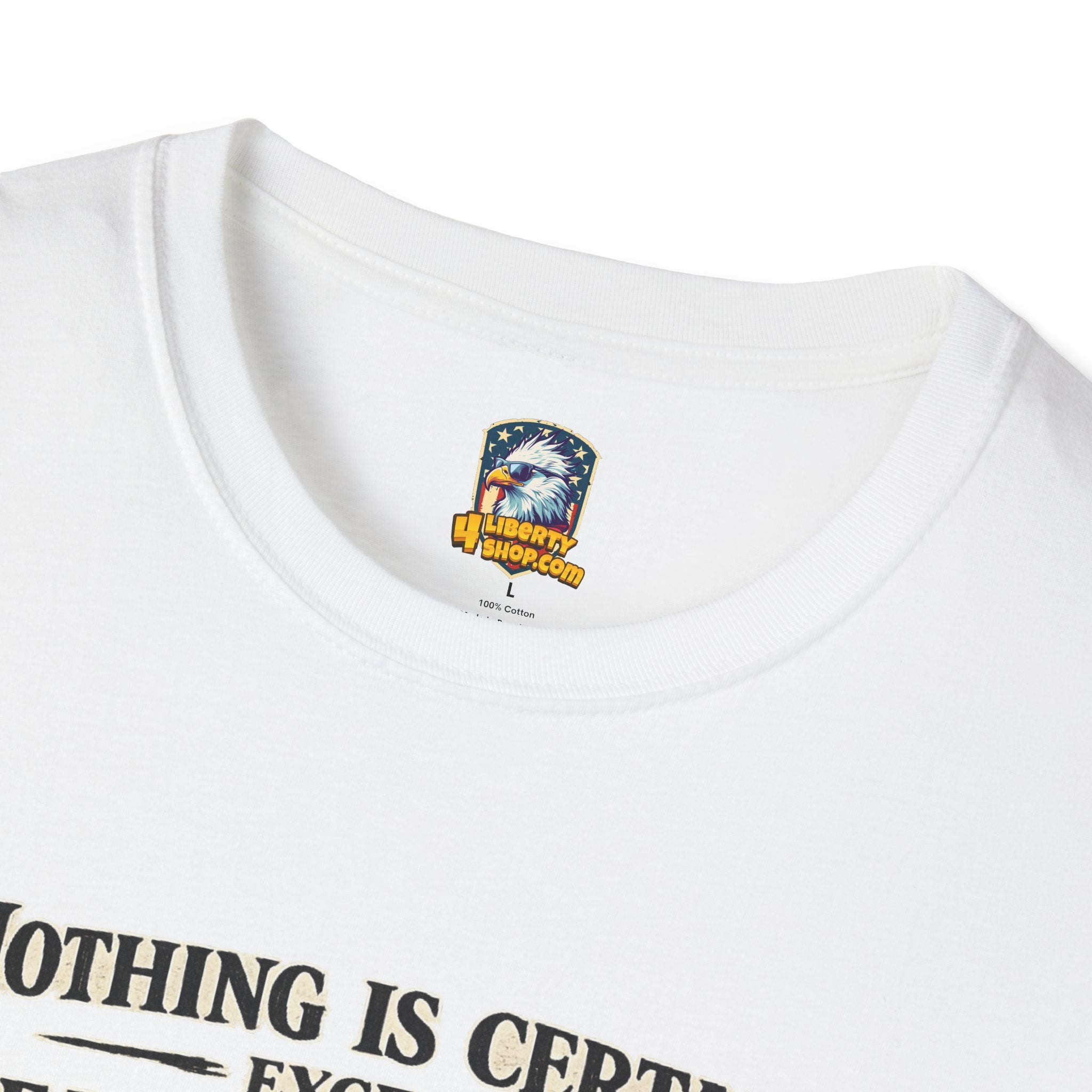 In 1789, Benjamin Franklin penned one of history's most enduring observations: "Nothing is certain except death and taxes." Two centuries later, that wry wisdom still lands with the weight of truth — and this vintage-inspired tee delivers it with skull-and-quill gravitas. Designed for the liberty-minded realist who appreciates Franklin's blend of humor, intellect, and unflinching honesty, this shirt is a walking conversation starter for tax season, election cycles, or any Tuesday when the absurdity of modern governance needs a knowing nod.