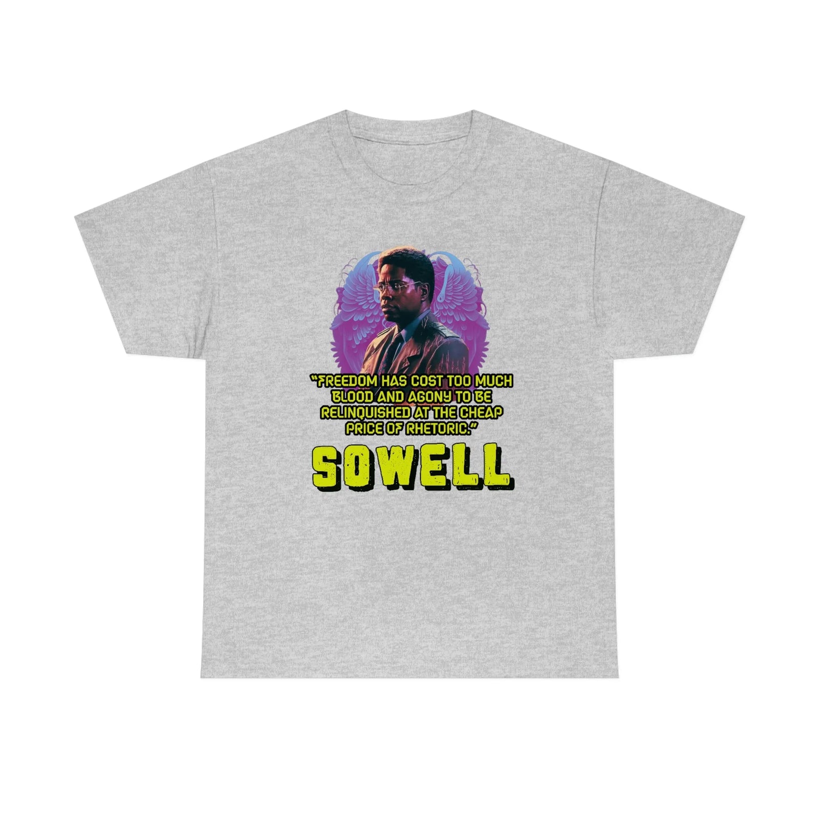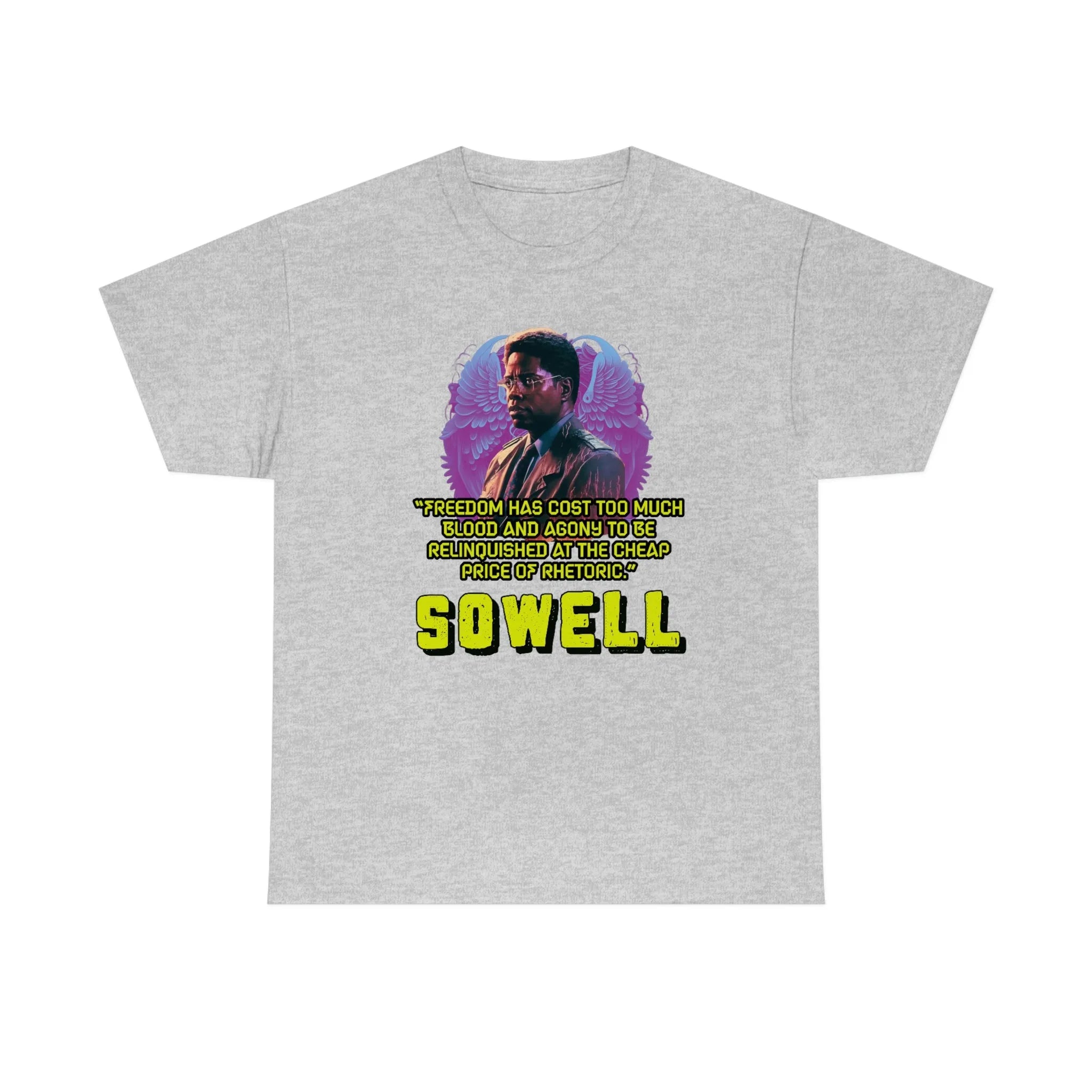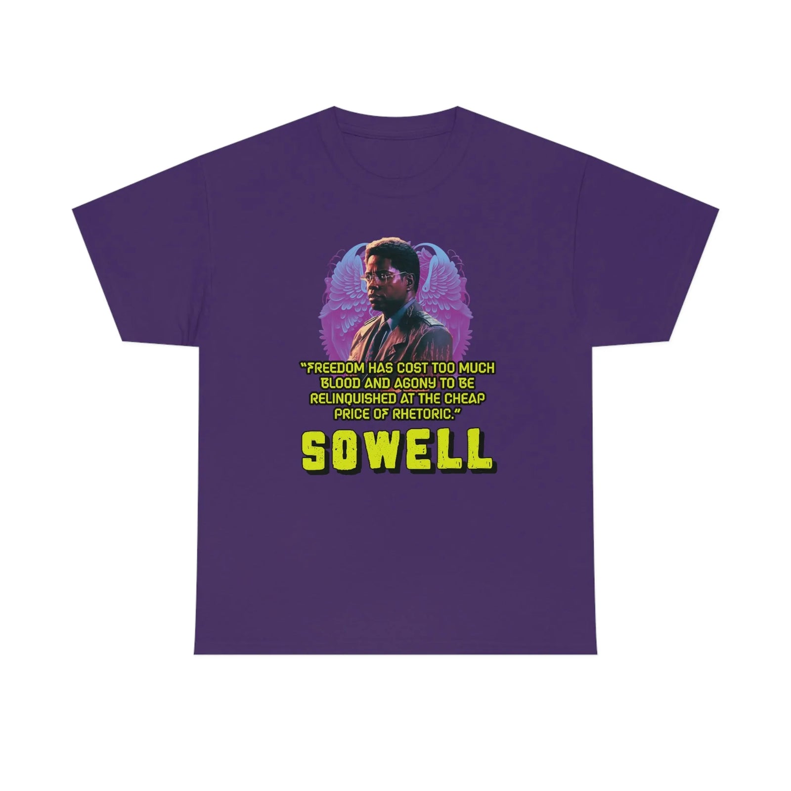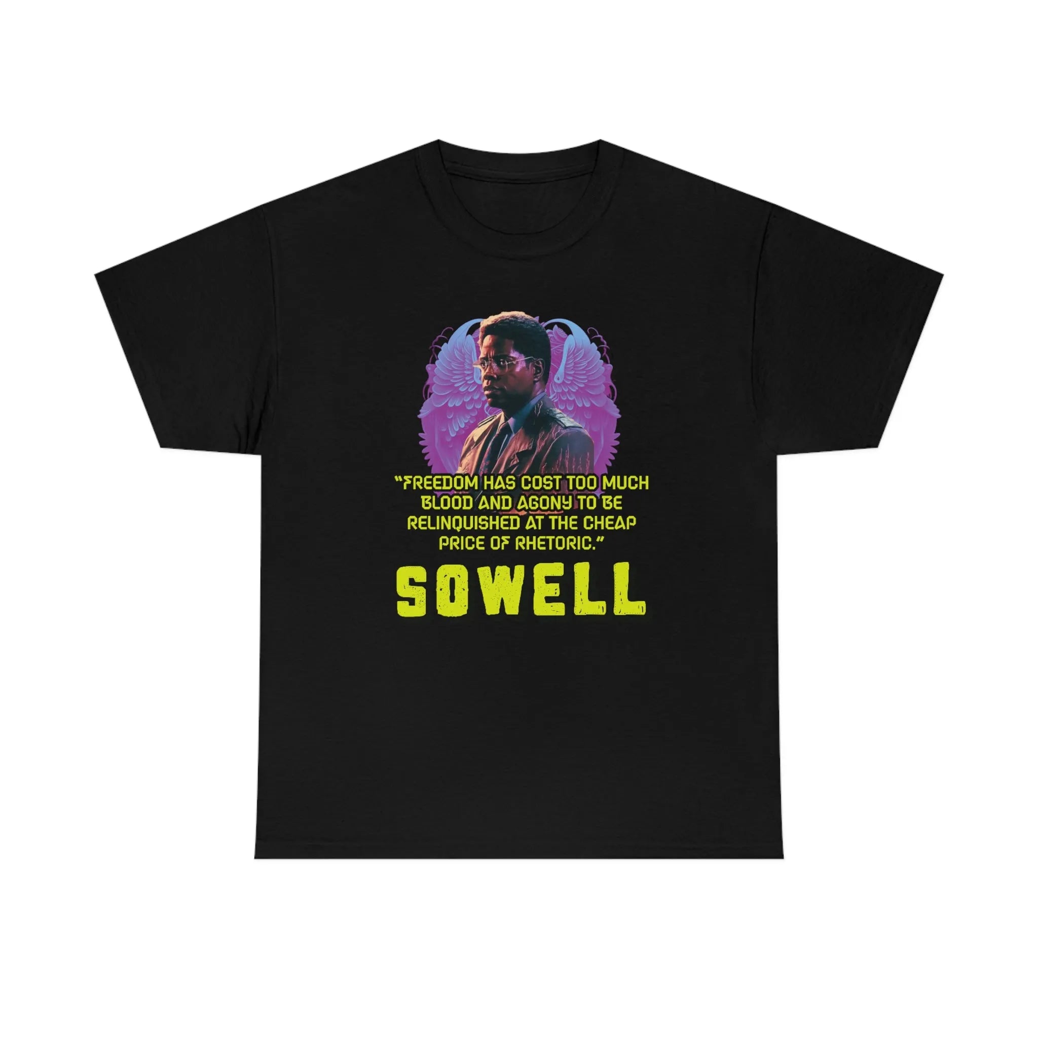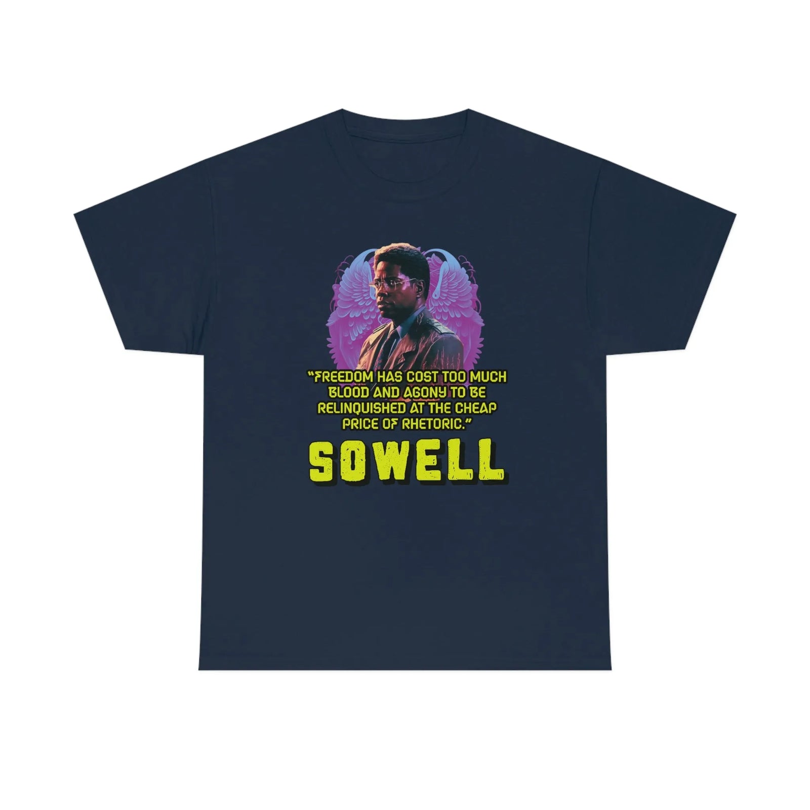 Introducing the ultimate patriotic and libertarian t-shirt, designed in a retro synthwave style and featuring the legendary economist Thomas Sowell and his famous quote: "Freedom has cost too much blood and agony to be relinquished at the cheap price of rhetoric."