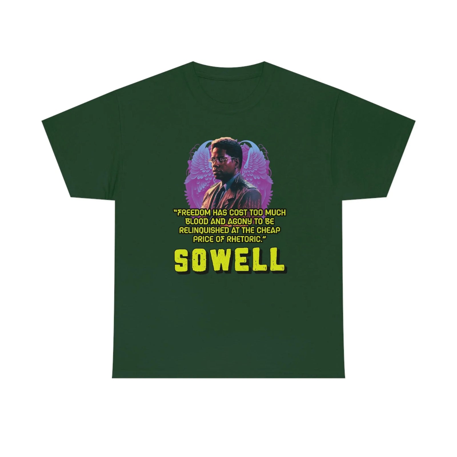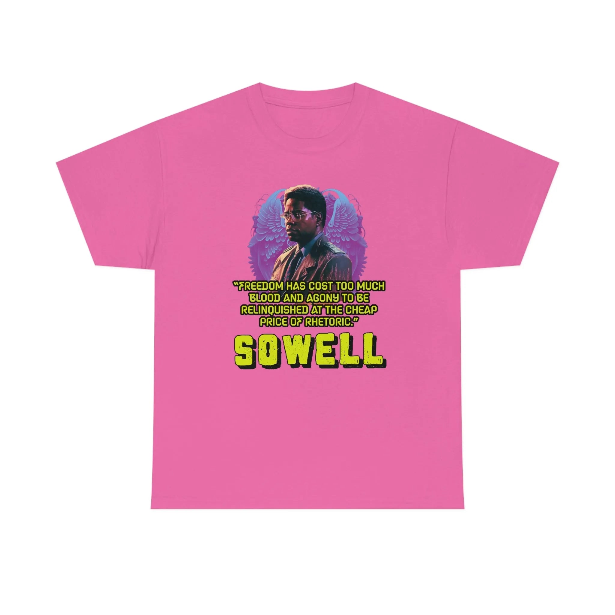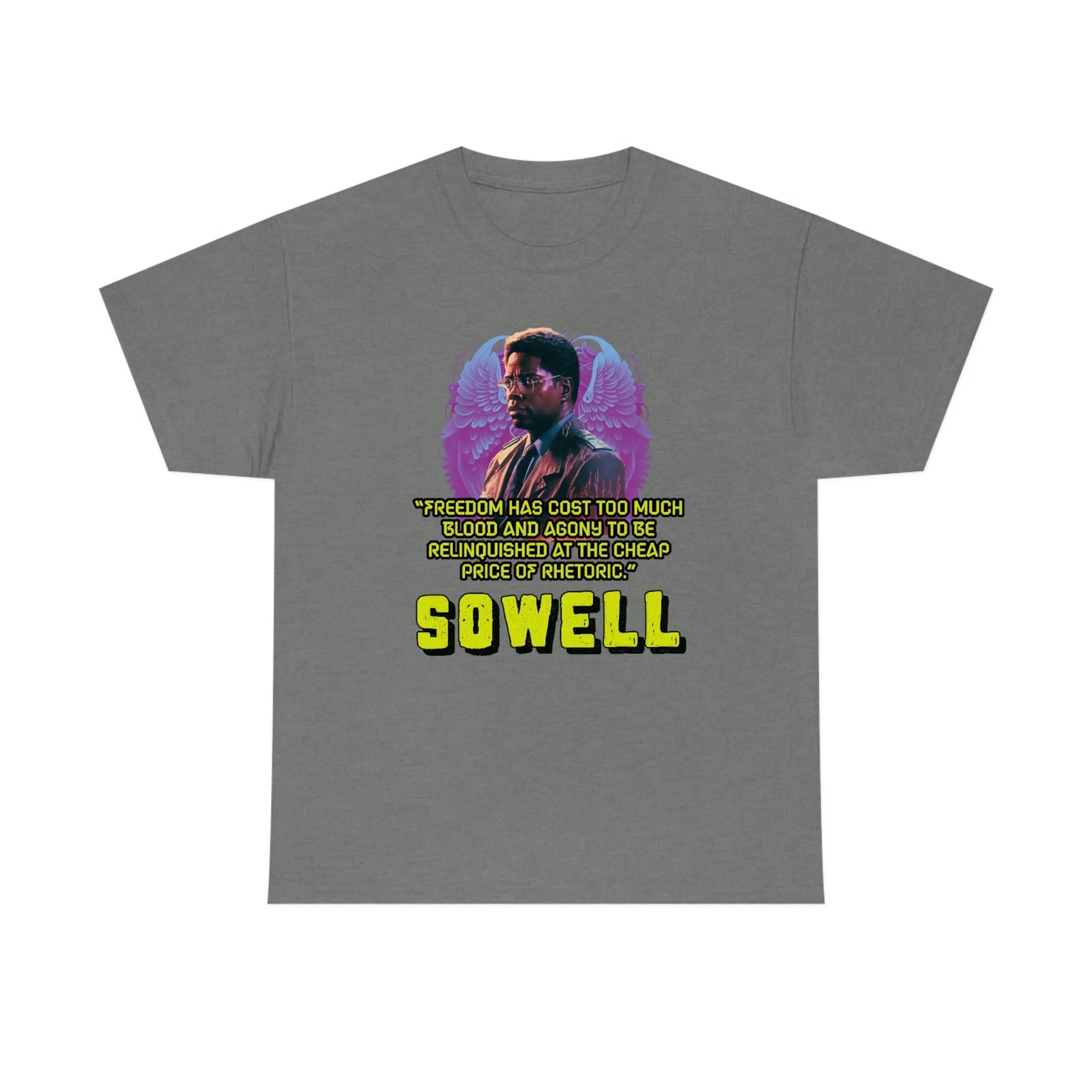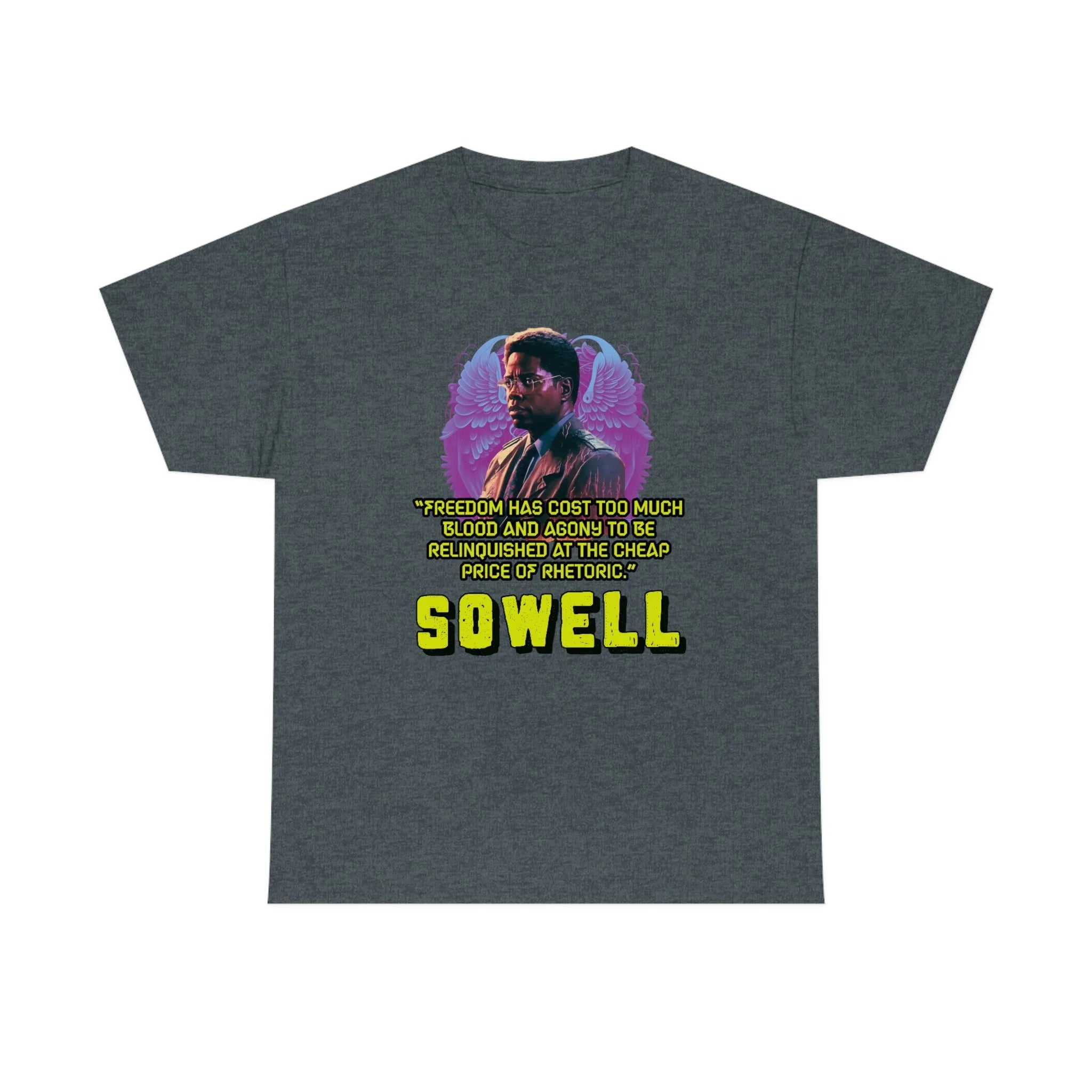Introducing the ultimate patriotic and libertarian t-shirt, designed in a retro synthwave style and featuring the legendary economist Thomas Sowell and his famous quote: "Freedom has cost too much blood and agony to be relinquished at the cheap price of rhetoric."