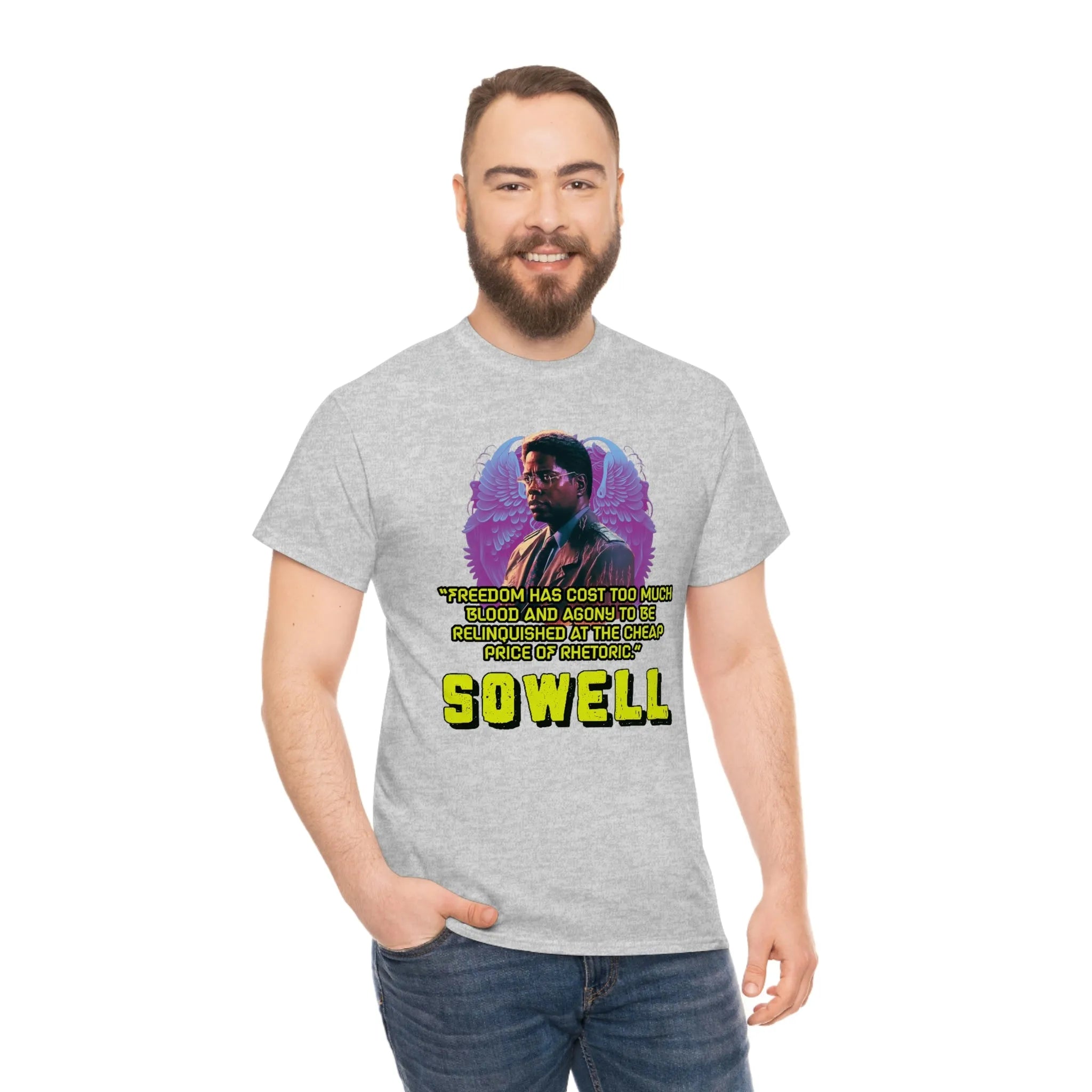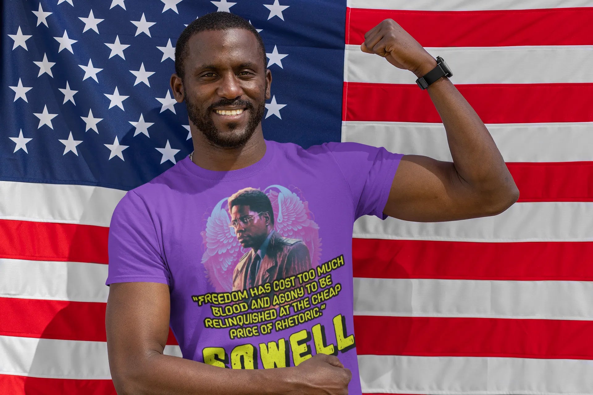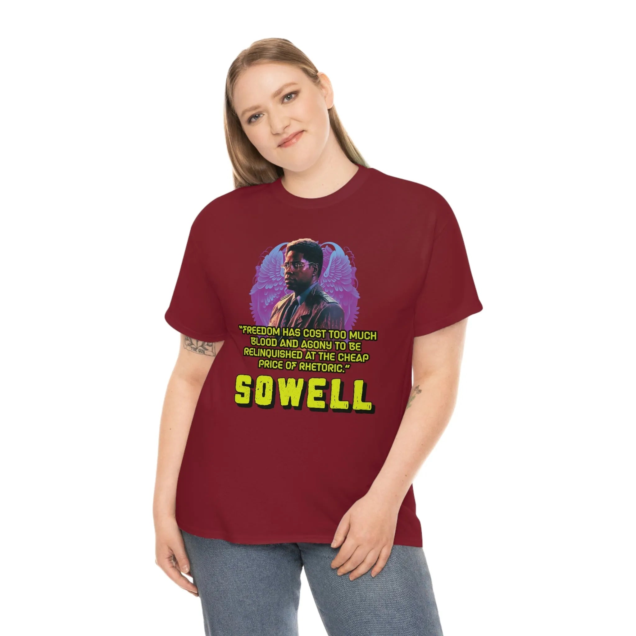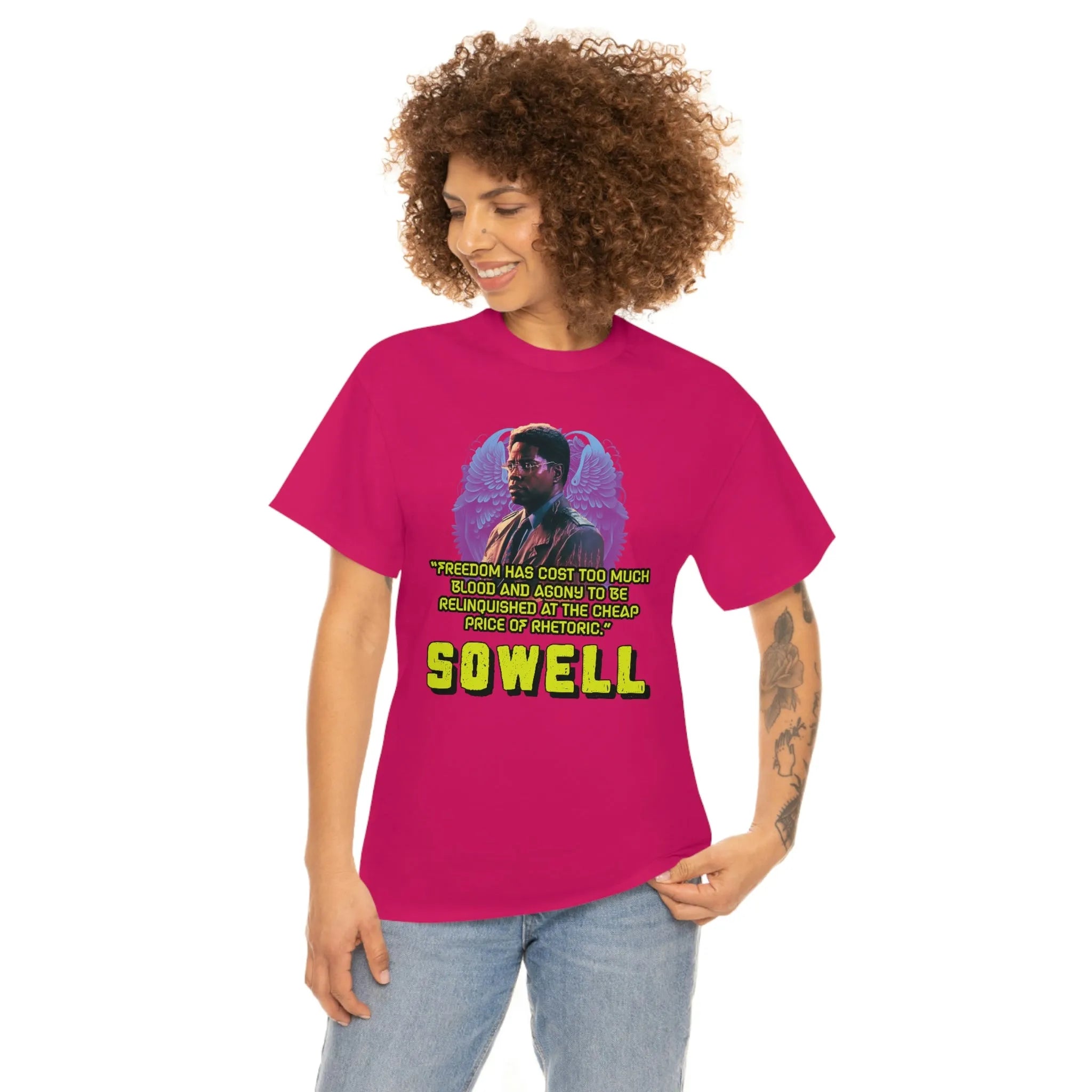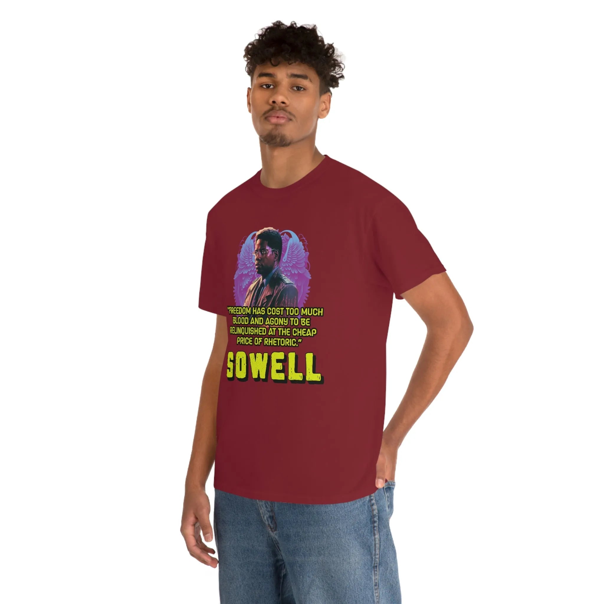 Introducing the ultimate patriotic and libertarian t-shirt, designed in a retro synthwave style and featuring the legendary economist Thomas Sowell and his famous quote: "Freedom has cost too much blood and agony to be relinquished at the cheap price of rhetoric."