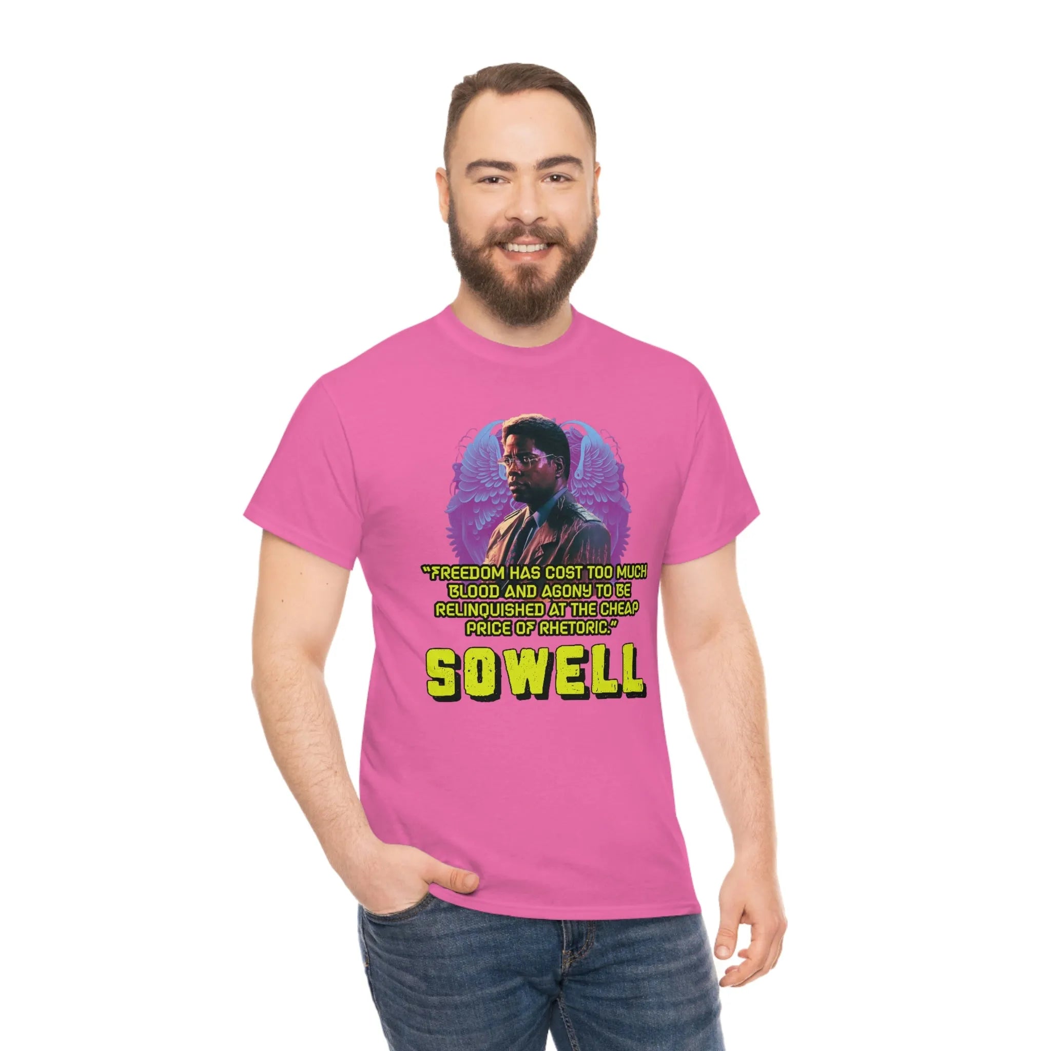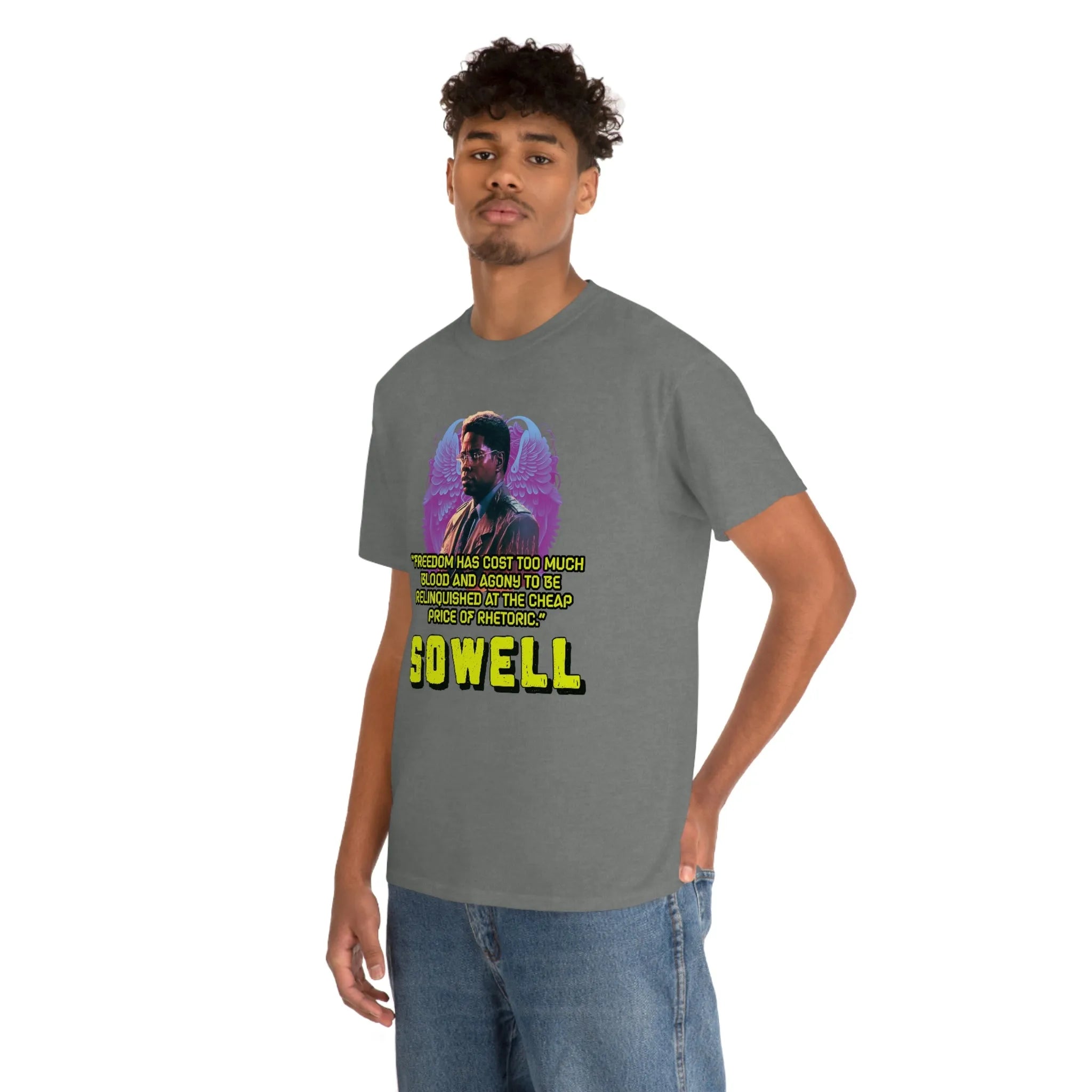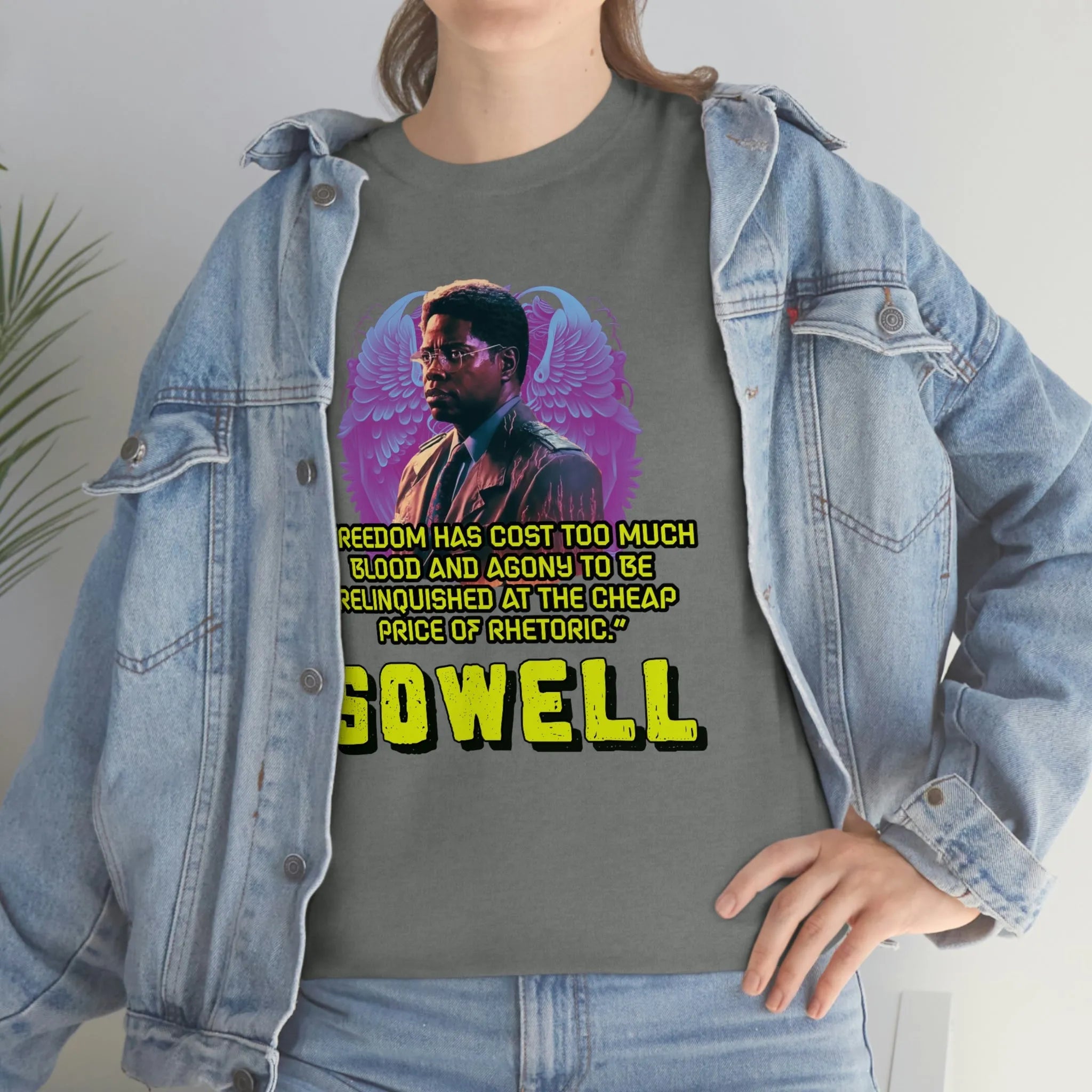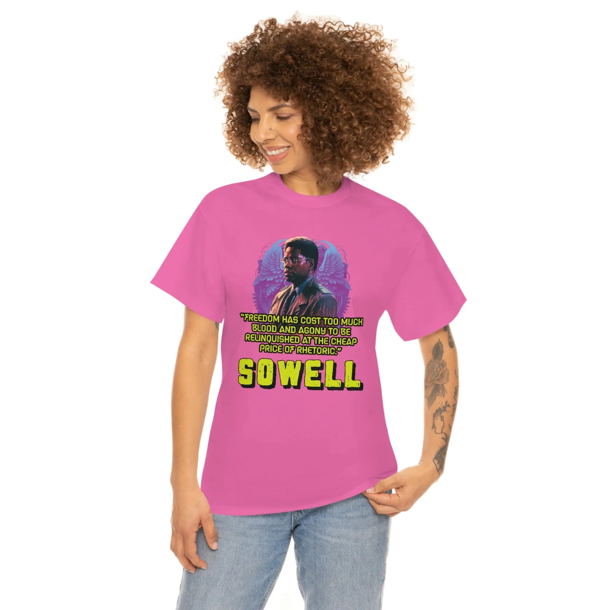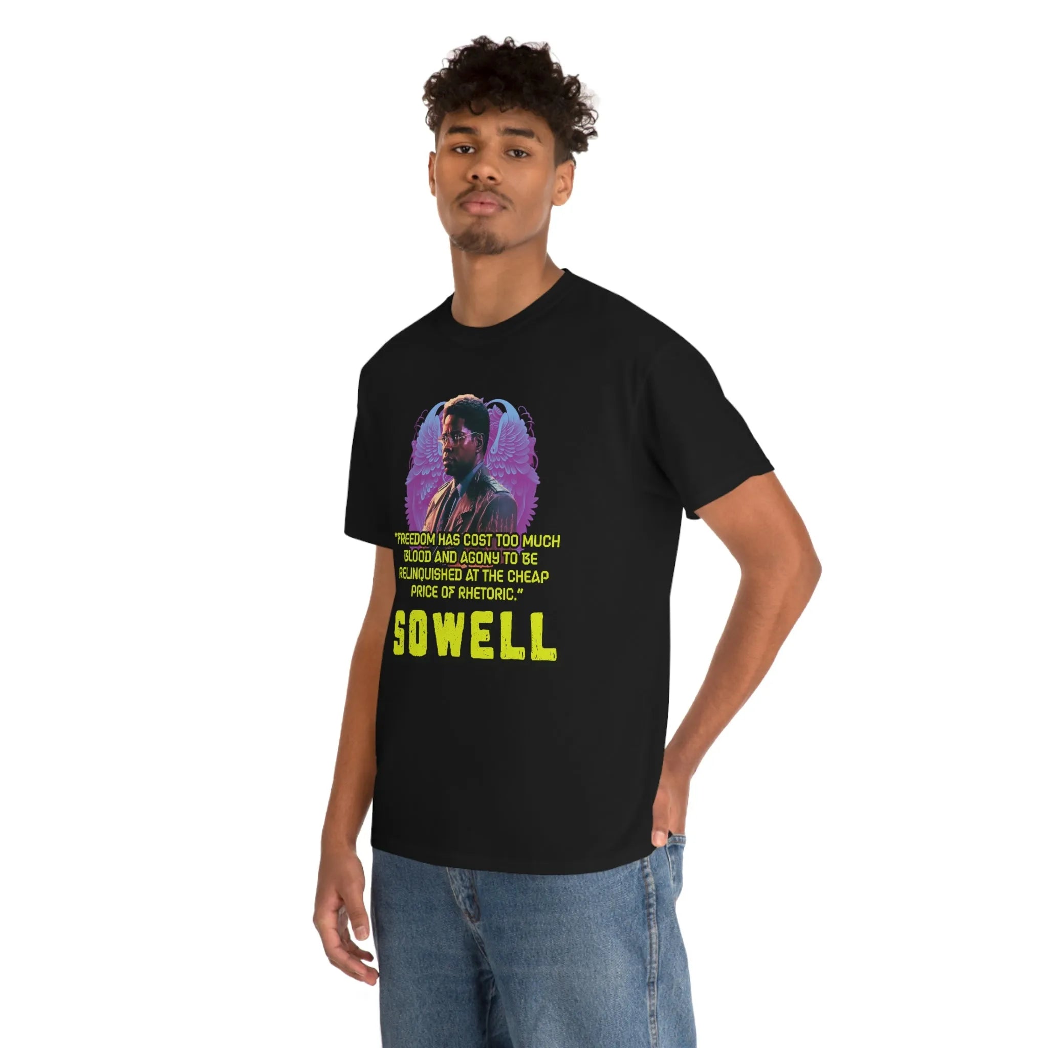 Introducing the ultimate patriotic and libertarian t-shirt, designed in a retro synthwave style and featuring the legendary economist Thomas Sowell and his famous quote: "Freedom has cost too much blood and agony to be relinquished at the cheap price of rhetoric."
