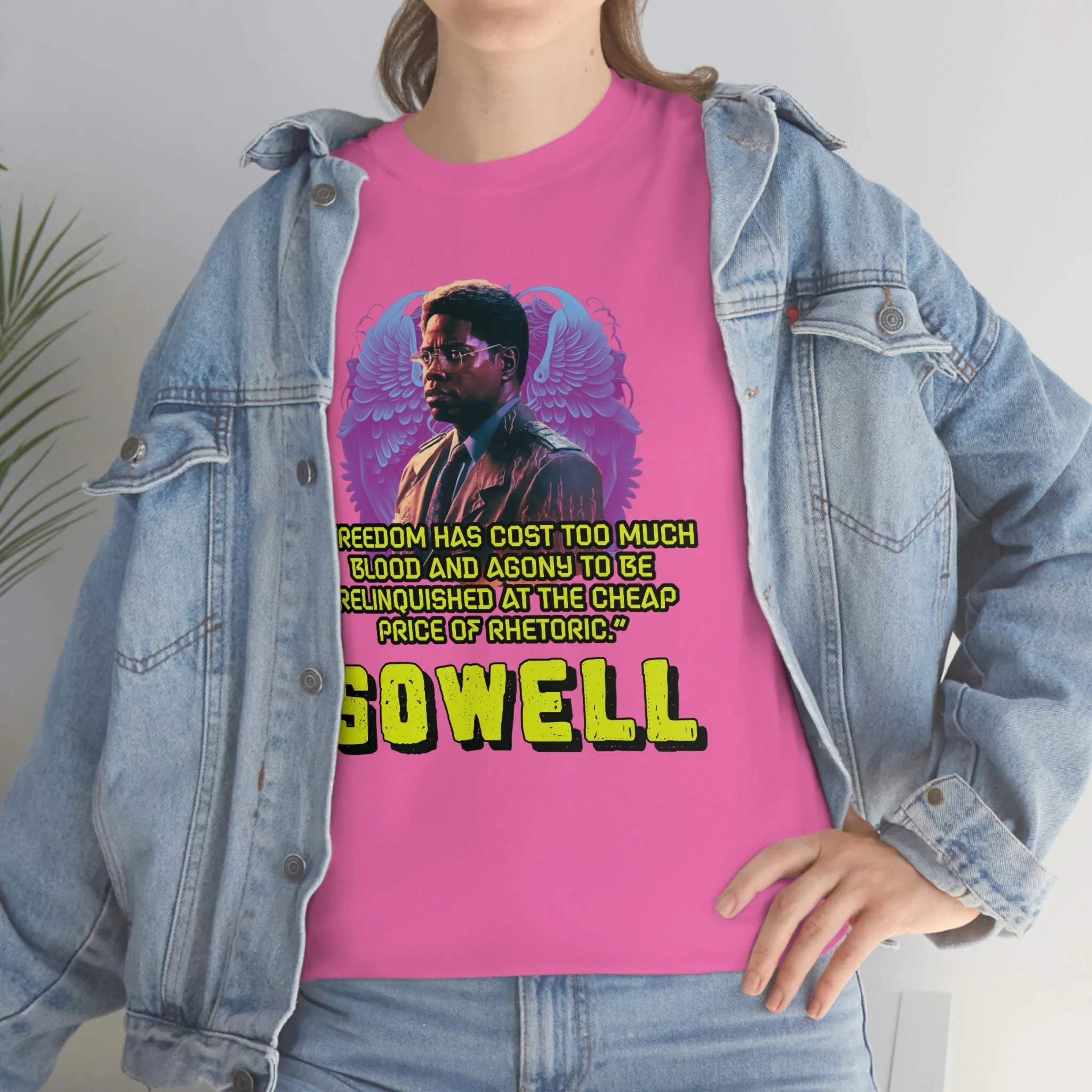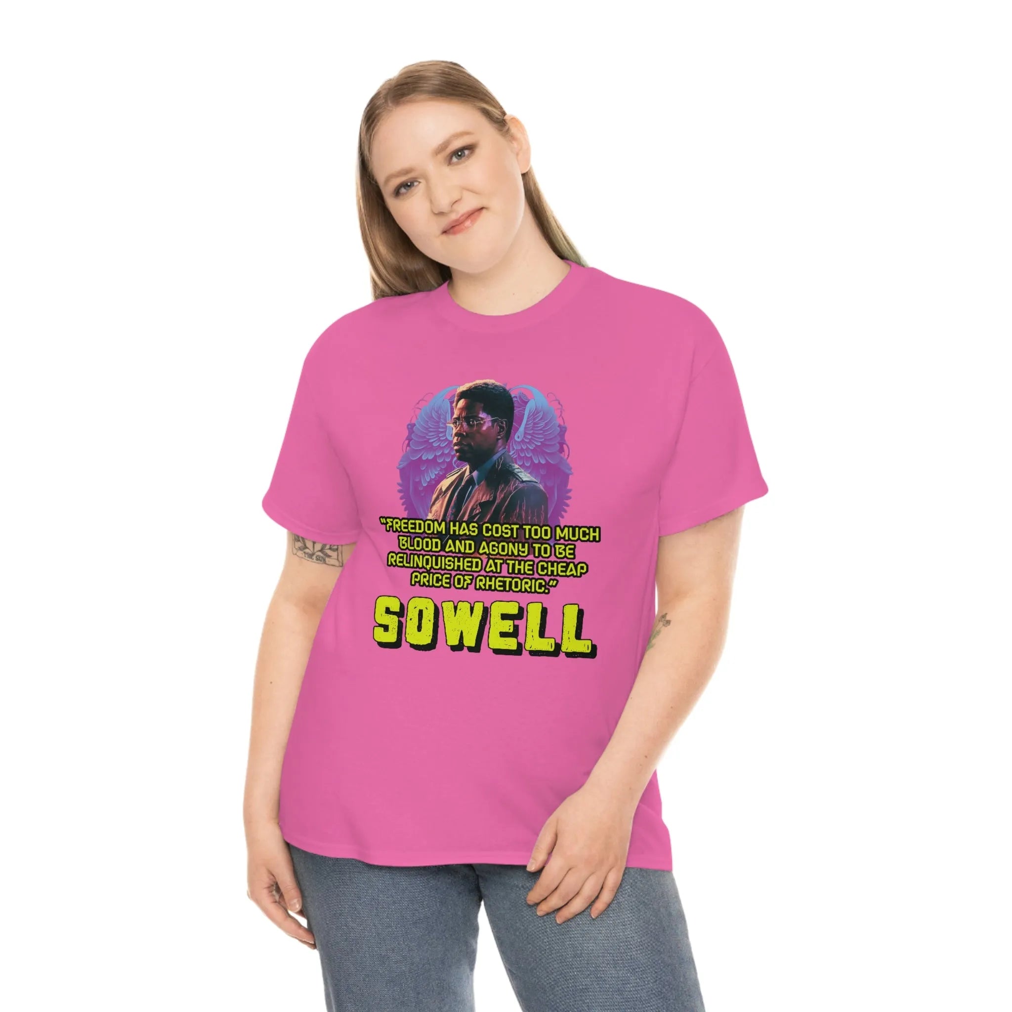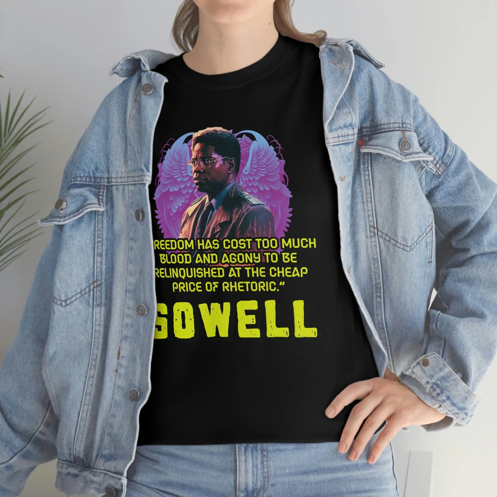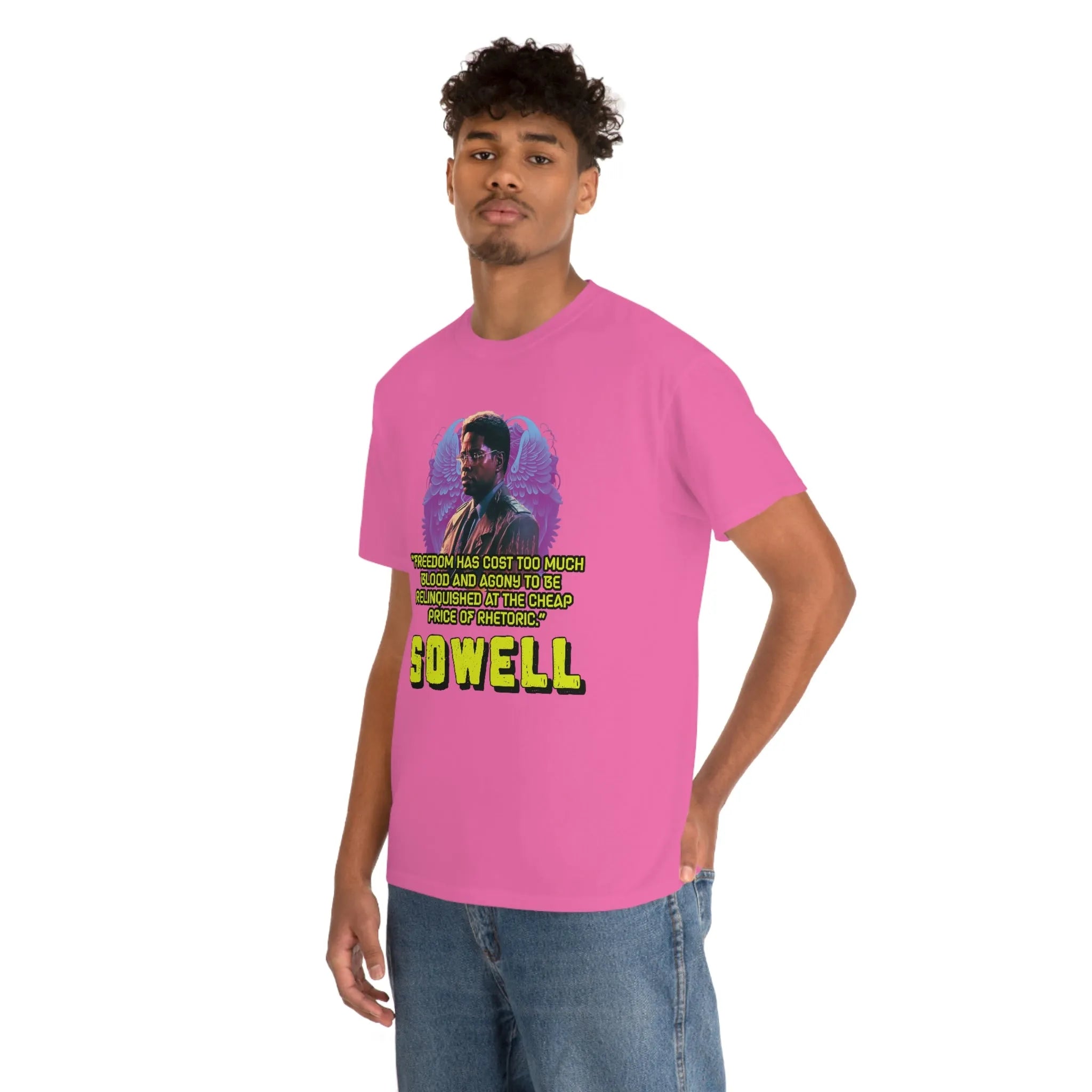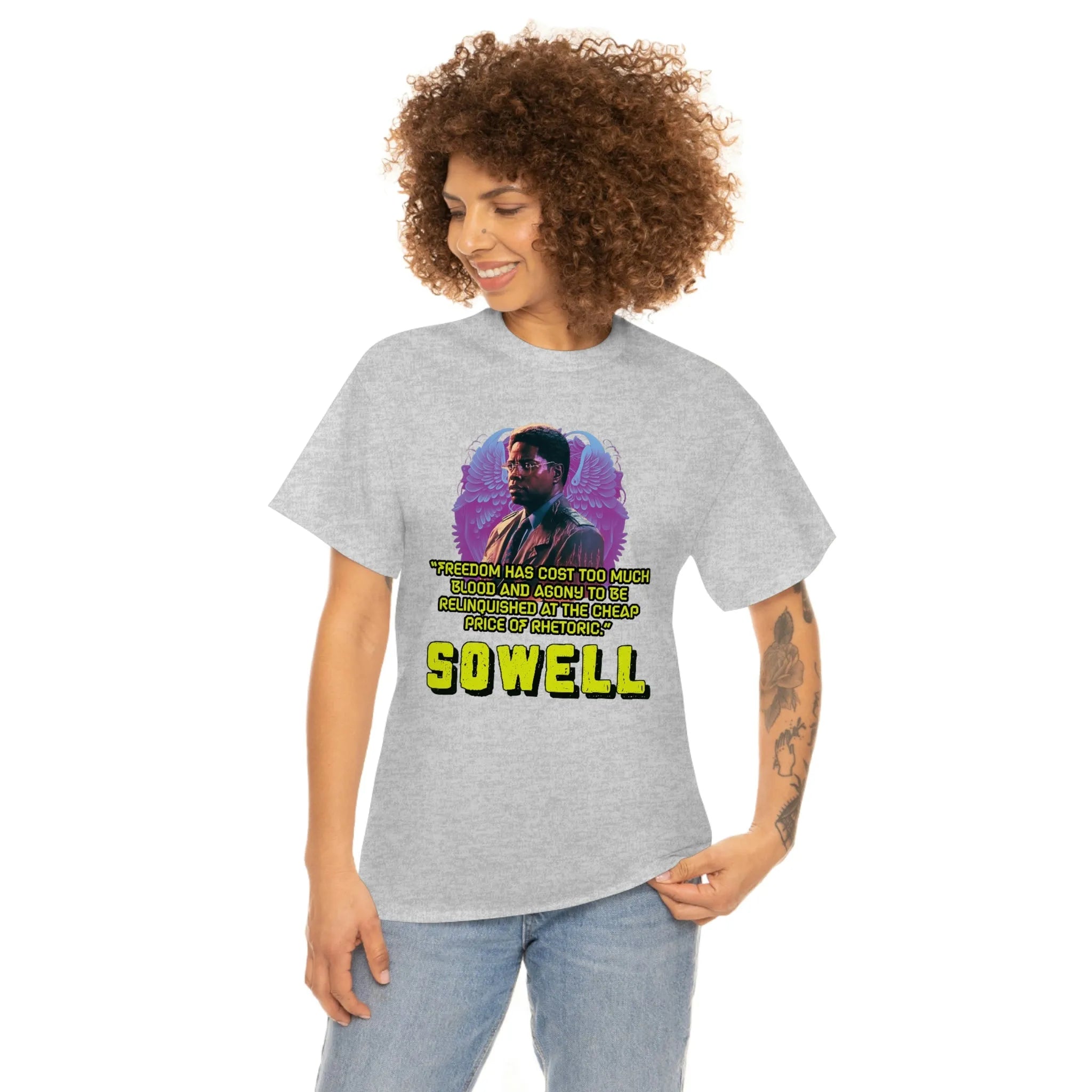 Introducing the ultimate patriotic and libertarian t-shirt, designed in a retro synthwave style and featuring the legendary economist Thomas Sowell and his famous quote: "Freedom has cost too much blood and agony to be relinquished at the cheap price of rhetoric."