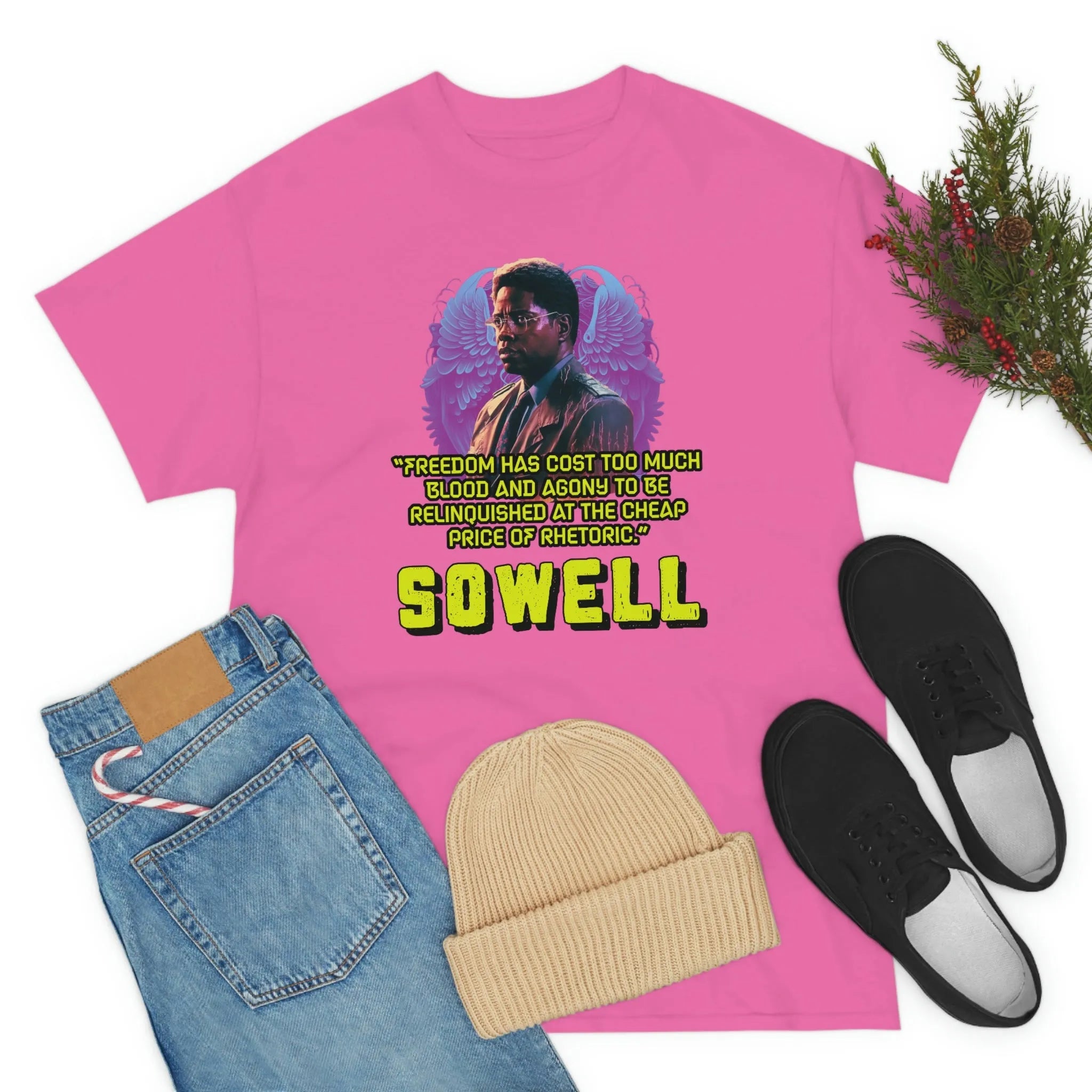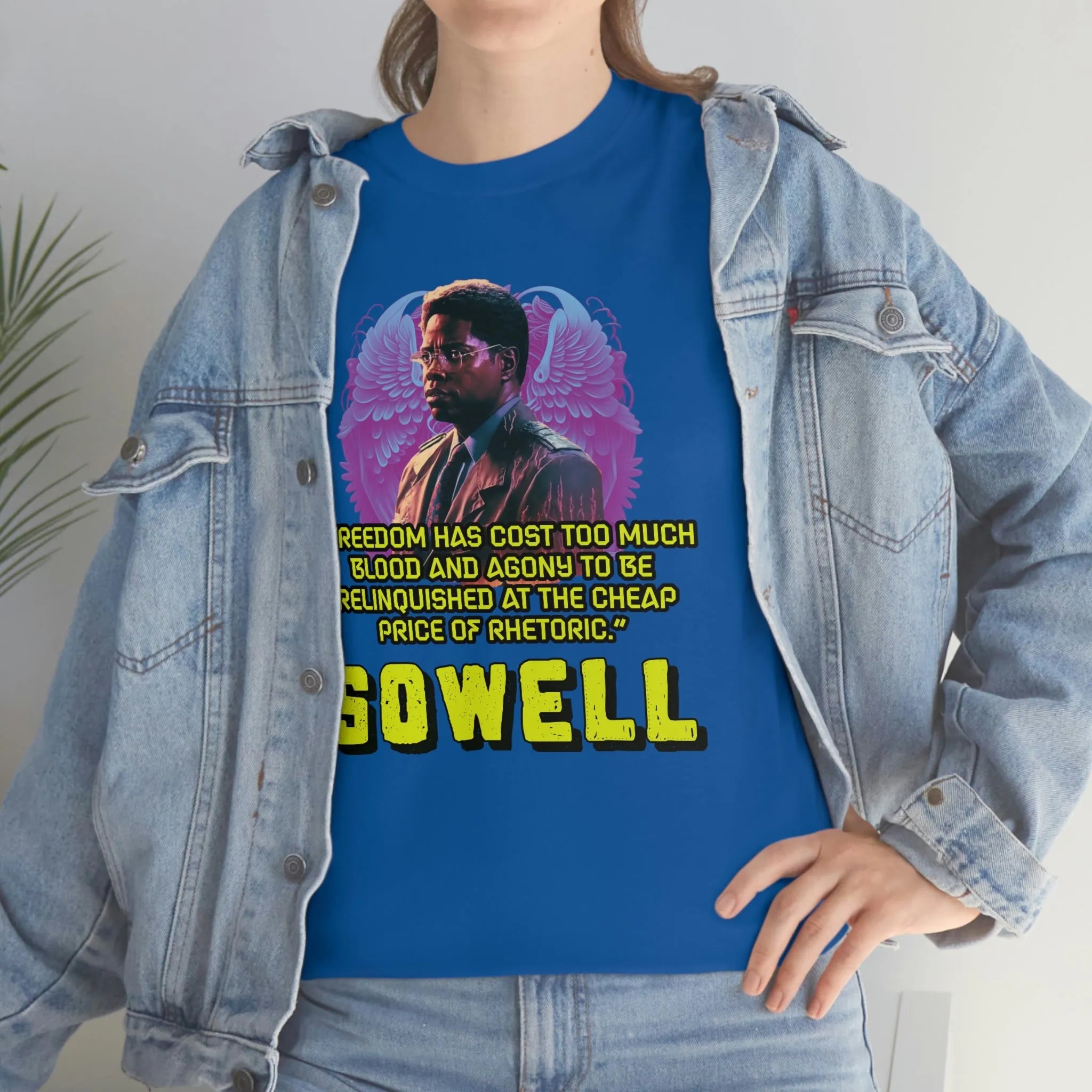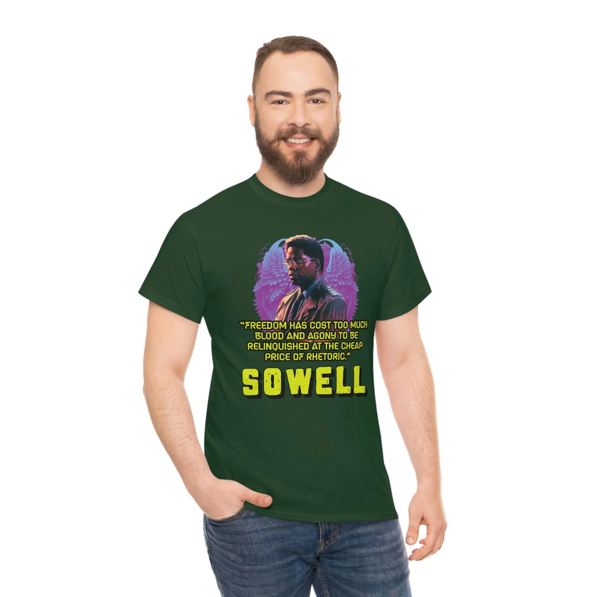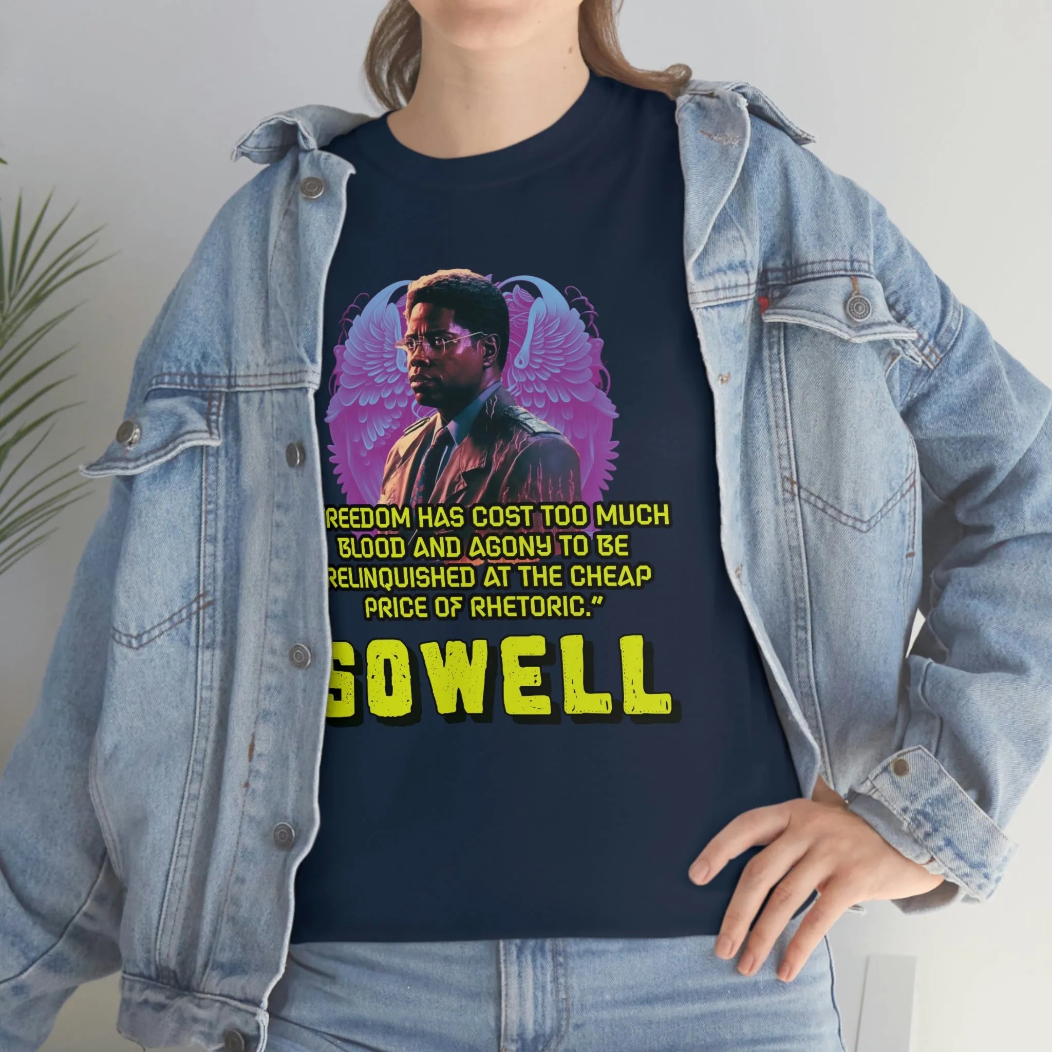 Introducing the ultimate patriotic and libertarian t-shirt, designed in a retro synthwave style and featuring the legendary economist Thomas Sowell and his famous quote: "Freedom has cost too much blood and agony to be relinquished at the cheap price of rhetoric."
