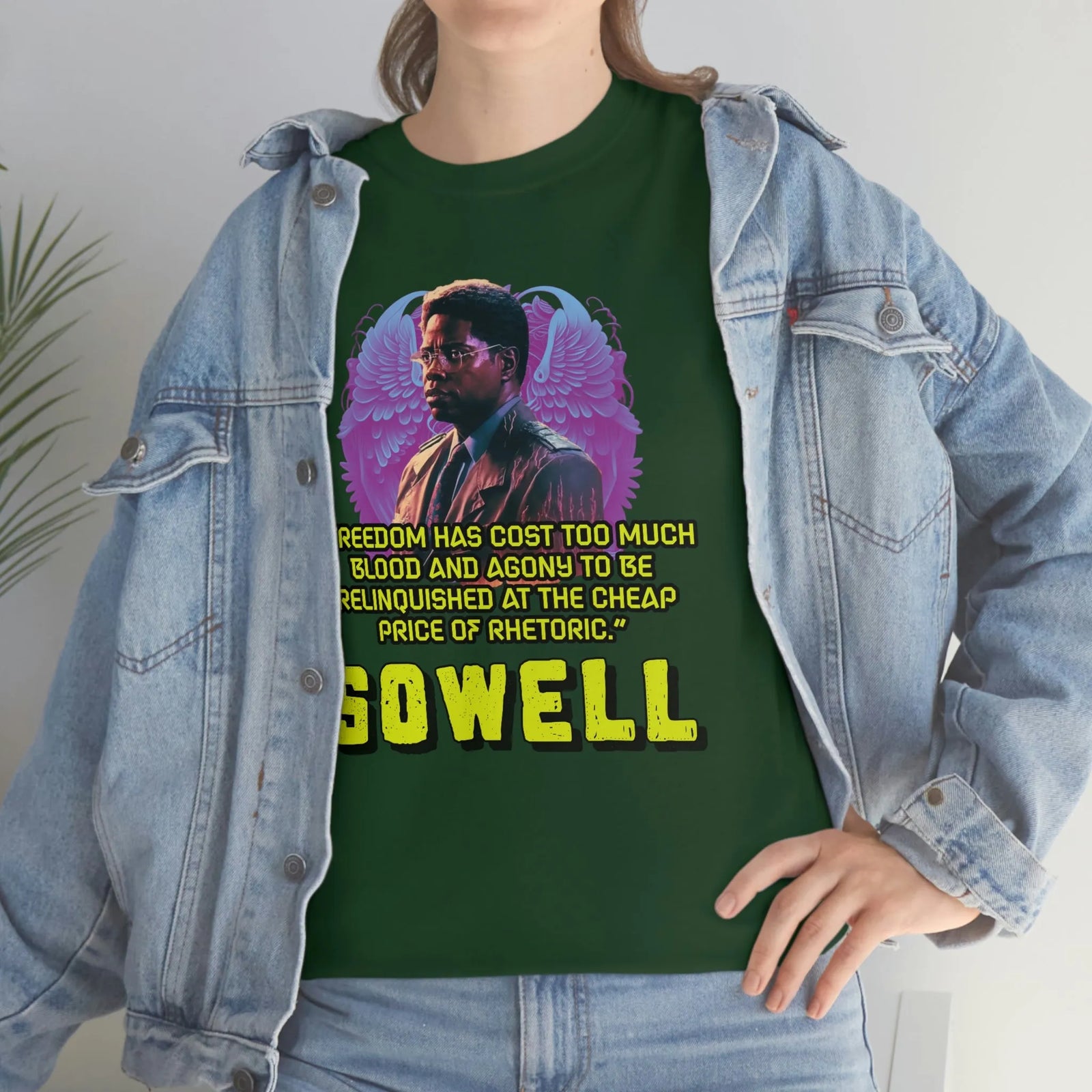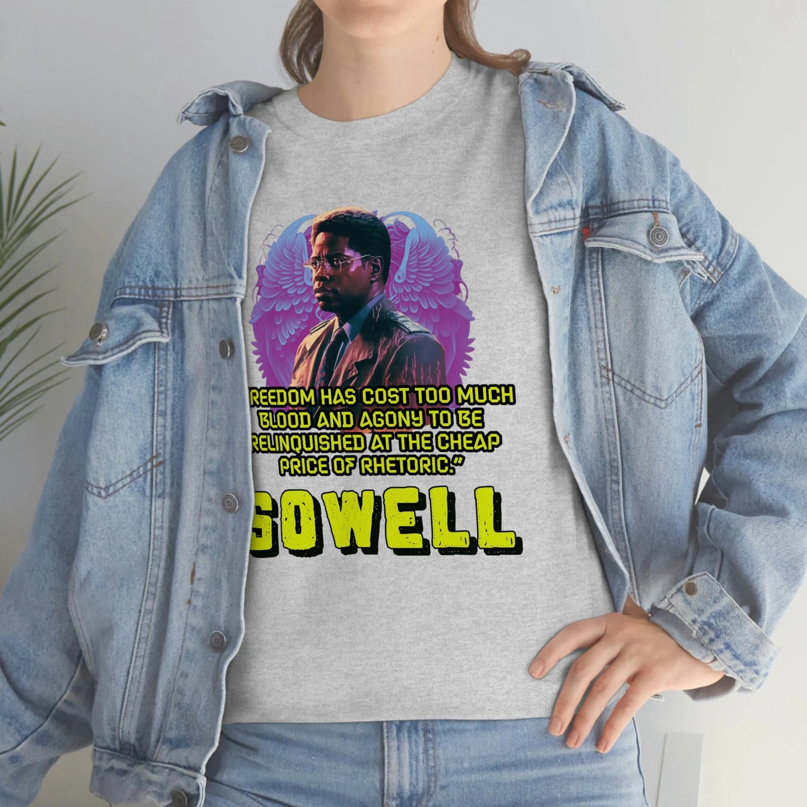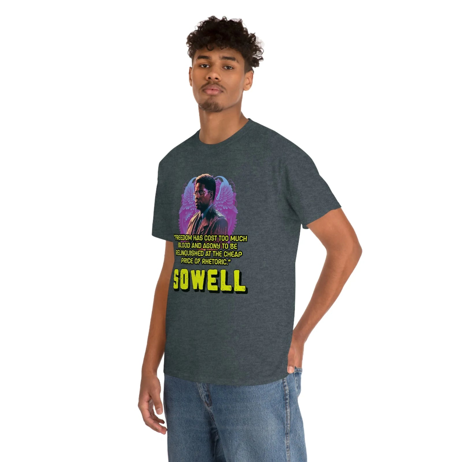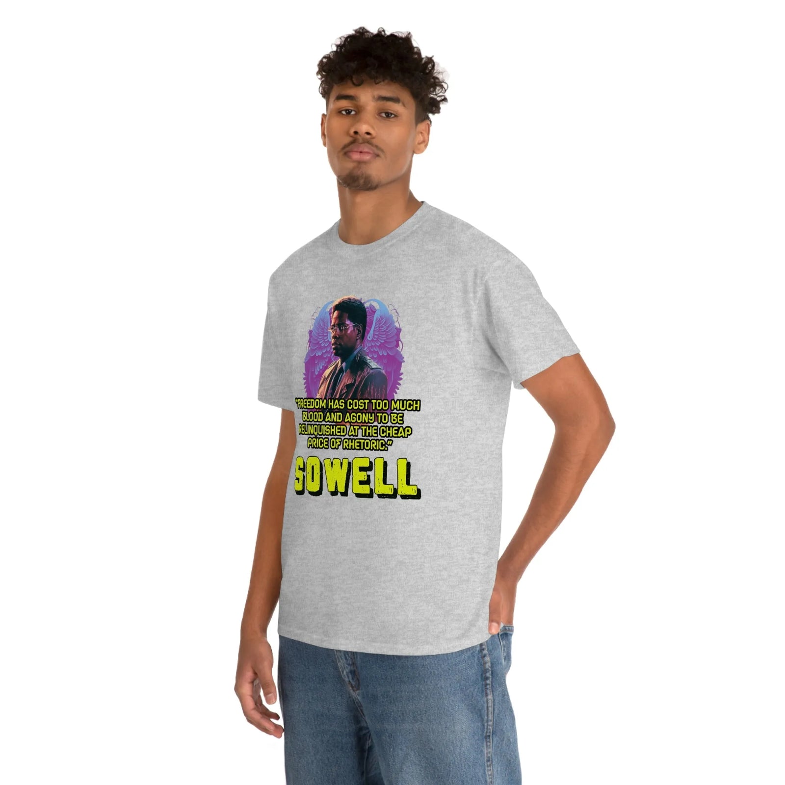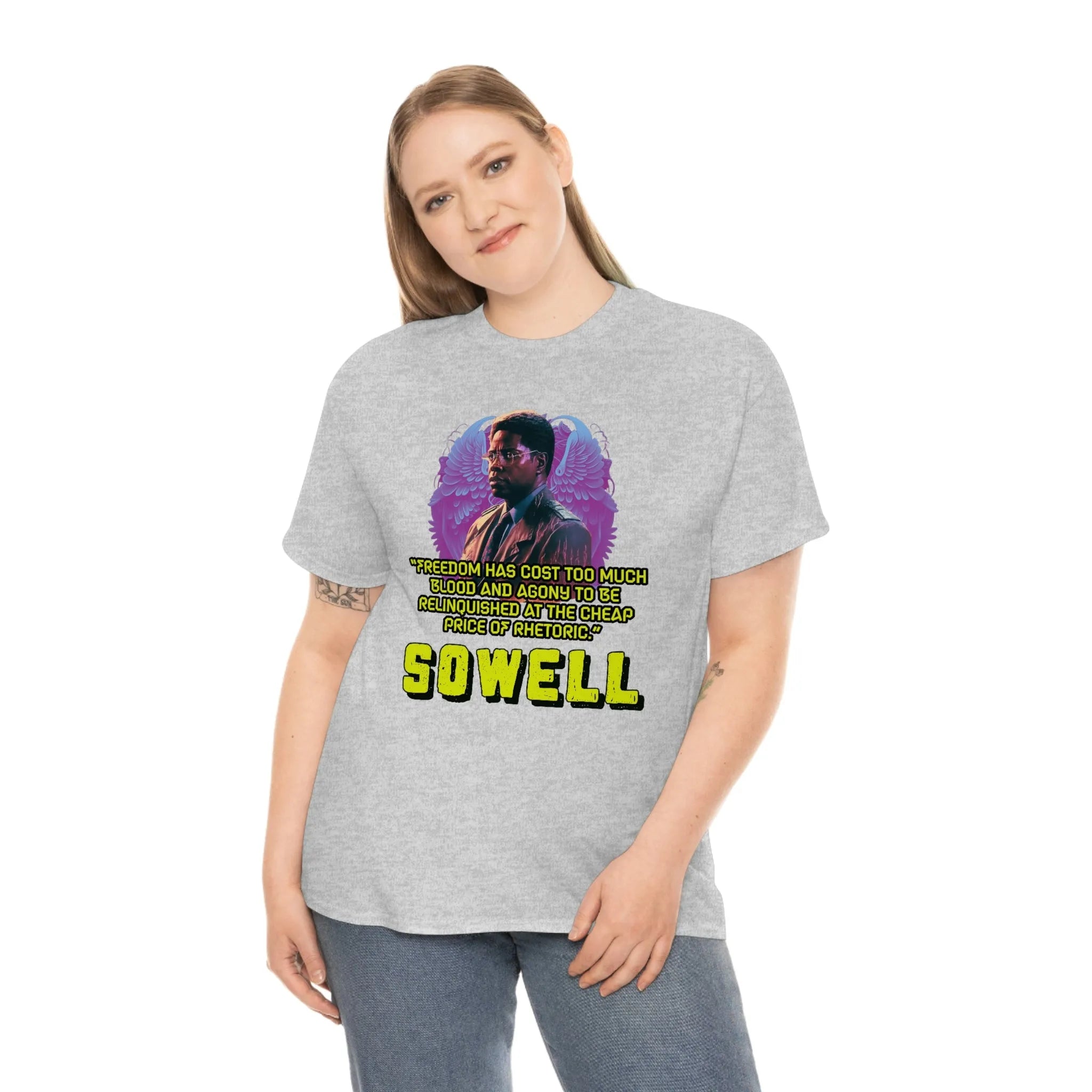 Introducing the ultimate patriotic and libertarian t-shirt, designed in a retro synthwave style and featuring the legendary economist Thomas Sowell and his famous quote: "Freedom has cost too much blood and agony to be relinquished at the cheap price of rhetoric."