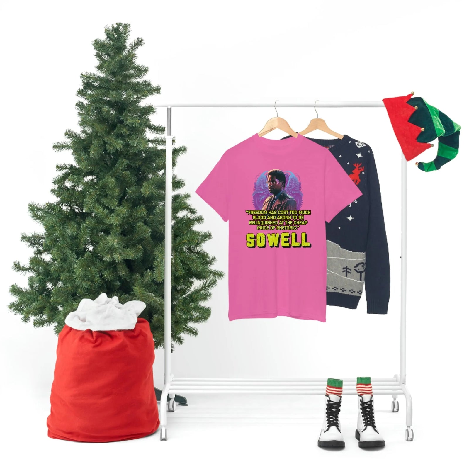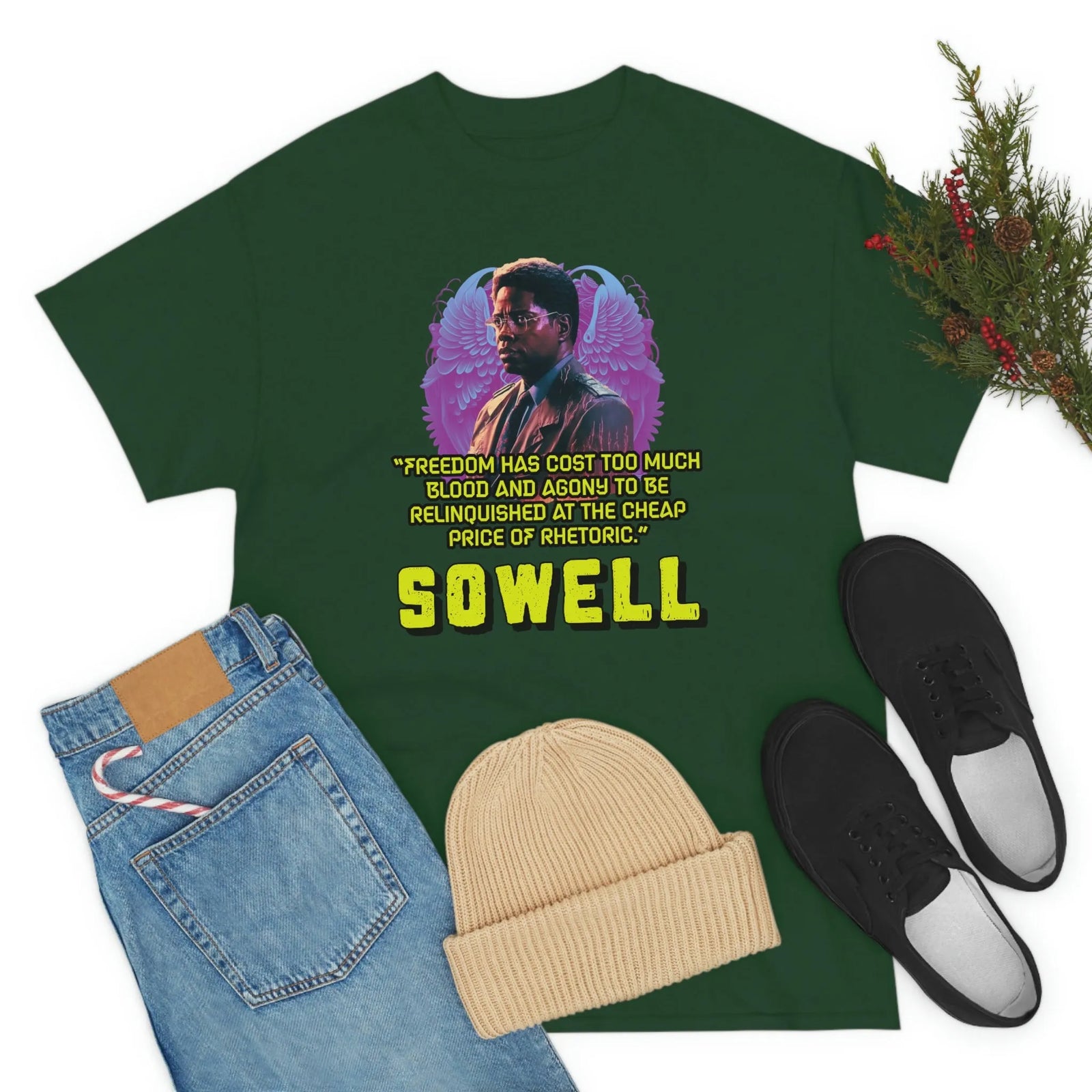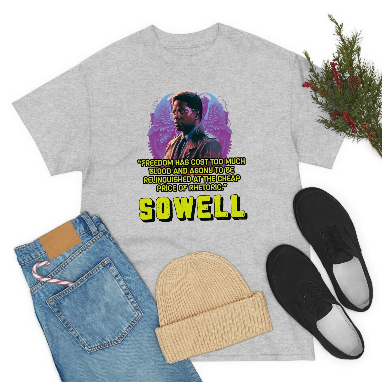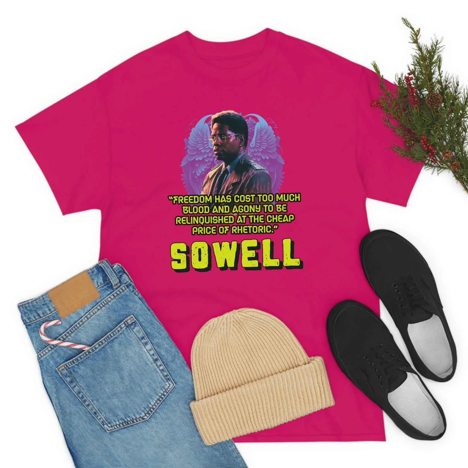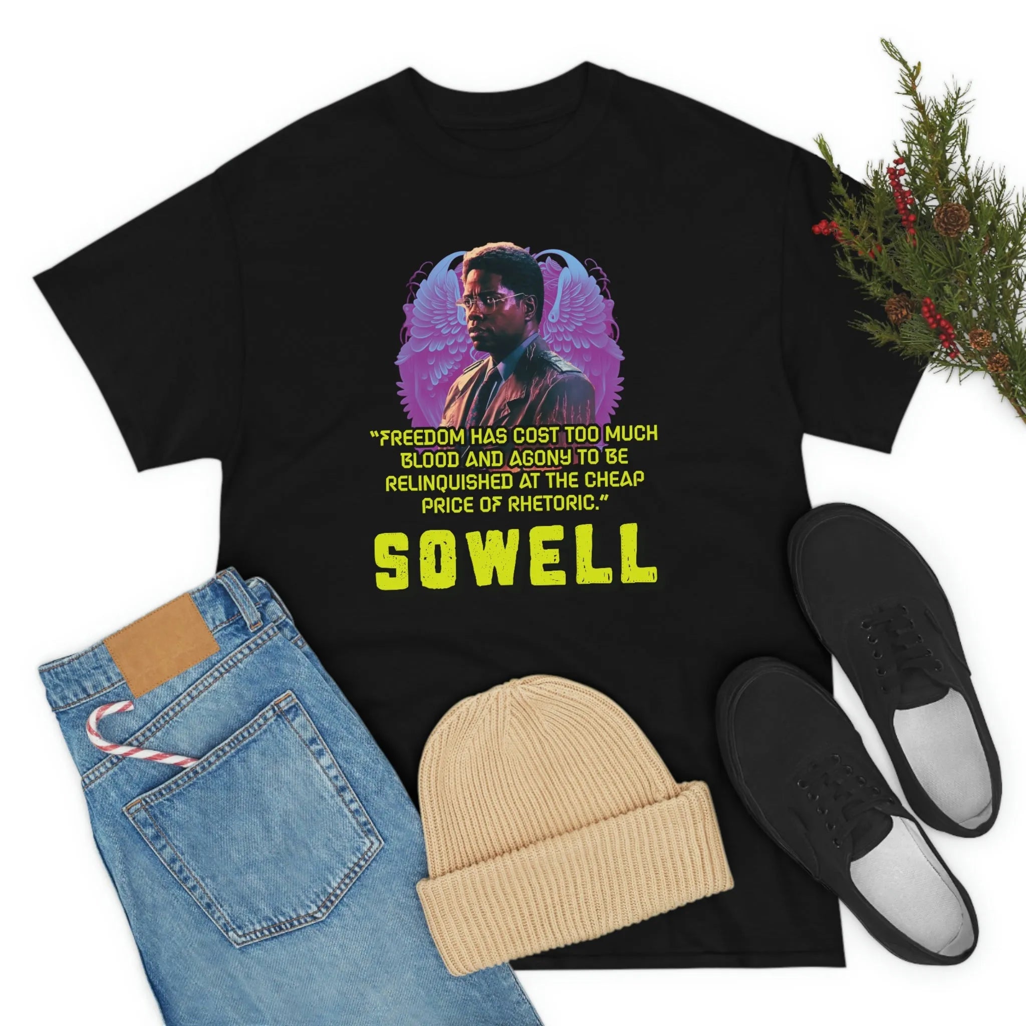 Introducing the ultimate patriotic and libertarian t-shirt, designed in a retro synthwave style and featuring the legendary economist Thomas Sowell and his famous quote: "Freedom has cost too much blood and agony to be relinquished at the cheap price of rhetoric."