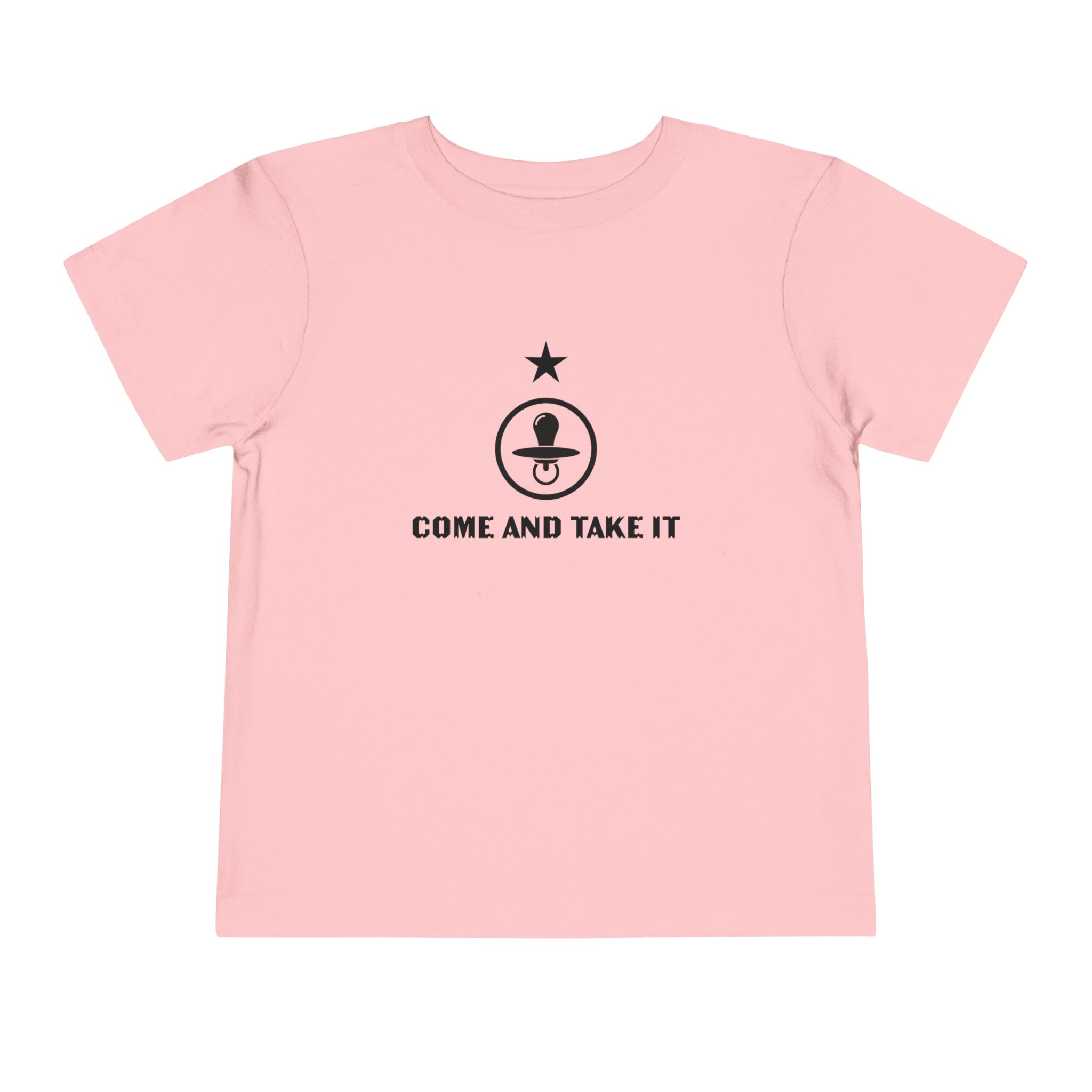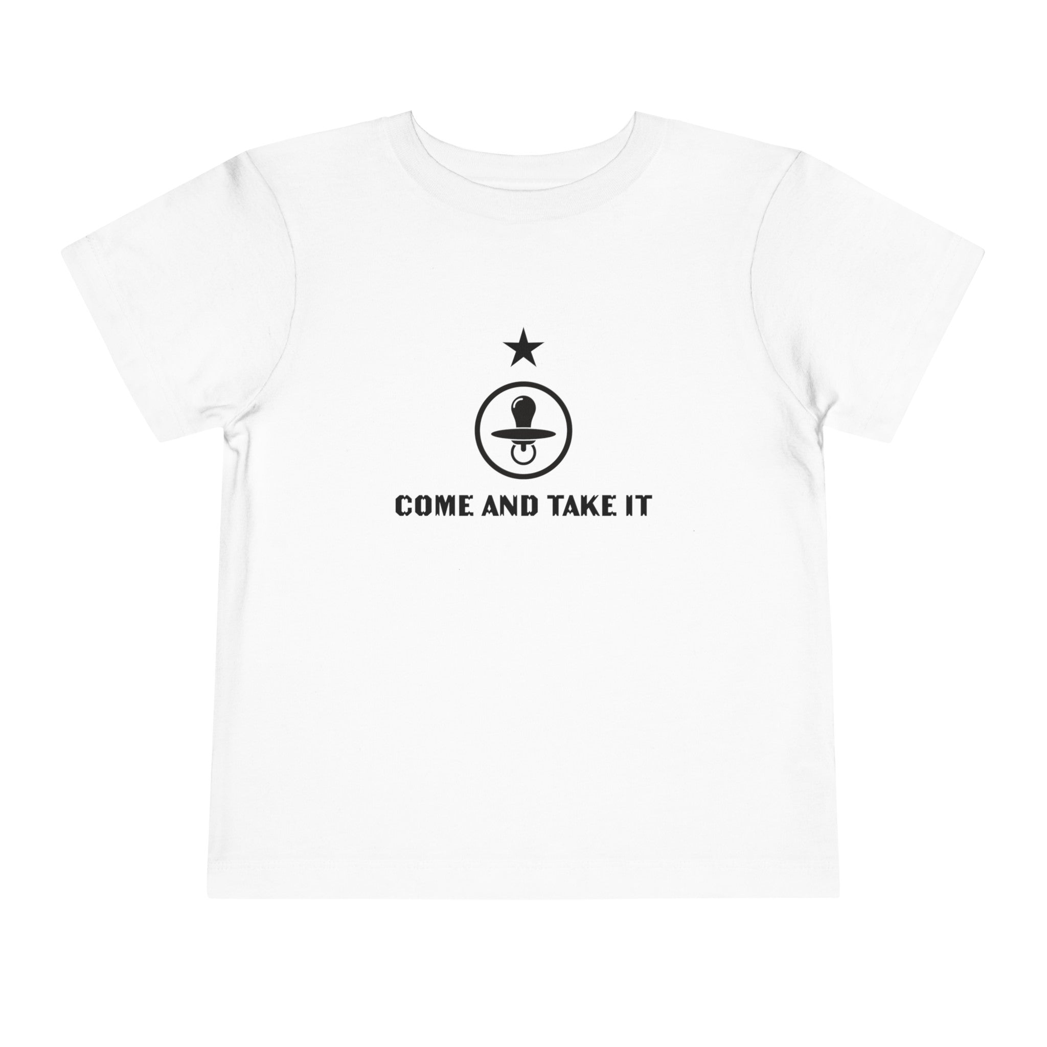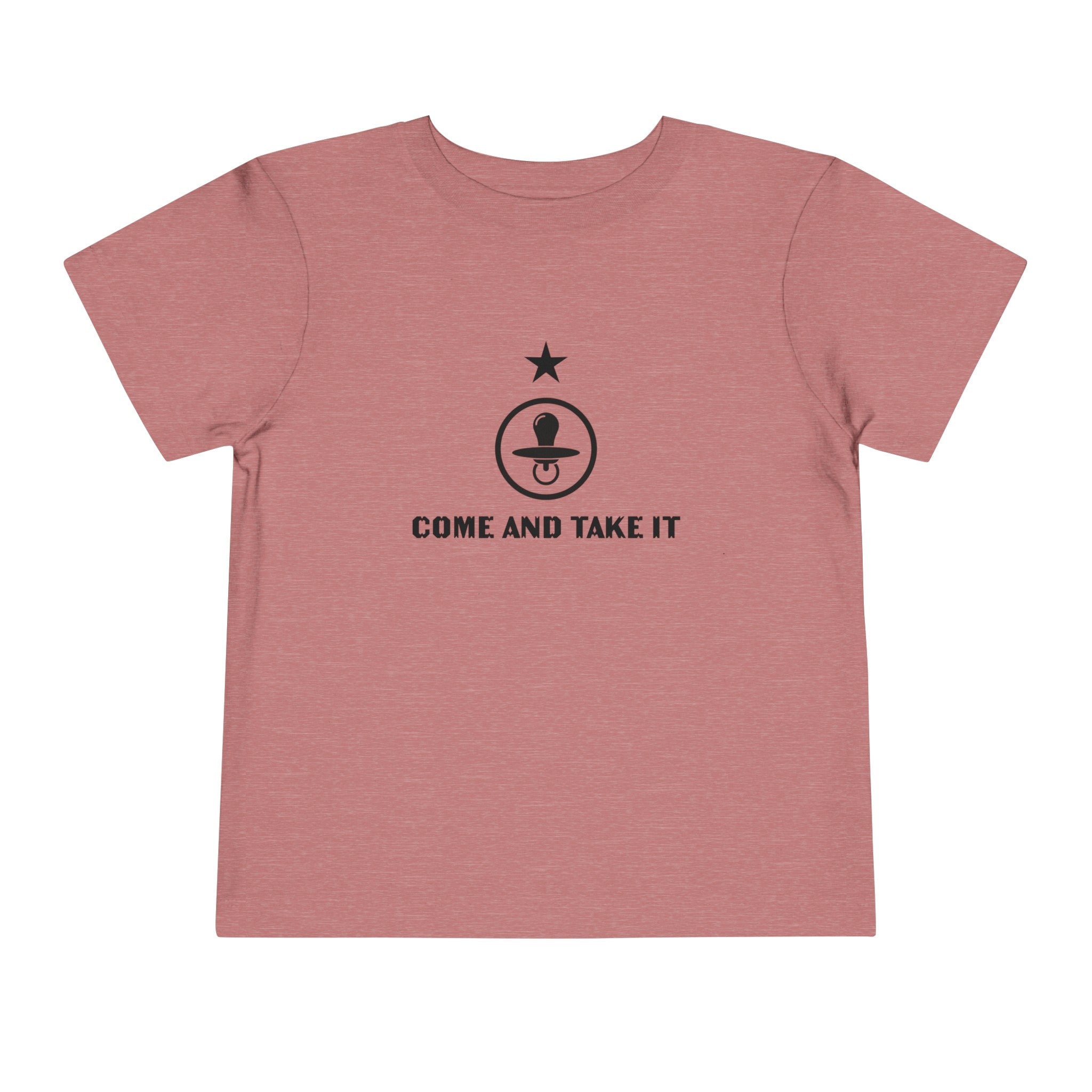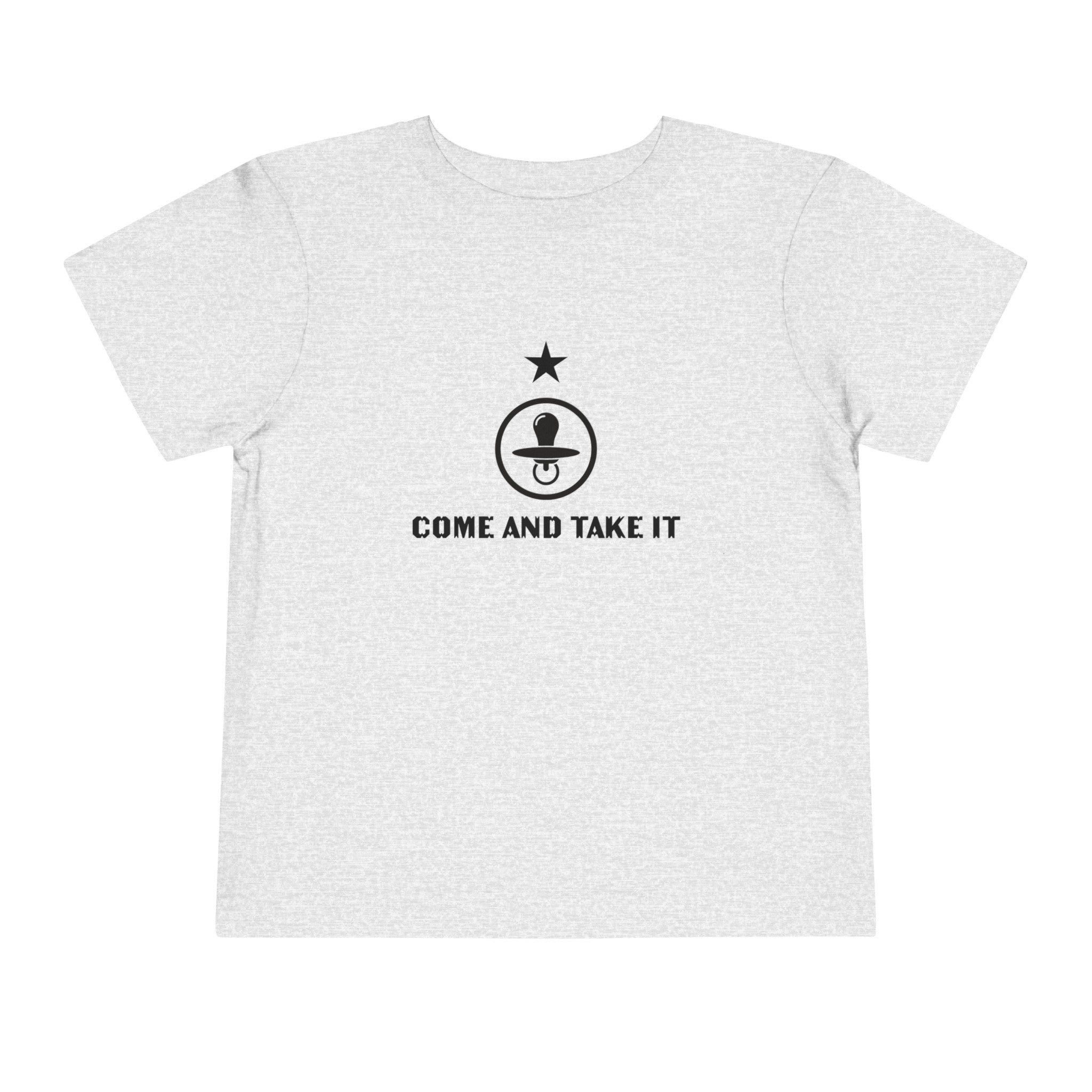 Boost your toddler's style with our playful "Come & Take It" pacifier t-shirt. This delightful tee is made from the softest Bella Canvas materials, featuring 100% Airlume combed and ring-spun cotton jersey in solid colors, designed for ultimate comfort and ease of movement. Heather variants blend 52% cotton with 48% polyester, and the Athletic Heather option combines 90% cotton with 10% polyester, ensuring both durability and softness.