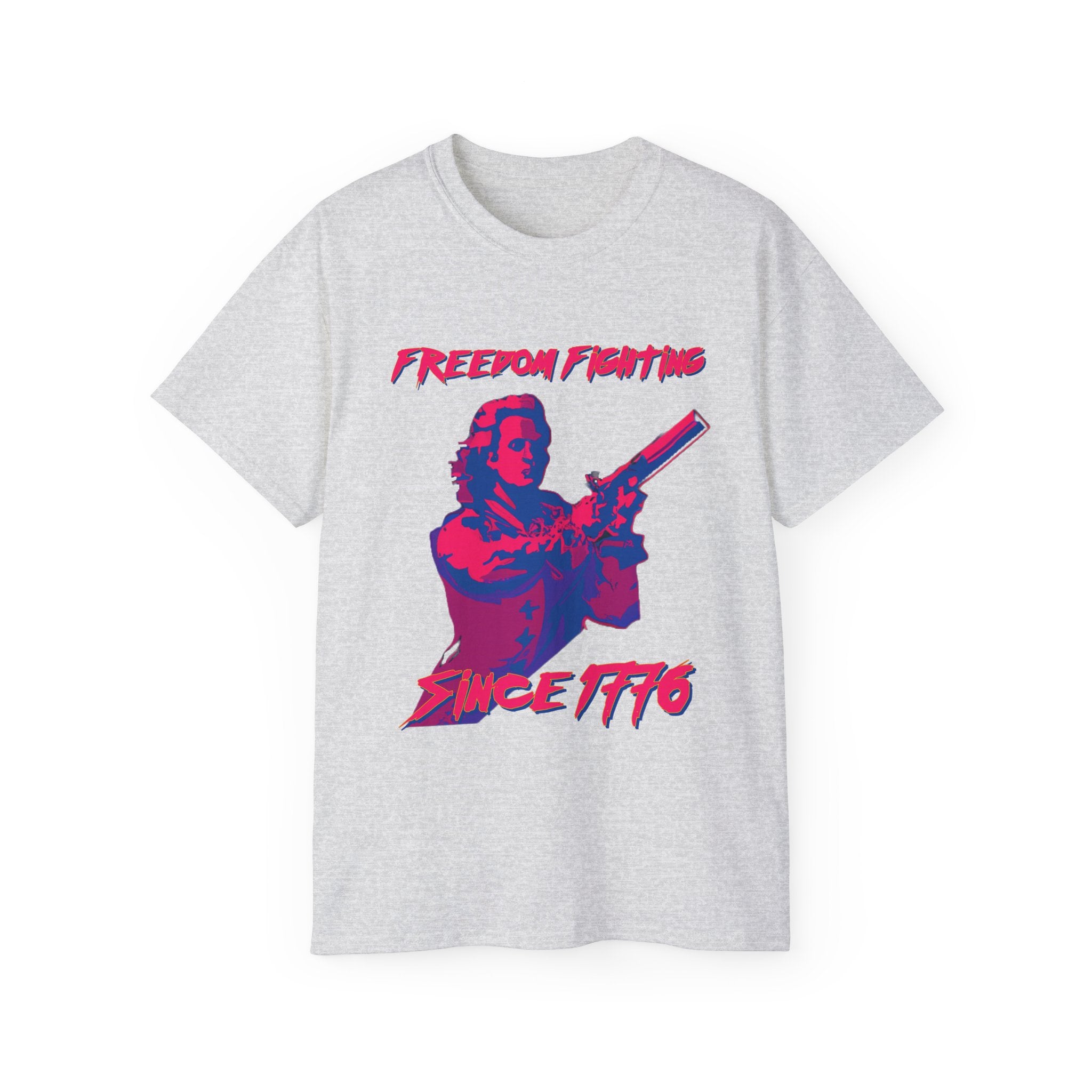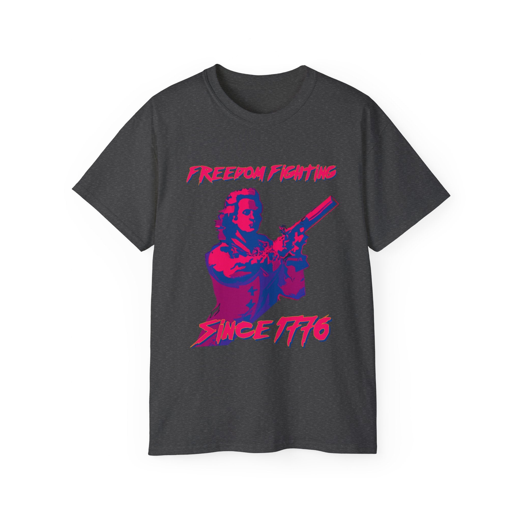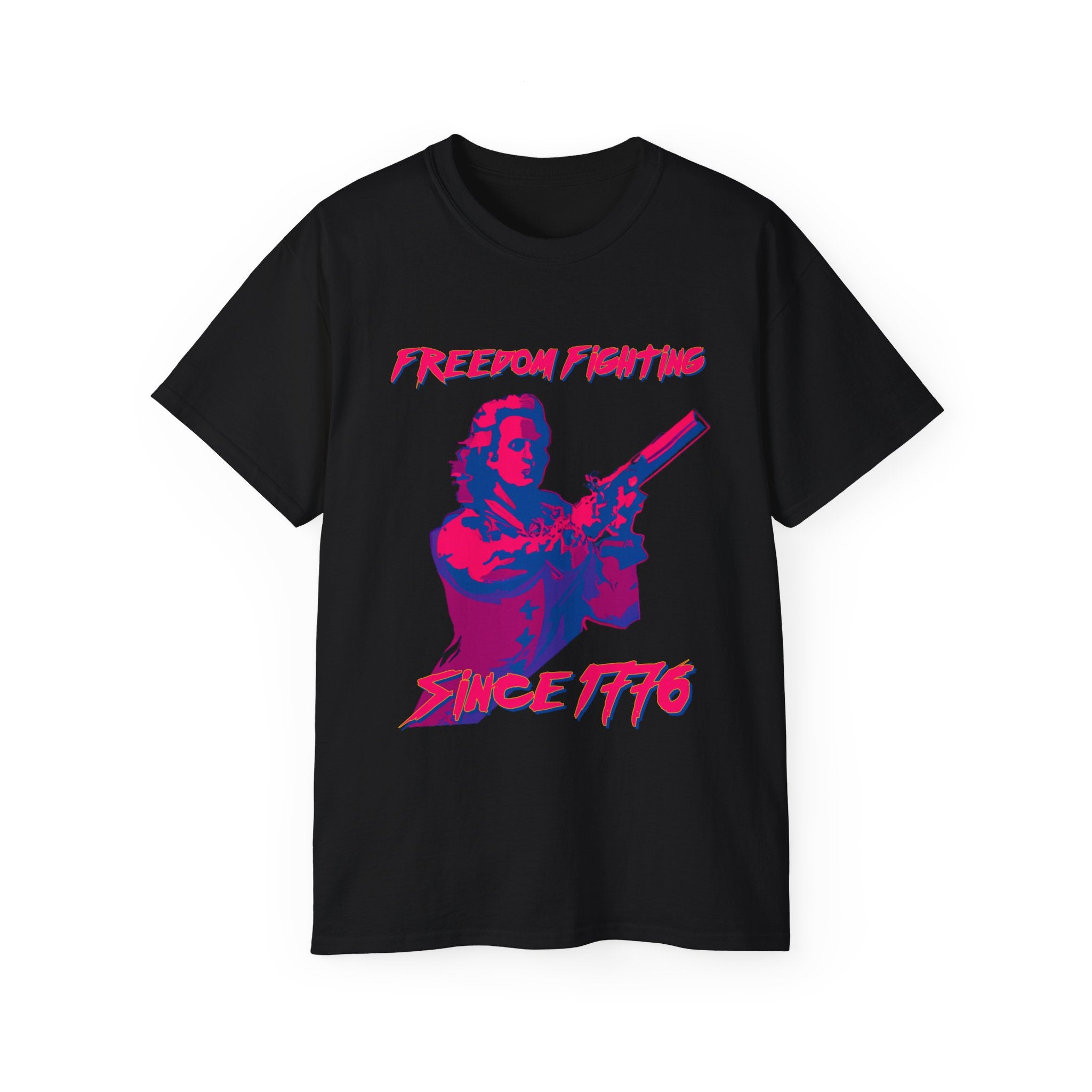 You're an old school freedom fighter in the tradition of the Founding Fathers. This synthwave styled tee is a modern take on an old school philosophy of liberty.