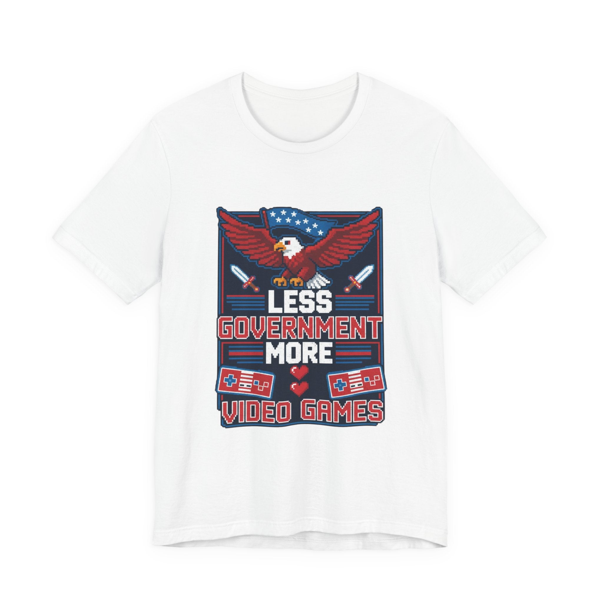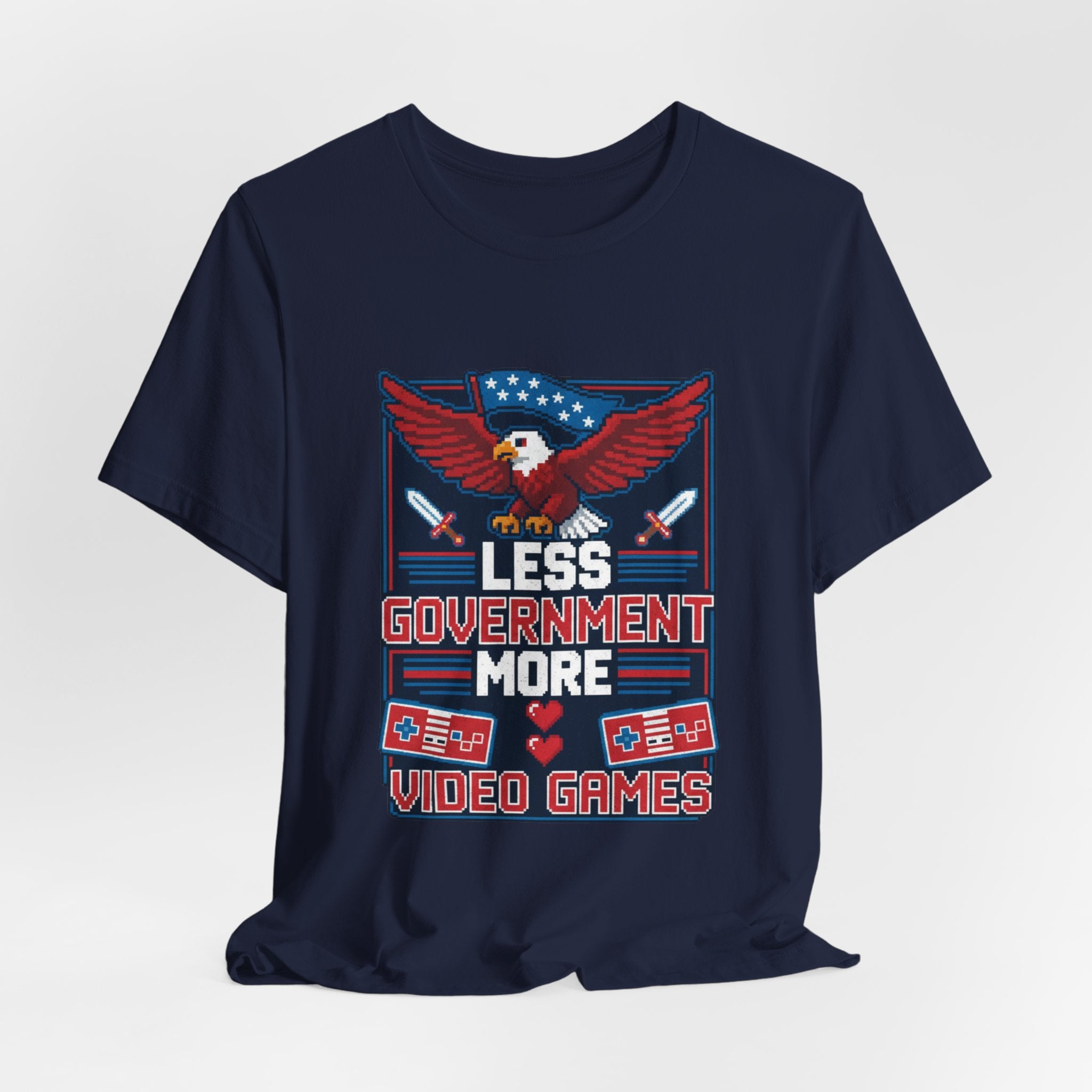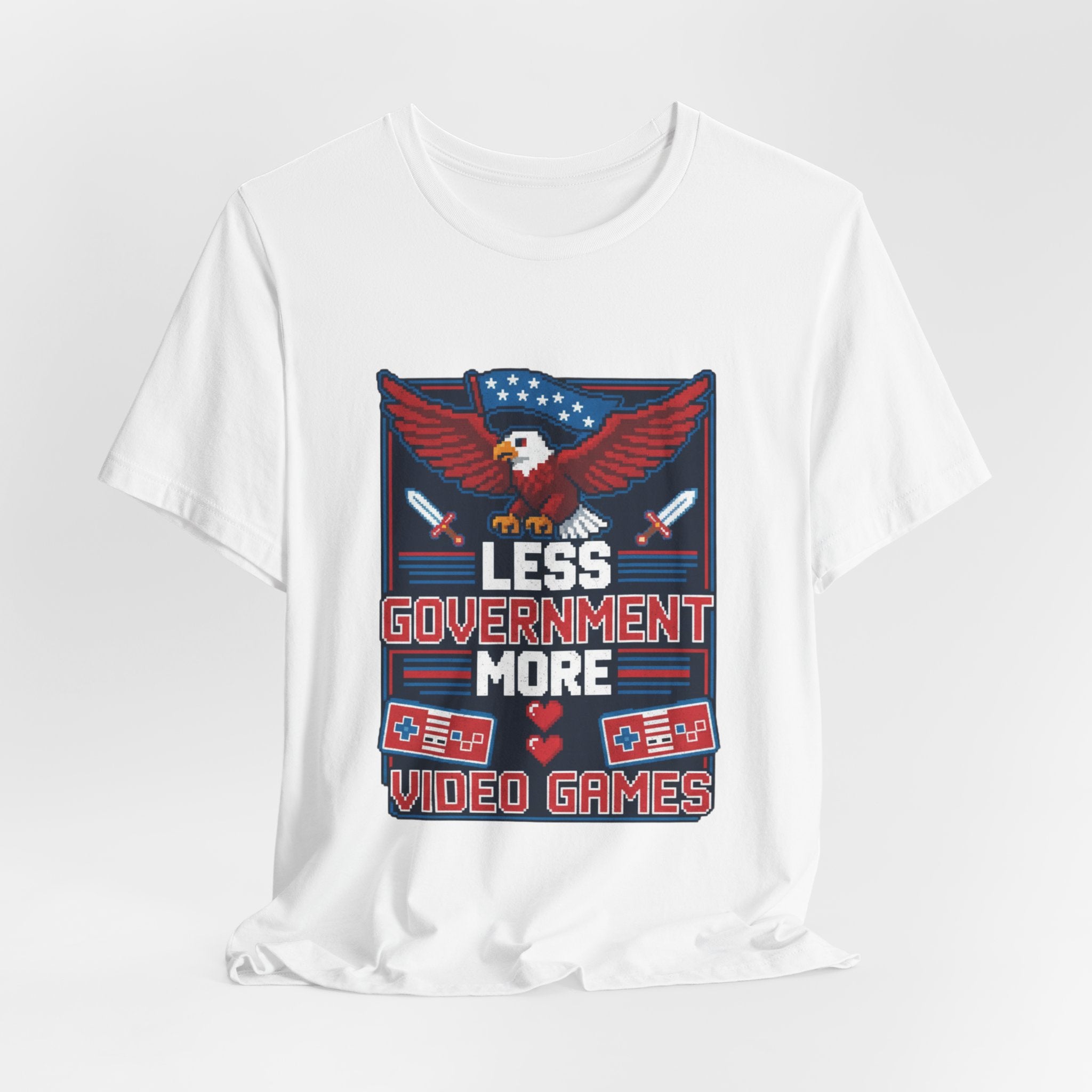 The eagle—America's symbol of freedom and strength—soars across the chest wrapped in Old Glory, representing the constitutional values that protect our liberty. The retro gaming controllers and pixel art pay homage to the golden age of arcade gaming, when games were simple, challenging, and gloriously free from microtransactions and government regulation. The message "Less Government More Video Games" captures a sentiment that resonates across generations: sometimes the best thing bureaucrats can do is leave us alone to pursue our passions.