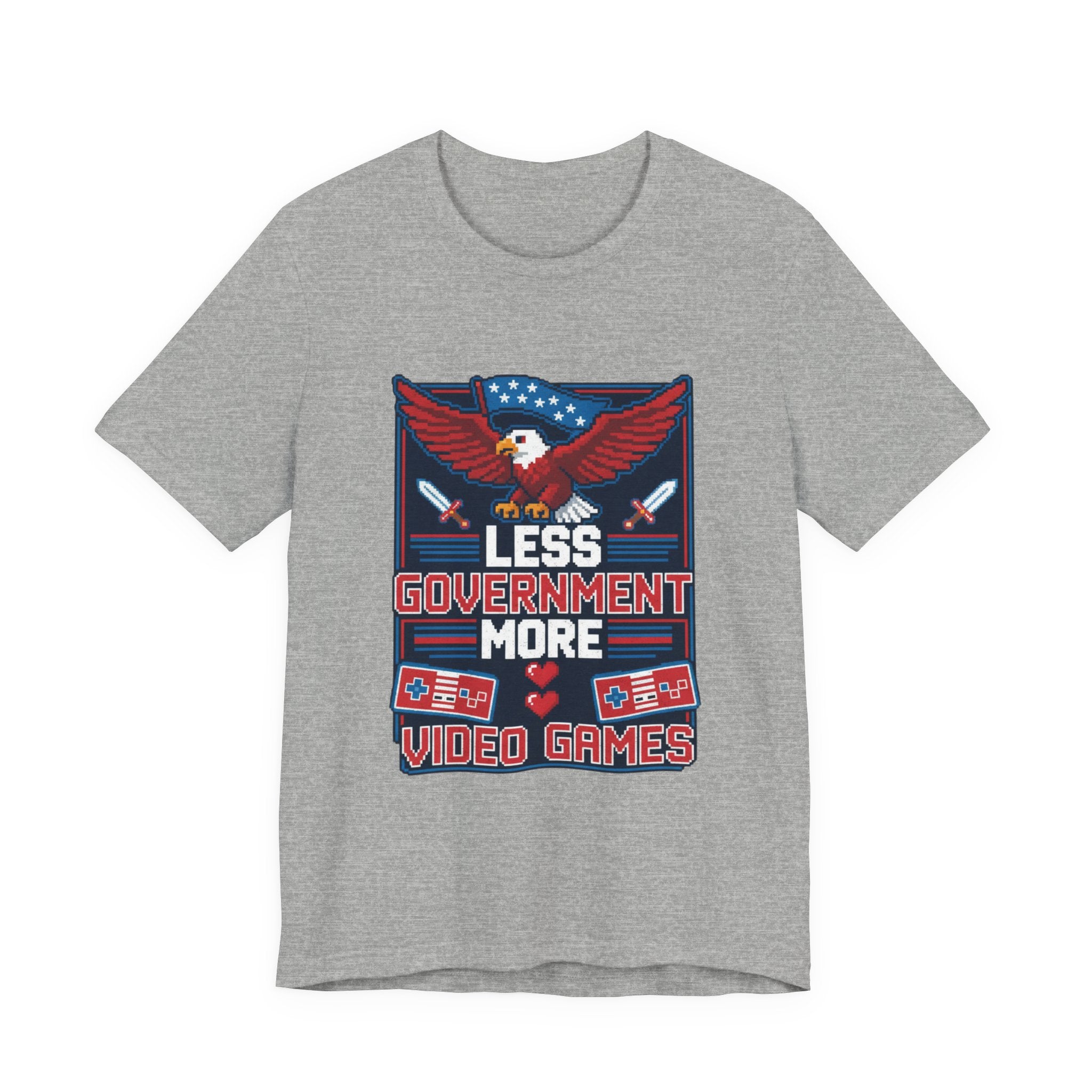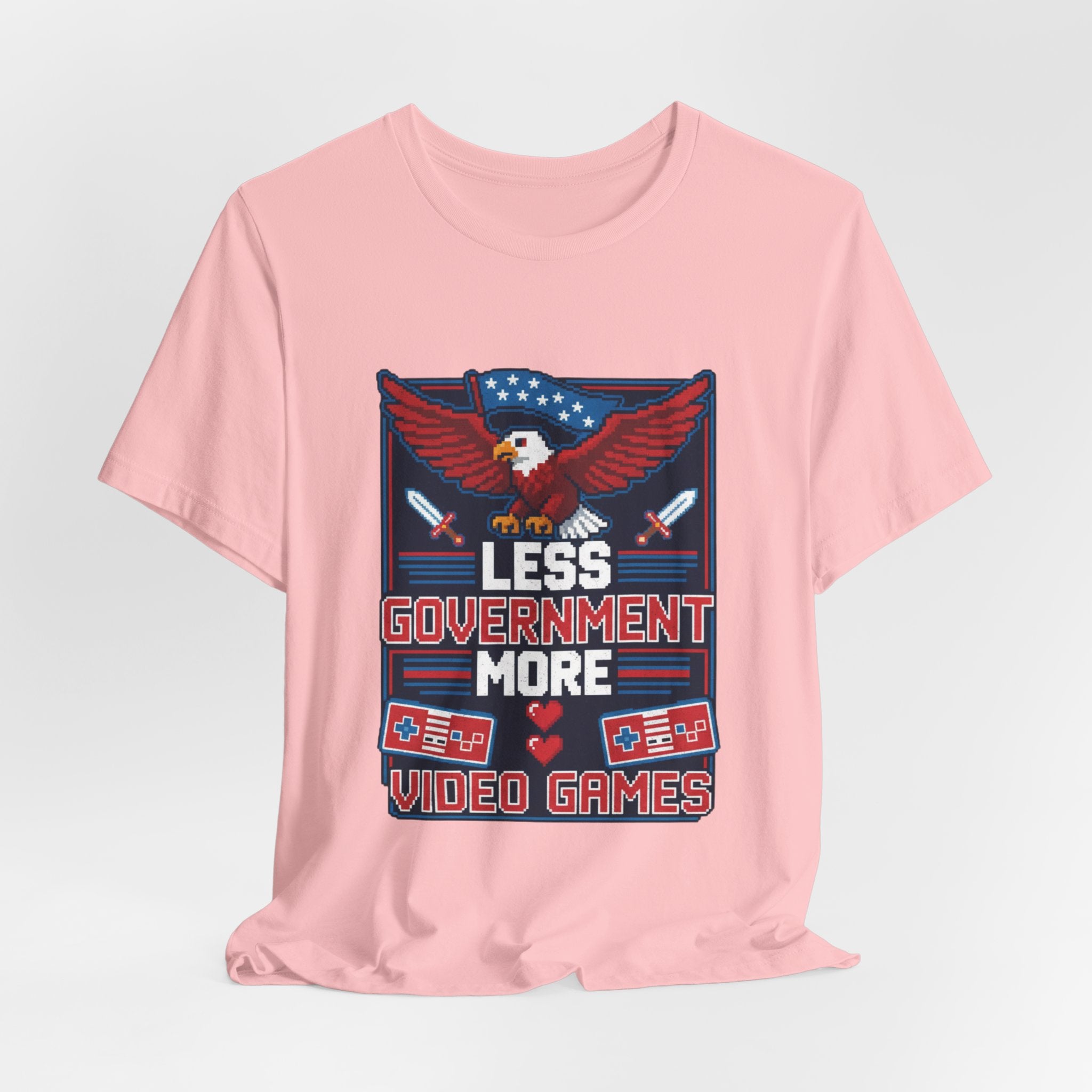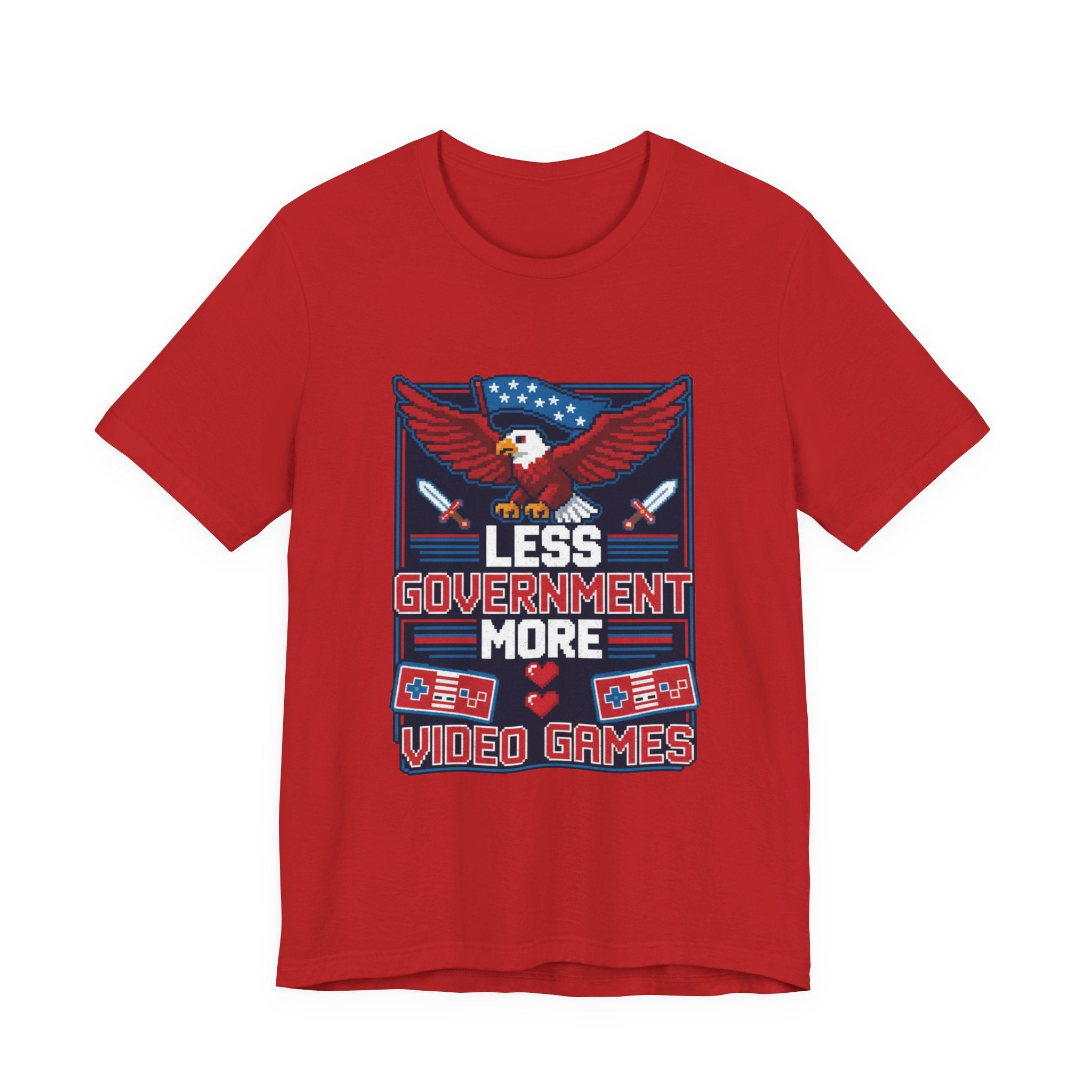 The eagle—America's symbol of freedom and strength—soars across the chest wrapped in Old Glory, representing the constitutional values that protect our liberty. The retro gaming controllers and pixel art pay homage to the golden age of arcade gaming, when games were simple, challenging, and gloriously free from microtransactions and government regulation. The message "Less Government More Video Games" captures a sentiment that resonates across generations: sometimes the best thing bureaucrats can do is leave us alone to pursue our passions.