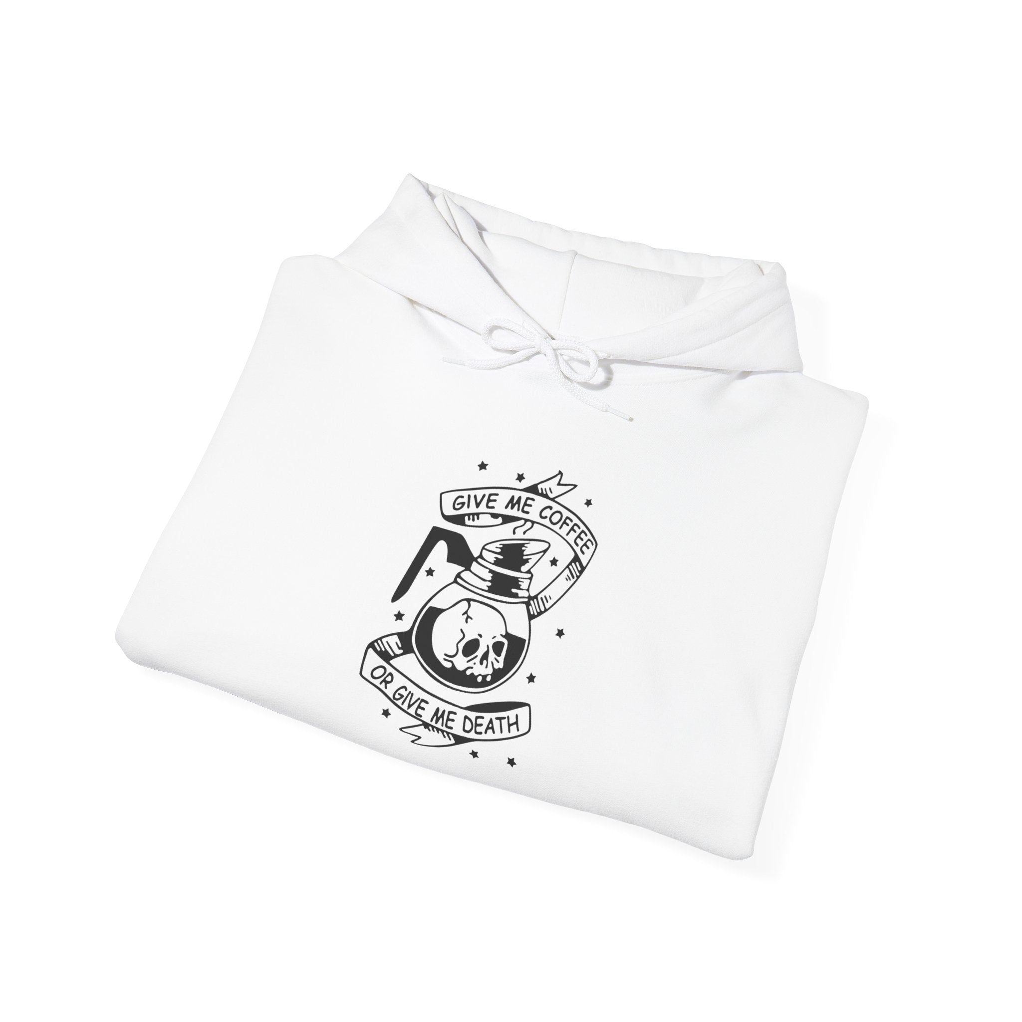 This cozy hoodie is made for people who run on caffeine and attitude. The bold black-and-white artwork features a steaming coffee pot and skull with the rallying cry Give Me Coffee or Give Me Death. It hits instantly with every coffee addict who understands that the first cup is non-negotiable. The design has a hand-drawn, vintage look that keeps it stylish without being loud. The soft midweight fabric makes it perfect for grey mornings, late-night brewing sessions, or coffee shop hangs. Slip your hands into the roomy kangaroo pocket, pull the color-matched drawcord when the breeze picks up, and enjoy a classic fit that feels warm, grounded, and ready for another cup. With clean stitching and multiple color options, it layers easily with denim or flannel and fits right into every caffeine lover’s daily rotation.