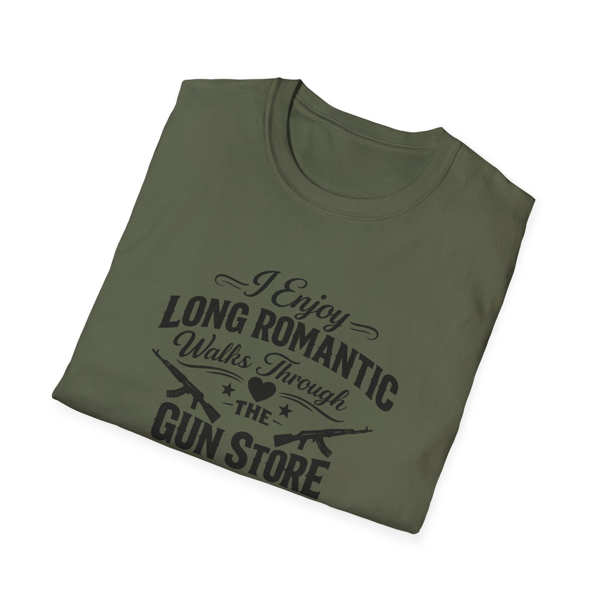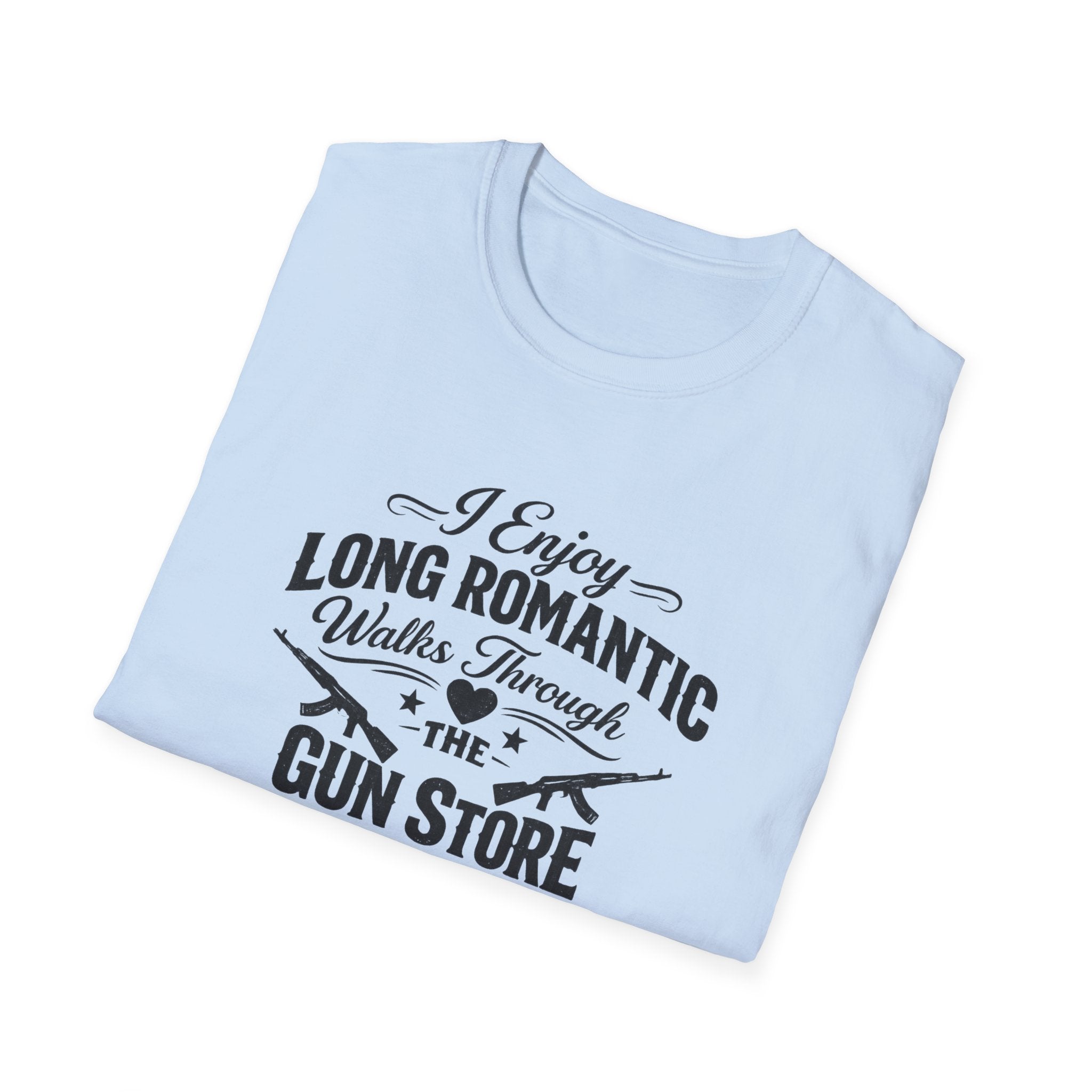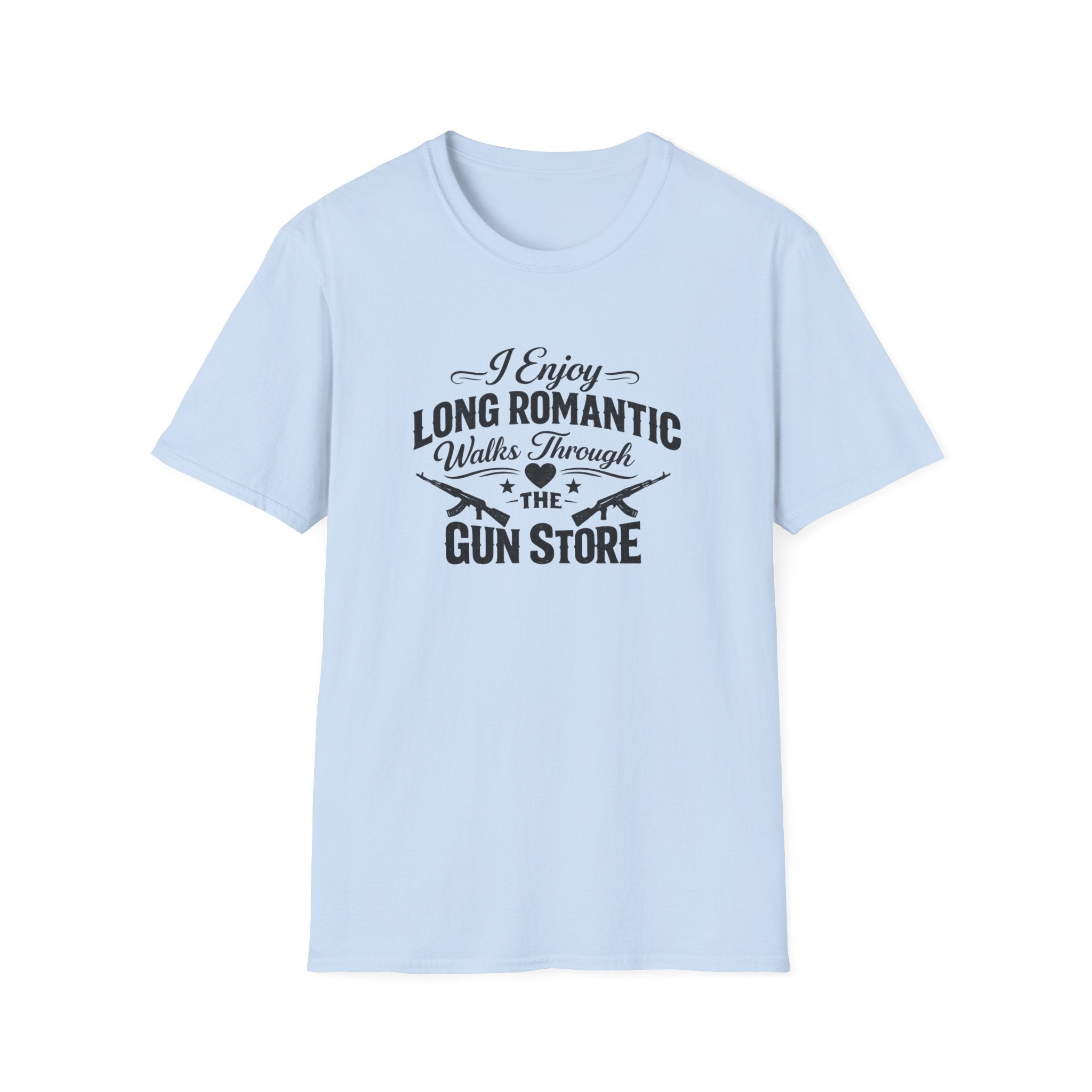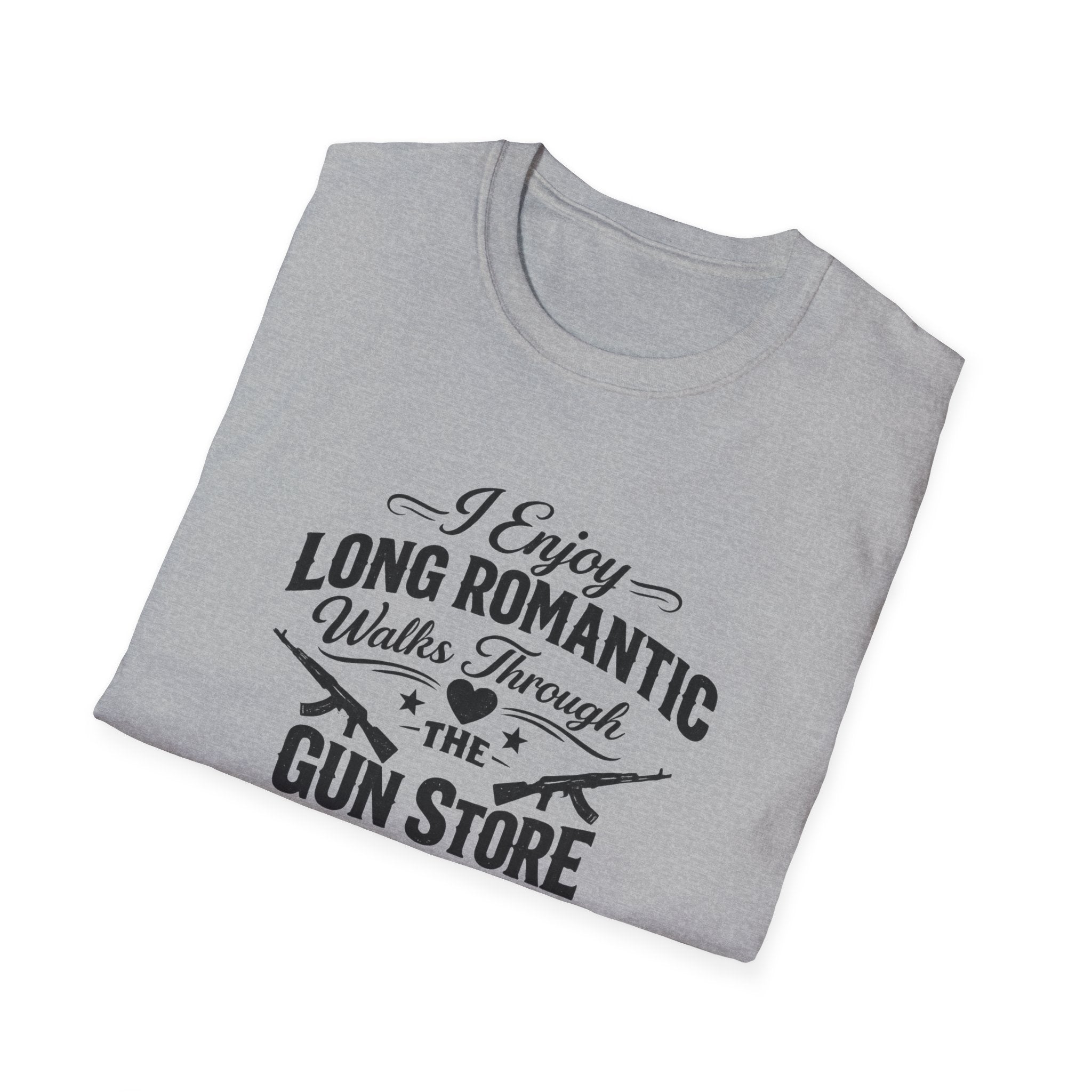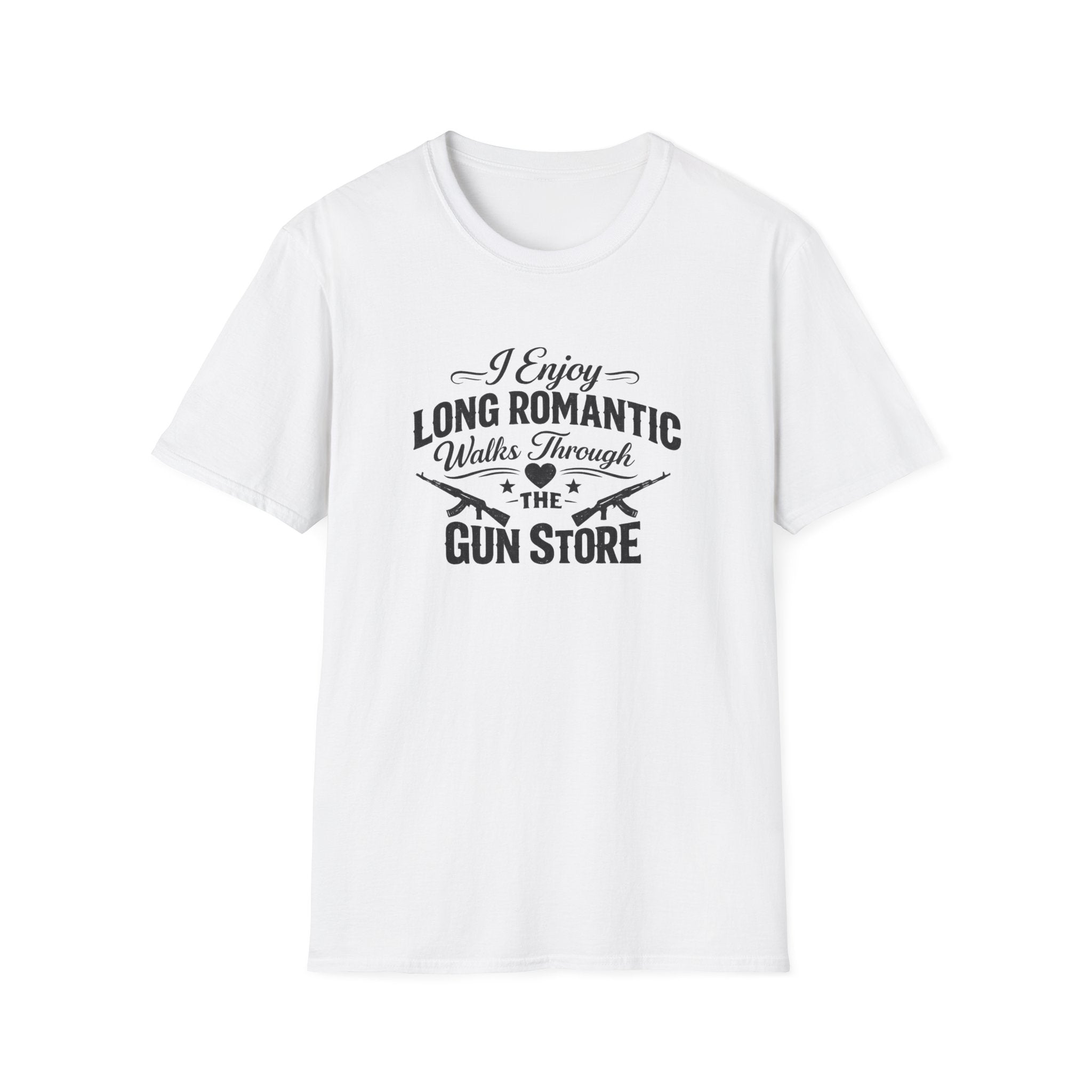This premium cotton tee captures that beautiful sentiment with bold, vintage-style lettering that reads "I Enjoy Long Romantic Walks Through the Gun Store." It's the perfect conversation starter for range days, gun shows, or casual Fridays when you want your coworkers to know exactly where your heart lies. The soft ring-spun cotton feels like a well-worn favorite from day one, while the clean crew neck and classic fit keep things timeless. Whether you're actually browsing holsters with your significant other or just daydreaming about your next firearm purchase, this shirt speaks your love language fluently.