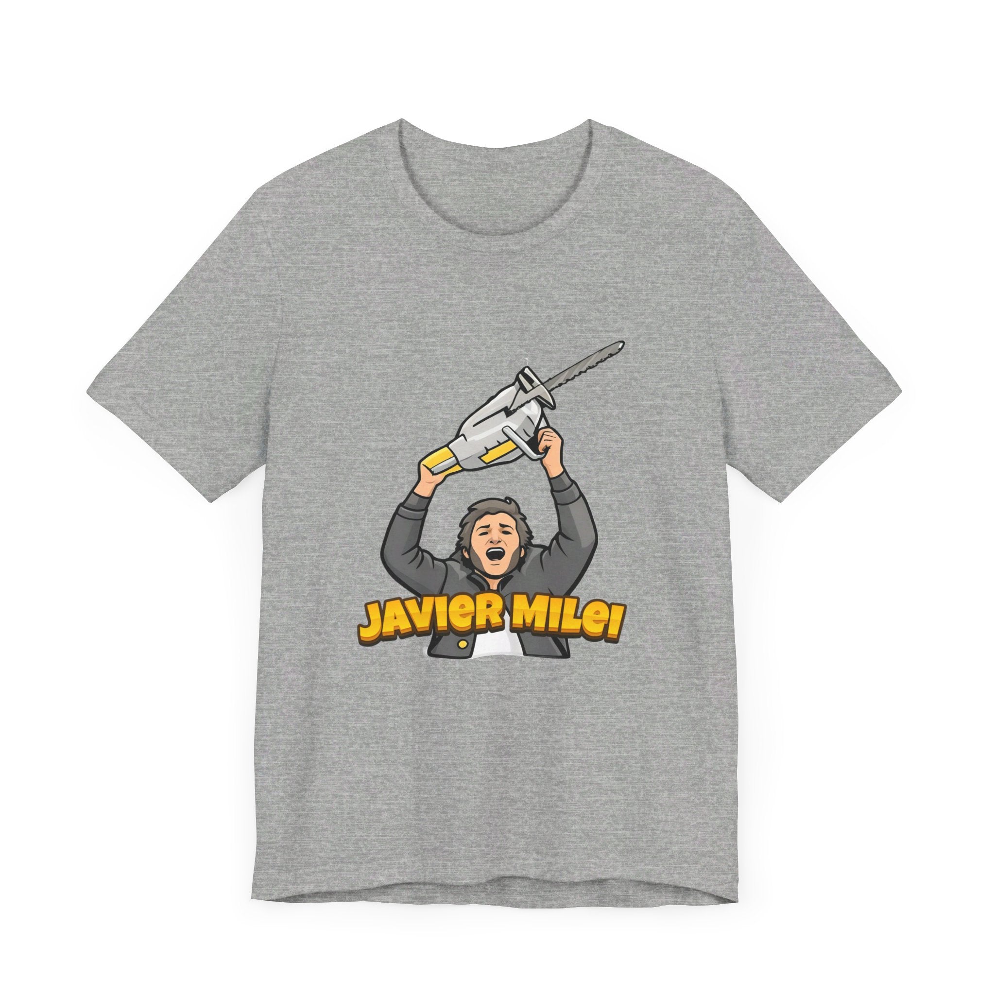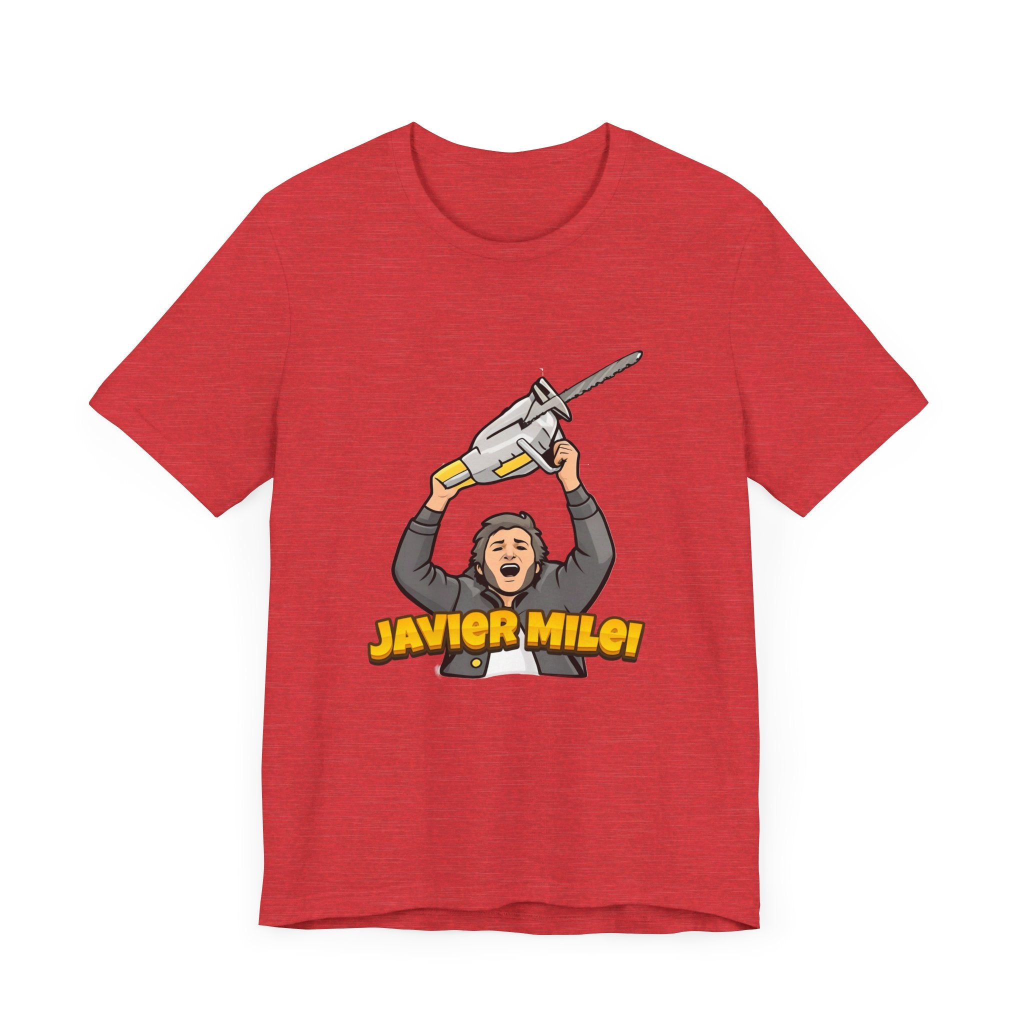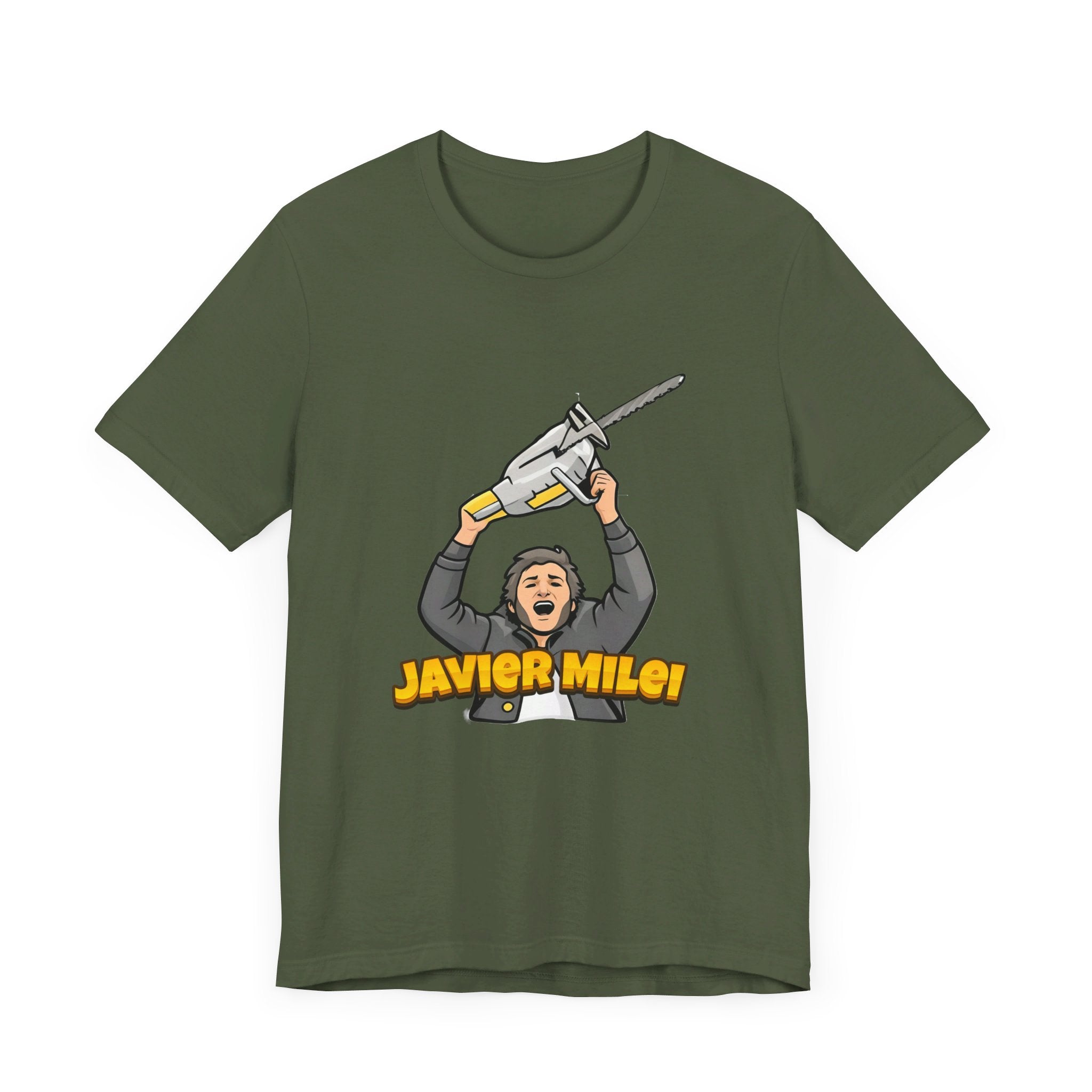 Make a bold statement with this striking t-shirt featuring Argentina's fearless libertarian president, Javier Milei, wielding his legendary chainsaw! Known for cutting through government waste and fighting for freedom, Milei's energy is captured in this powerful design. The vibrant graphic on a comfortable, high-quality tee makes it perfect for any occasion—whether you're at a rally, hanging out with friends, or just showing off your love for liberty. Wear it proudly and let everyone know you're ready to join the revolution for freedom and individual rights!