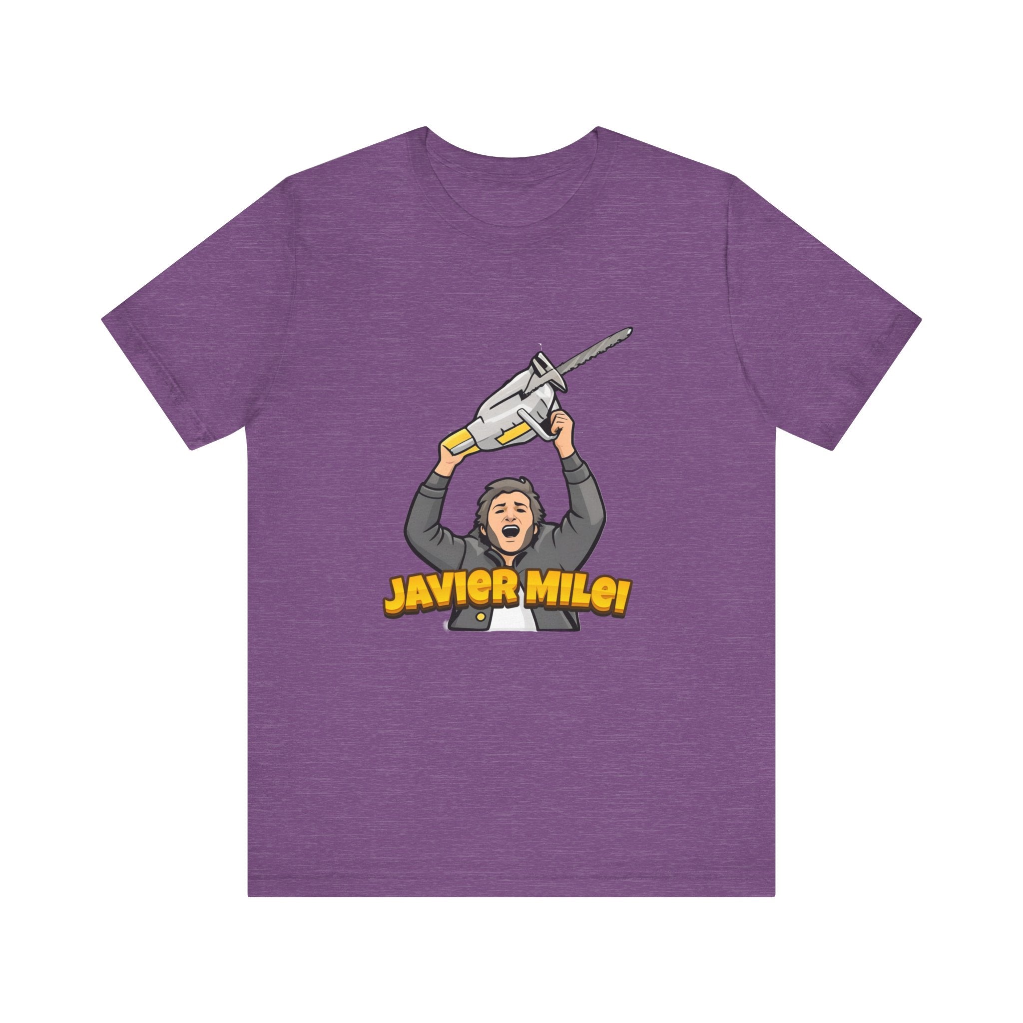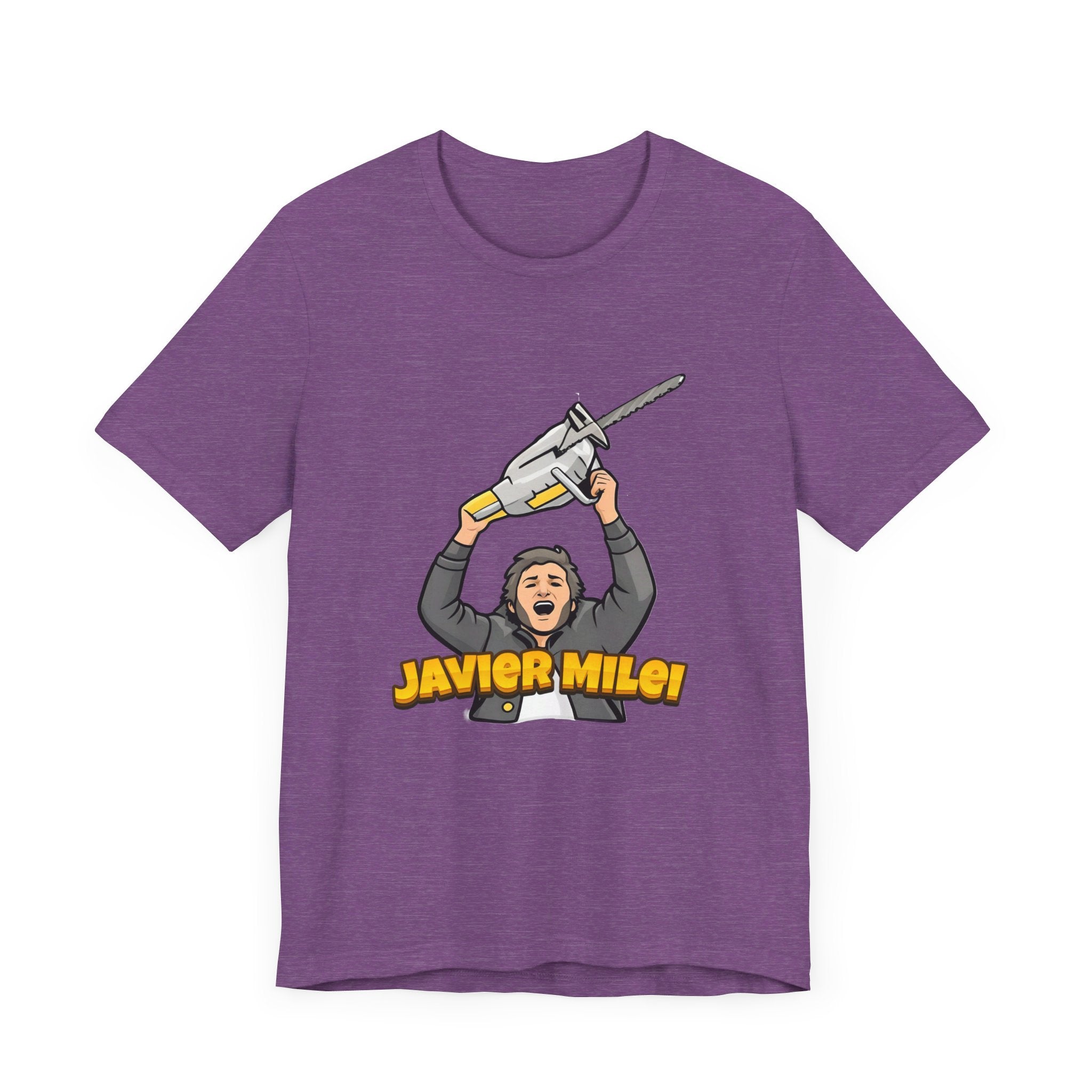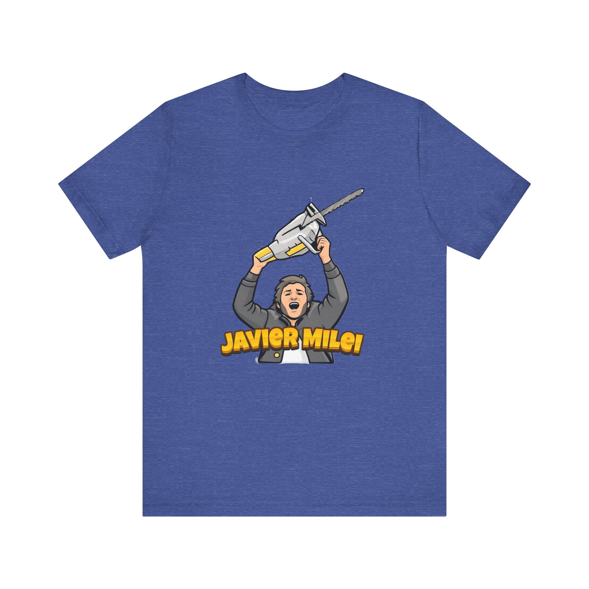 Make a bold statement with this striking t-shirt featuring Argentina's fearless libertarian president, Javier Milei, wielding his legendary chainsaw! Known for cutting through government waste and fighting for freedom, Milei's energy is captured in this powerful design. The vibrant graphic on a comfortable, high-quality tee makes it perfect for any occasion—whether you're at a rally, hanging out with friends, or just showing off your love for liberty. Wear it proudly and let everyone know you're ready to join the revolution for freedom and individual rights!