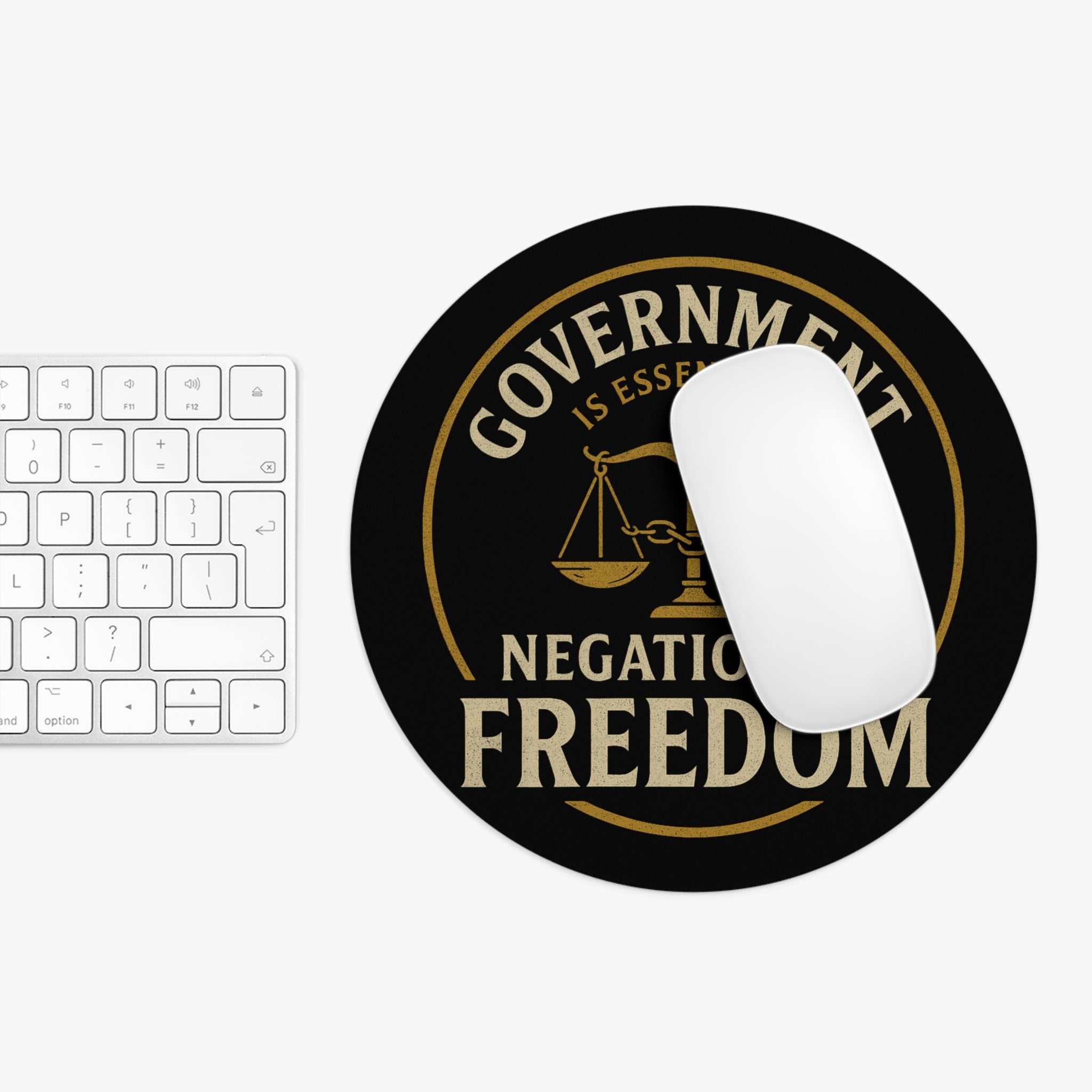 Bring liberty to your desk with this bold mouse pad featuring Judge Andrew Napolitano’s striking reminder: “Government is essentially negation of freedom.” Printed in vibrant, long-lasting detail, the chained scales of justice design turns an everyday accessory into a statement piece.