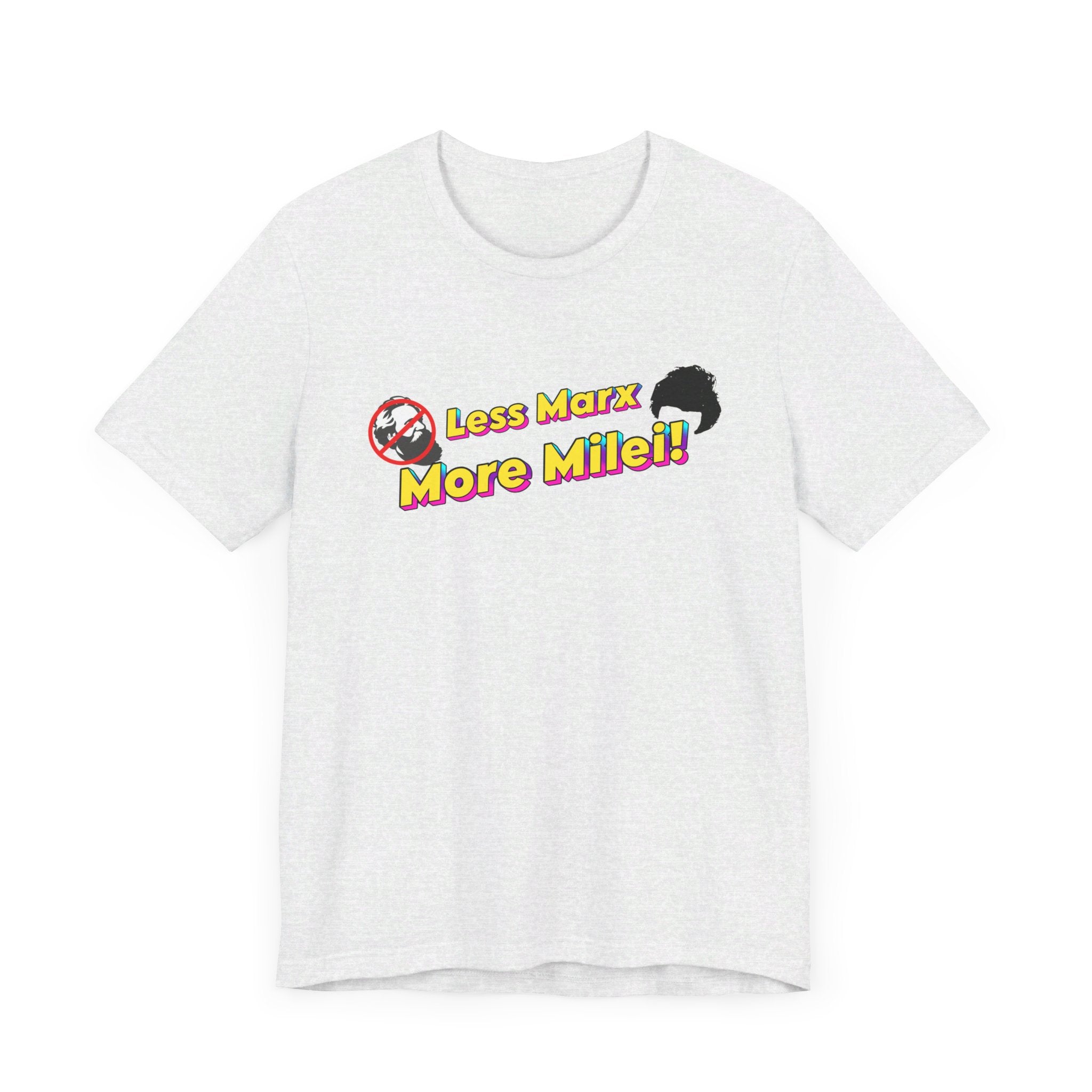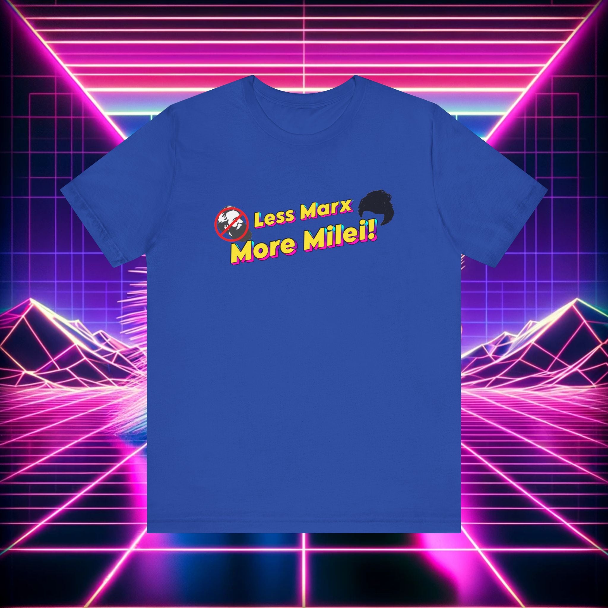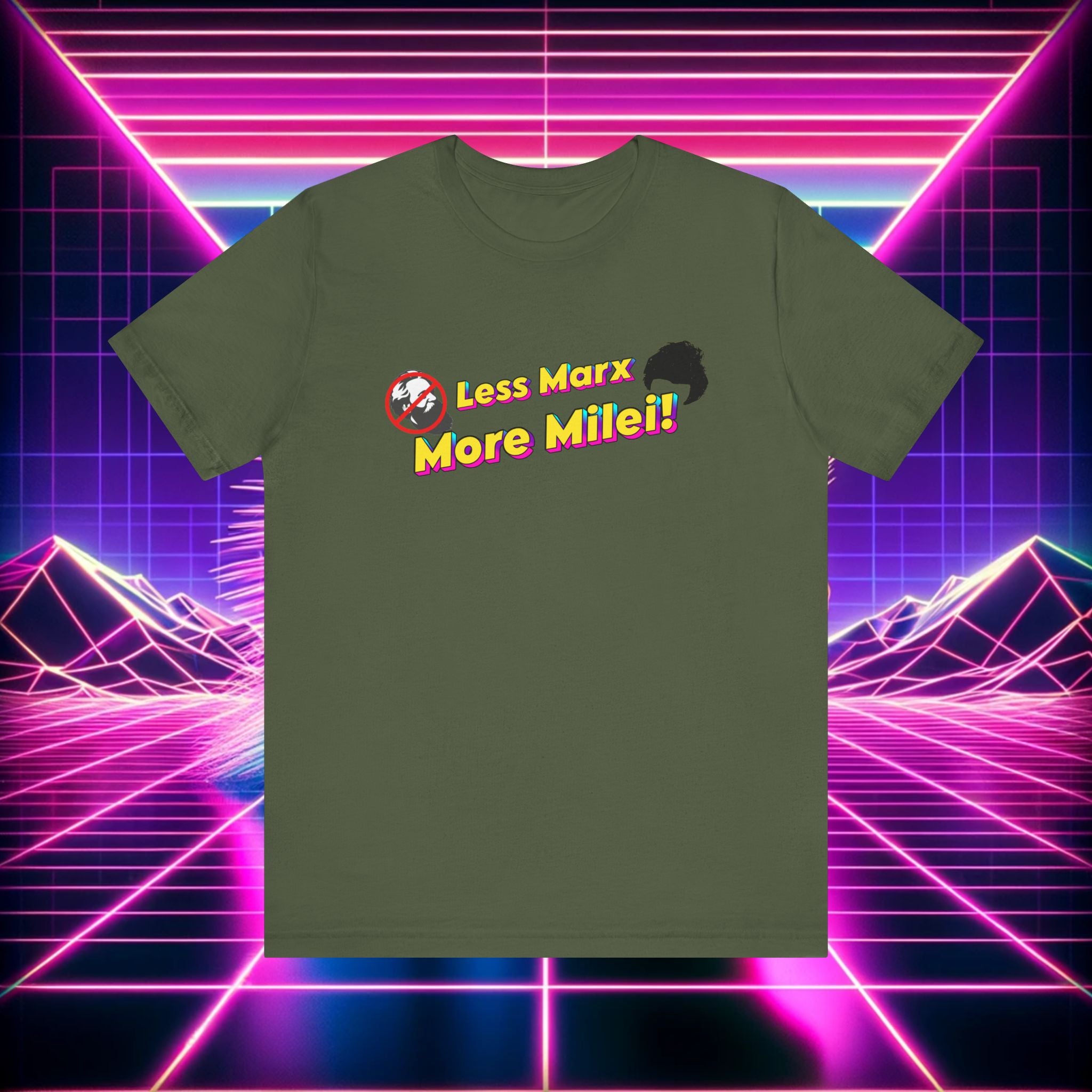Show the world you stand for liberty, free markets, and a touch of humor with the "Less Marx, More Milei!" tee. Grab yours today and wear your ideology with pride!