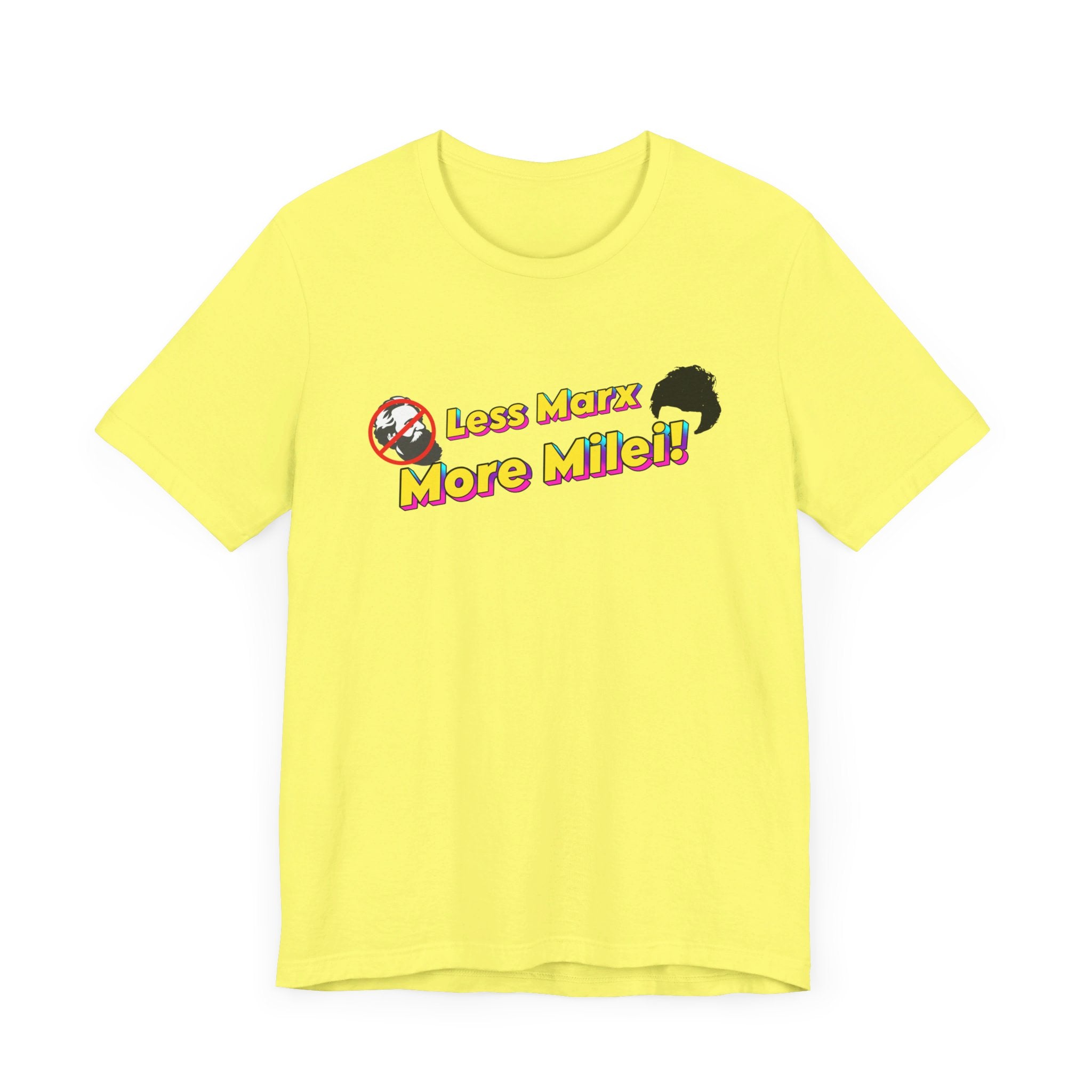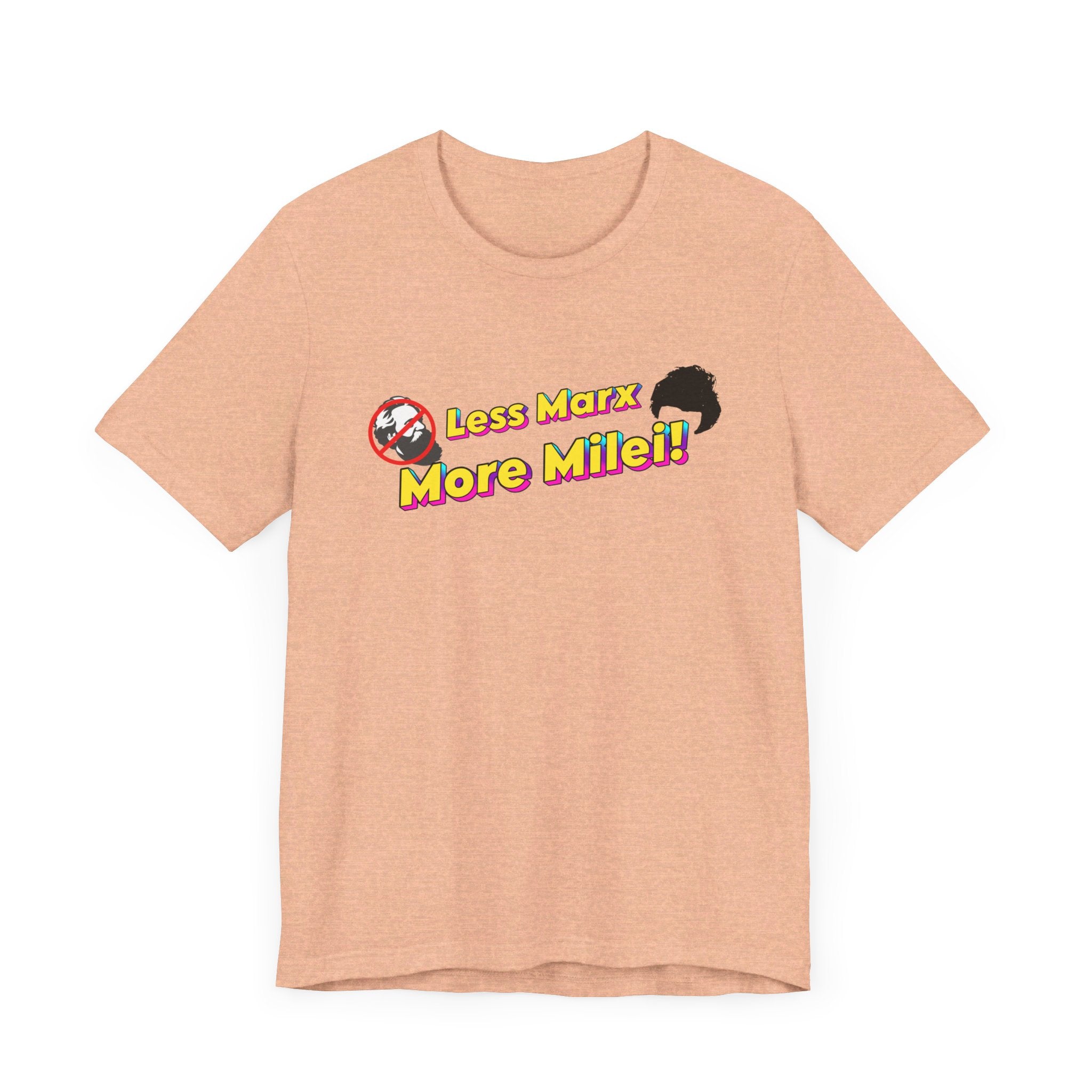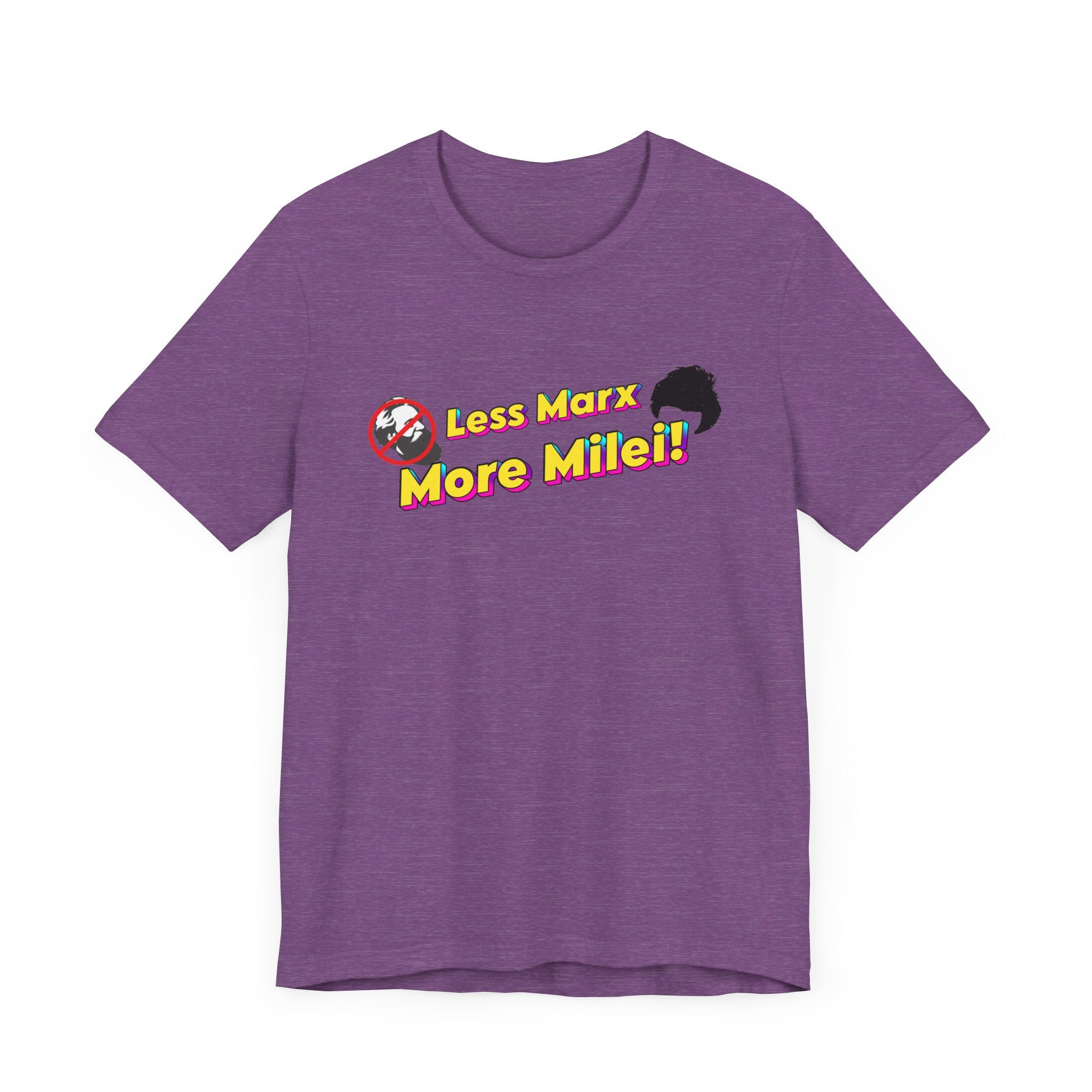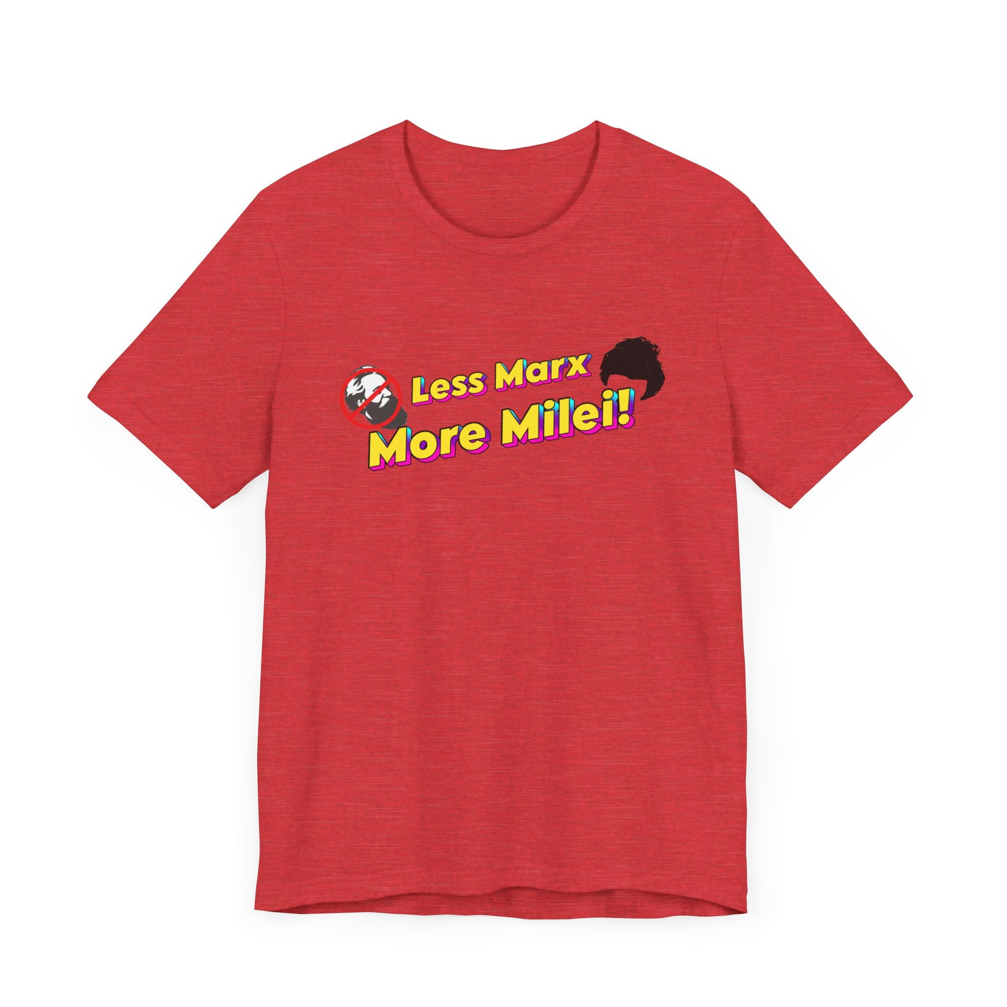 Show the world you stand for liberty, free markets, and a touch of humor with the "Less Marx, More Milei!" tee. Grab yours today and wear your ideology with pride!
