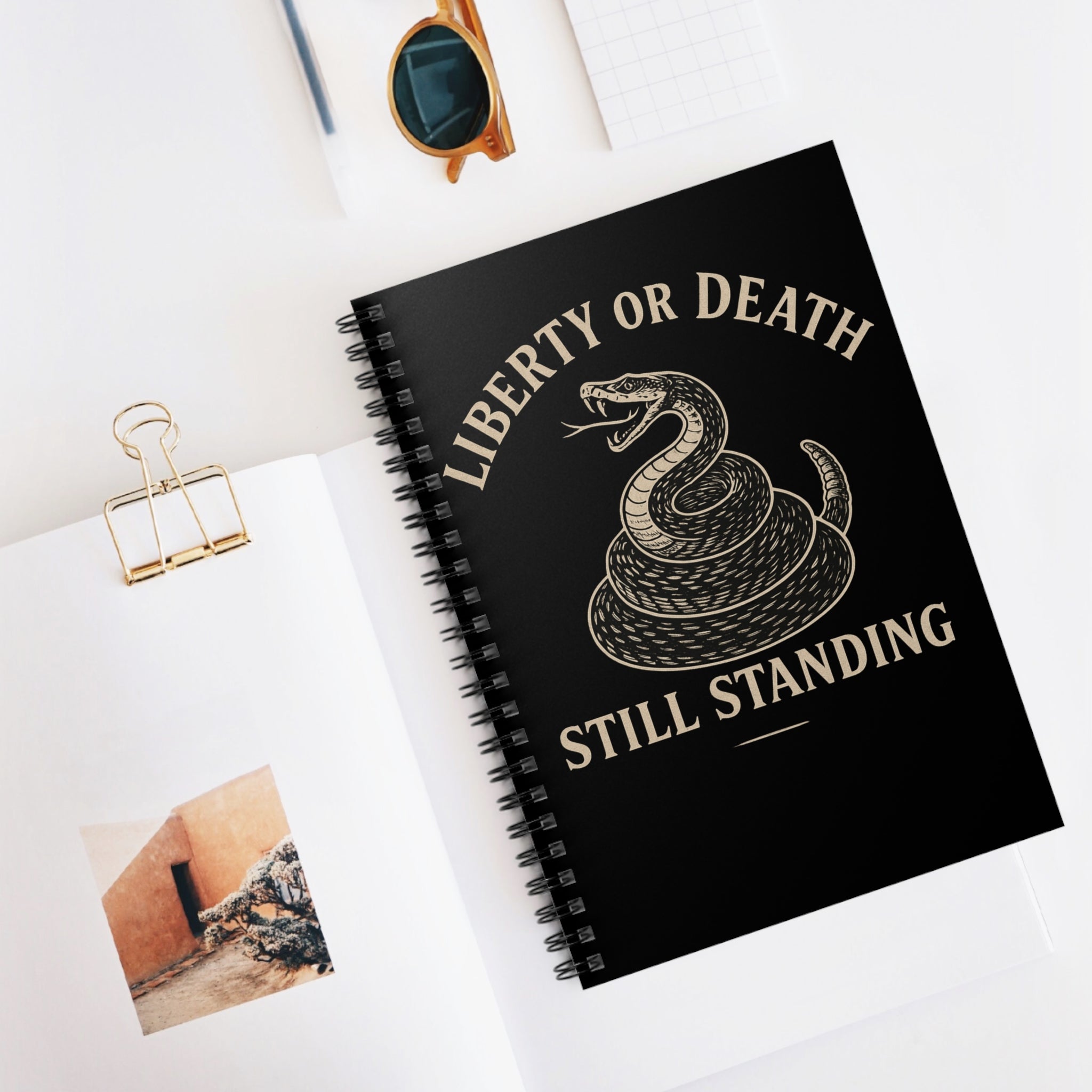 This compact 6 x 8 lined spiral notebook carries a proud, defiant spirit. The matte black cover showcases a vintage hand-drawn rattlesnake coiled and ready under the bold words “LIBERTY OR DEATH” and “STILL STANDING.” The distressed illustration nods to America’s earliest symbols of resolve and freedom. It is perfect for anyone who values independence, personal grit, and gear that quietly reminds the world that some principles never bend.