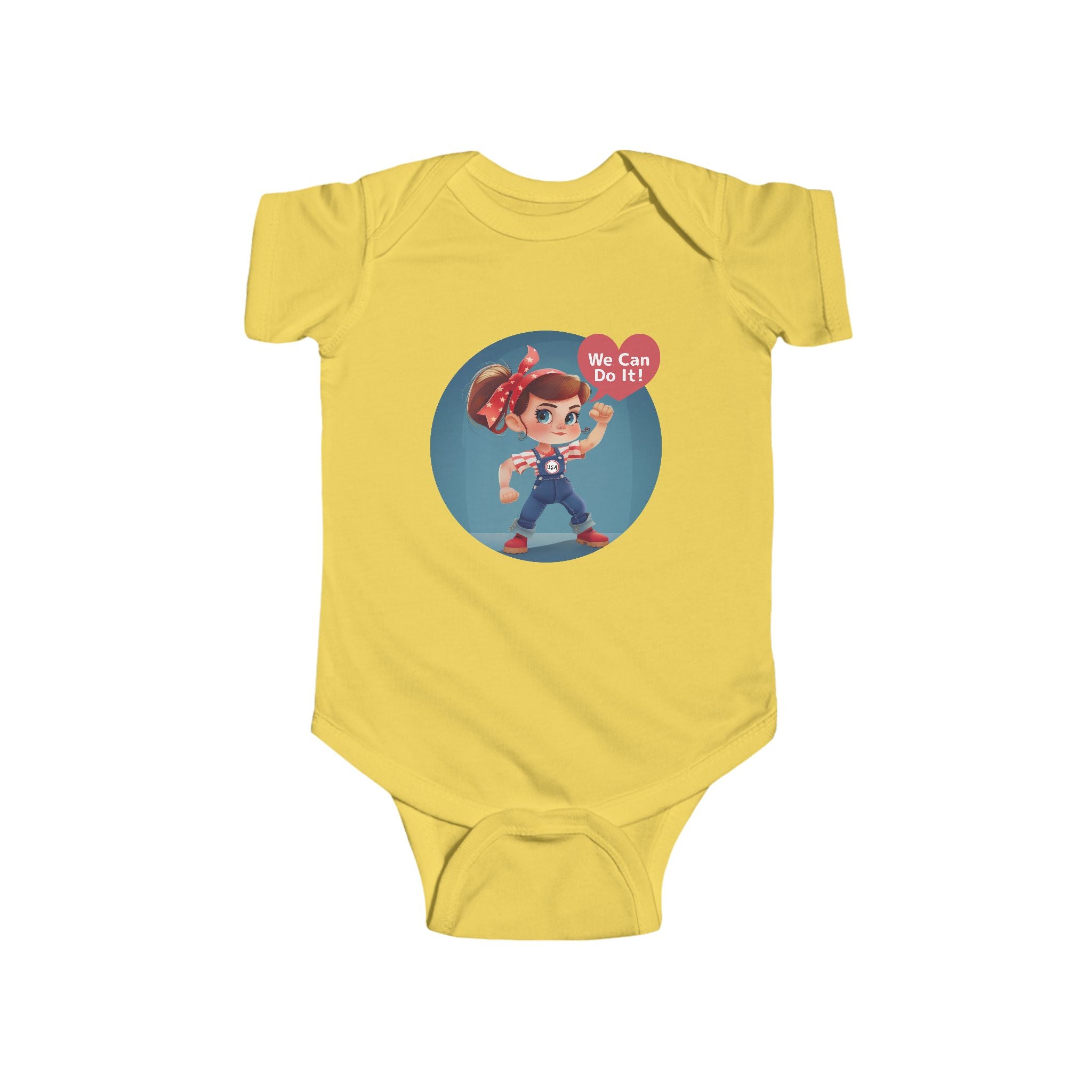 Inspire your little one with our "We Can Do It!" infant bodysuit, featuring an adorable baby Rosie The Riveter. Made from 100% combed ringspun cotton for solid colors (with polyester included in heather colors), this bodysuit is soft yet durable. The lightweight fabric of 4.5 oz/yd² (153 g/m²) is gentle on baby’s skin but built to last. Side seams and ribbed knit bindings enhance durability, while plastic snaps at the cross closure make for easy changing. A tear-away label ensures added comfort by removing irritation. Perfect for everyday wear, this bodysuit combines historical charm with practicality, making it a delightful choice for your infant’s wardrobe.