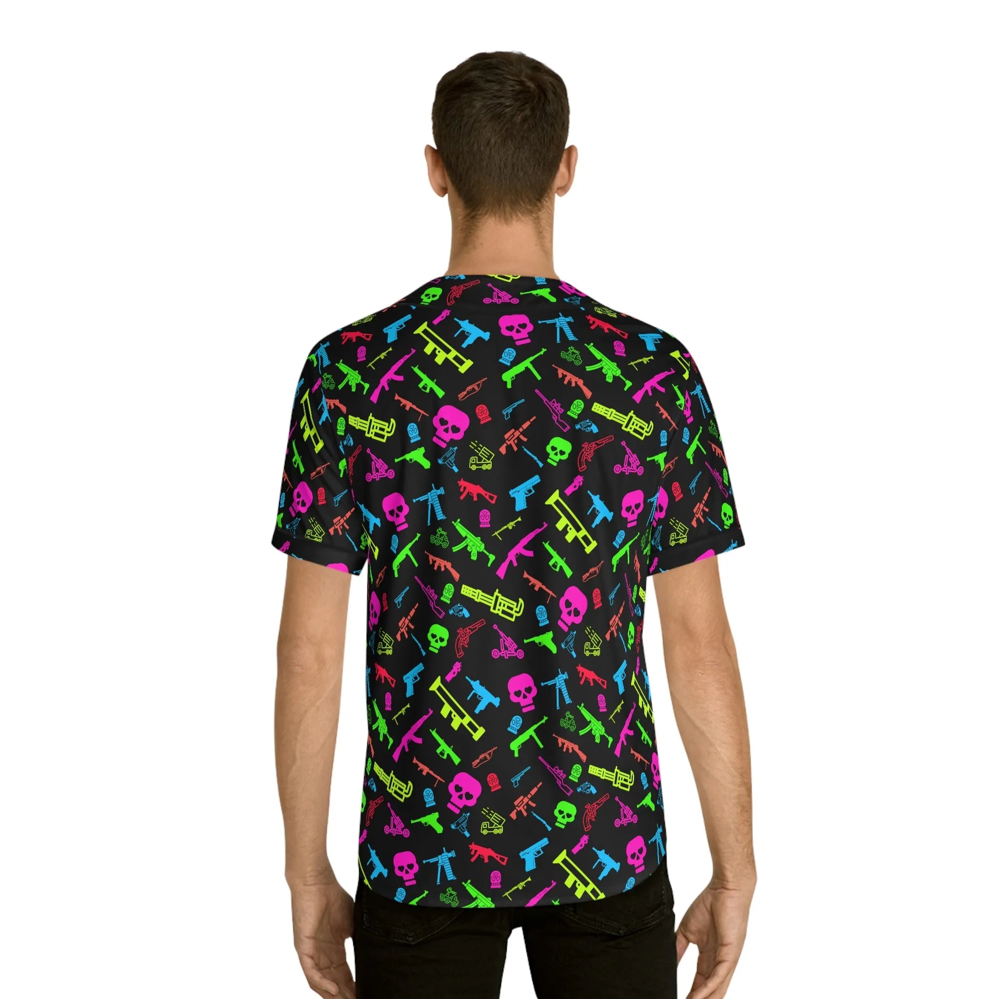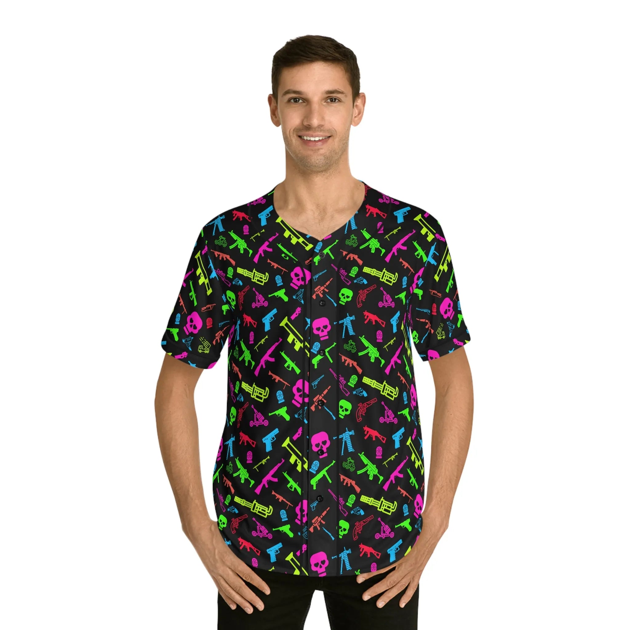 Step up to the plate in style with the Retro Neon Firearms All Over Printed Baseball Jersey - the perfect way to show off your love for firearms and freedom on and off the field!